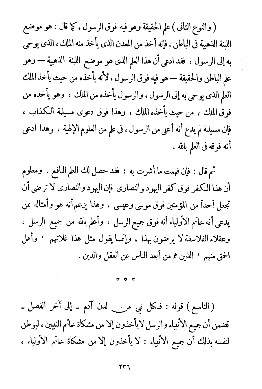 (وَالنَّوْعُ الثَّانِي) عِلْمُ الْحَقِيقَةِ وَهُوَ فِيهِ فَوْقَ الرَّسُولِ كَمَا قَالَ: هُوَ مَوْضِعُ اللَّبِنَةِ الذَّهَبِيَّةِ فِي الْبَاطِنِ فَإِنَّهُ أَخَذَ مِنْ الْمَعْدِنِ الَّذِي يَأْخُذُ مِنْهُ الْمَلَكُ الَّذِي يُوحِي بِهِ إلَى الرَّسُولِ فَقَدْ ادَّعَى أَنَّ هَذَا الْعِلْمَ الَّذِي هُوَ مَوْضِعُ اللَّبِنَةِ الذَّهَبِيَّةِ - وَهُوَ عِلْمُ الْبَاطِنِ وَالْحَقِيقَةِ - هُوَ فِيهِ فَوْقَ الرَّسُولِ لِأَنَّهُ يَأْخُذُهُ مِنْ حَيْثُ يَأْخُذُ الْمَلَكُ الْعِلْمَ الَّذِي يُوحِي بِهِ إلَى الرَّسُولِ وَالرَّسُولُ يَأْخُذُهُ مِنْ الْمَلَكِ وَهُوَ يَأْخُذُهُ مِنْ فَوْقِ الْمَلَكِ مِنْ حَيْثُ يَأْخُذُهُ الْمَلَكُ وَهَذَا فَوْقَ دَعْوَى مُسَيْلِمَةَ الْكَذَّابِ فَإِنَّ مُسَيْلِمَةَ لَمْ يَدَّعِ أَنَّهُ أَعْلَى مِنْ الرَّسُولِ فِي عِلْمٍ مِنْ الْعُلُومِ الْإِلَهِيَّةِ وَهَذَا ادَّعَى أَنَّهُ فَوْقَهُ فِي الْعِلْمِ بِاَللَّهِ. ثُمَّ قَالَ: فَإِنْ فَهِمْت مَا أَشَرْت بِهِ: فَقَدْ حَصَلَ لَك الْعِلْمُ النَّافِعُ. وَمَعْلُومٌ أَنَّ هَذَا الْكُفْرَ فَوْقَ كُفْرِ الْيَهُودِ وَالنَّصَارَى فَإِنَّ الْيَهُودَ وَالنَّصَارَى لَا تَرْضَى أَنْ تَجْعَلَ أَحَدًا مِنْ الْمُؤْمِنِينَ فَوْقَ مُوسَى وَعِيسَى وَهَذَا يَزْعُمُ أَنَّهُ هُوَ وَأَمْثَالُهُ مِمَّنْ يَدَّعِي أَنَّهُ خَاتَمُ الْأَوْلِيَاءِ أَنَّهُ فَوْقَ جَمِيعِ الرُّسُلِ وَأَعْلَمُ بِاَللَّهِ مِنْ جَمِيعِ الرُّسُلِ وَعُقَلَاءُ الْفَلَاسِفَةِ لَا يَرْضَوْنَ بِهَذَا وَإِنَّمَا يَقُولُ مِثْلَ هَذَا غُلَاتُهُمْ وَأَهْلُ الْحُمْقِ مِنْهُمْ الَّذِينَ هُمْ مَنْ أَبْعَدِ النَّاسِ عَنْ الْعَقْلِ وَالدِّينِ. (التَّاسِعُ) قَوْلُهُ: فَكُلُّ نَبِيٍّ مِنْ لَدُنْ آدَمَ - إلَى آخِرِ الْفَصْلِ - تَضَمَّنَ أَنَّ جَمِيعَ الْأَنْبِيَاءِ وَالرُّسُلِ لَا يَأْخُذُونَ إلَّا مِنْ مِشْكَاةِ خَاتَمِ النَّبِيِّينَ لِيُوَطِّنَ لِنَفْسِهِ بِذَلِكَ أَنَّ جَمِيعَ الْأَنْبِيَاءِ: لَا يَأْخُذُونَ إلَّا مِنْ مِشْكَاةِ خَاتَمِ الْأَوْلِيَاءِ