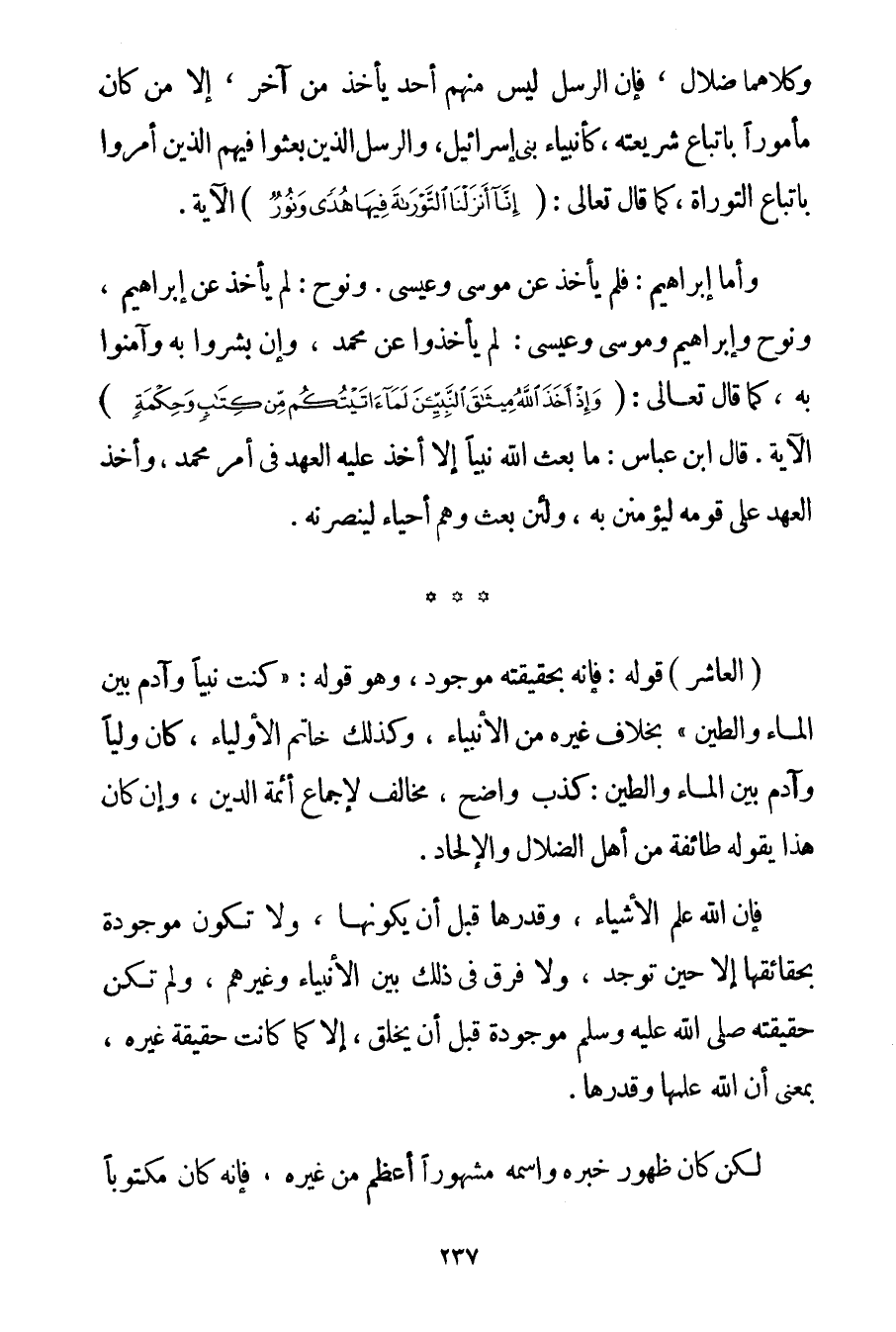وَكِلَاهُمَا ضَلَالٌ فَإِنَّ الرُّسُلَ لَيْسَ مِنْهُمْ أَحَدٌ يَأْخُذُ مِنْ آخَرَ إلَّا مَنْ كَانَ مَأْمُورًا بِاتِّبَاعِ شَرِيعَتِهِ كَأَنْبِيَاءِ بَنِي إسْرَائِيلَ وَالرُّسُلِ الَّذِينَ بُعِثُوا فِيهِمْ الَّذِينَ أُمِرُوا بِاتِّبَاعِ التَّوْرَاةِ كَمَا قَالَ تَعَالَى: {إنَّا أَنْزَلْنَا التَّوْرَاةَ فِيهَا هُدًى وَنُورٌ} الْآيَةَ. وَأَمَّا إبْرَاهِيمُ: فَلَمْ يَأْخُذْ عَنْ مُوسَى وَعِيسَى. وَنُوحٌ: لَمْ يَأْخُذْ عَنْ إبْرَاهِيمَ وَنُوحٌ وَإِبْرَاهِيمُ وَمُوسَى وَعِيسَى: لَمْ يَأْخُذُوا عَنْ مُحَمَّدٍ وَإِنْ بَشَّرُوا بِهِ وَآمَنُوا بِهِ كَمَا قَالَ تَعَالَى: {وَإِذْ أَخَذَ اللَّهُ مِيثَاقَ النَّبِيِّينَ لَمَا آتَيْتُكُمْ مِنْ كِتَابٍ وَحِكْمَةٍ} الْآيَةَ. قَالَ ابْنُ عَبَّاسٍ: مَا بَعَثَ اللَّهُ نَبِيًّا إلَّا أَخَذَ عَلَيْهِ الْعَهْدَ فِي أَمْرِ مُحَمَّدٍ وَأَخَذَ الْعَهْدَ عَلَى قَوْمِهِ لَيُؤْمِنُنَّ بِهِ وَلَئِنْ بُعِثَ وَهُمْ أَحْيَاءٌ لَيَنْصُرُنَّهُ. (الْعَاشِرُ) قَوْلُهُ: فَإِنَّهُ بِحَقِيقَتِهِ مَوْجُودٌ وَهُوَ قَوْلُهُ: {كُنْت نَبِيًّا وَآدَمُ بَيْنَ الْمَاءِ وَالطِّينِ} بِخِلَافِ غَيْرِهِ مِنْ الْأَنْبِيَاءِ وَكَذَلِكَ خَاتَمُ الْأَوْلِيَاءِ كَانَ وَلِيًّا وَآدَمُ بَيْنَ الْمَاءِ وَالطِّينِ: كَذِبٌ وَاضِحٌ مُخَالِفٌ لِإِجْمَاعِ أَئِمَّةِ الدِّينِ وَإِنْ كَانَ هَذَا يَقُولُهُ طَائِفَةٌ مِنْ أَهْلِ الضَّلَالِ وَالْإِلْحَادِ. فَإِنَّ اللَّهَ عَلِمَ الْأَشْيَاءَ وَقَدَّرَهَا قَبْلَ أَنْ يُكَوِّنَهَا وَلَا تَكُونُ مَوْجُودَةً بِحَقَائِقِهَا إلَّا حِينَ تُوجَدُ وَلَا فَرْقَ فِي ذَلِكَ بَيْنَ الْأَنْبِيَاءِ وَغَيْرِهِمْ وَلَمْ تَكُنْ حَقِيقَتُهُ صَلَّى اللَّهُ عَلَيْهِ وَسَلَّمَ مَوْجُودَةً قَبْلَ أَنْ يُخْلَقَ إلَّا كَمَا كَانَتْ حَقِيقَةُ غَيْرِهِ بِمَعْنَى أَنَّ اللَّهَ عَلِمَهَا وَقَدَّرَهَا. لَكِنْ كَانَ ظُهُورُ خَبَرِهِ وَاسْمِهِ مَشْهُورًا أَعْظَمَ مِنْ غَيْرِهِ فَإِنَّهُ كَانَ مَكْتُوبًا