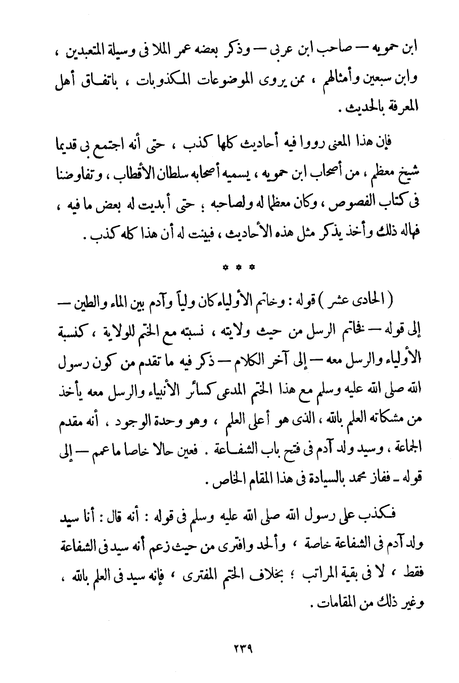 ابْنُ حَمَوَيْهِ - صَاحِبُ ابْنِ عَرَبِيٍّ - وَذَكَرَ بَعْضَهُ عُمَرُ الملا فِي وَسِيلَةِ الْمُتَعَبِّدِينَ وَابْنُ سَبْعِينَ وَأَمْثَالُهُمْ مِمَّنْ يَرْوِي الْمَوْضُوعَاتِ الْمَكْذُوبَاتِ بِاتِّفَاقِ أَهْلِ الْمَعْرِفَةِ بِالْحَدِيثِ. فَإِنَّ هَذَا الْمَعْنَى رَوَوْا فِيهِ أَحَادِيثَ كُلُّهَا كَذِبٌ حَتَّى أَنَّهُ اجْتَمَعَ بِي قَدِيمًا شَيْخٌ مُعَظَّمٌ مِنْ أَصْحَابِ ابْنِ حَمَوَيْهِ يُسَمِّيهِ أَصْحَابُهُ سُلْطَانَ الْأَقْطَابِ وَتَفَاوَضْنَا فِي كِتَابِ الْفُصُوصِ وَكَانَ مُعَظِّمًا لَهُ وَلِصَاحِبِهِ؛ حَتَّى أَبْدَيْت لَهُ بَعْضَ مَا فِيهِ فَهَالَهُ ذَلِكَ وَأَخَذَ يَذْكُرُ مِثْلَ هَذِهِ الْأَحَادِيثِ فَبَيَّنْت لَهُ أَنَّ هَذَا كُلَّهُ كَذِبٌ. (الْحَادِيَ عَشَرَ) قَوْلُهُ: وَخَاتَمُ الْأَوْلِيَاءِ كَانَ وَلِيًّا وَآدَمُ بَيْنَ الْمَاءِ وَالطِّينِ - إلَى قَوْلِهِ - فَخَاتَمُ الرُّسُلِ مِنْ حَيْثُ وِلَايَتُهُ نِسْبَتُهُ مَعَ الْخَتْمِ لِلْوِلَايَةِ كَنِسْبَةِ الْأَوْلِيَاءِ وَالرُّسُلِ مَعَهُ - إلَى آخِرِ الْكَلَامِ - ذَكَرَ فِيهِ مَا تَقَدَّمَ مِنْ كَوْنِ رَسُولِ اللَّهِ صَلَّى اللَّهُ عَلَيْهِ وَسَلَّمَ مَعَ هَذَا الْخَتْمِ الْمُدَّعَى كَسَائِرِ الْأَنْبِيَاءِ وَالرُّسُلِ مَعَهُ يَأْخُذُ مِنْ مِشْكَاتِهِ الْعِلْمَ بِاَللَّهِ الَّذِي هُوَ أَعْلَى الْعِلْمِ وَهُوَ وَحْدَةُ الْوُجُودِ أَنَّهُ مُقَدَّمُ الْجَمَاعَةِ وَسَيِّدُ وَلَدِ آدَمَ فِي فَتْحِ بَابِ الشَّفَاعَةِ. فَعَيَّنَ حَالًا خَاصًّا مَا عَمَّمَ - إلَى قَوْلِهِ - فَفَازَ مُحَمَّدٌ بِالسِّيَادَةِ فِي هَذَا الْمَقَامِ الْخَاصِّ. فَكَذَبَ عَلَى رَسُولِ اللَّهِ صَلَّى اللَّهُ عَلَيْهِ وَسَلَّمَ فِي قَوْلِهِ: أَنَّهُ قَالَ: أَنَا سَيِّدُ وَلَدِ آدَمَ فِي الشَّفَاعَةِ خَاصَّةً وَأَلْحَدَ وَافْتَرَى مِنْ حَيْثُ زَعَمَ أَنَّهُ سَيِّدٌ فِي الشَّفَاعَةِ فَقَطْ لَا فِي بَقِيَّةِ الْمَرَاتِبِ؛ بِخِلَافِ الْخَتْمِ الْمُفْتَرَى فَإِنَّهُ سَيِّدٌ فِي الْعِلْمِ بِاَللَّهِ وَغَيْرِ ذَلِكَ مِنْ الْمَقَامَاتِ.