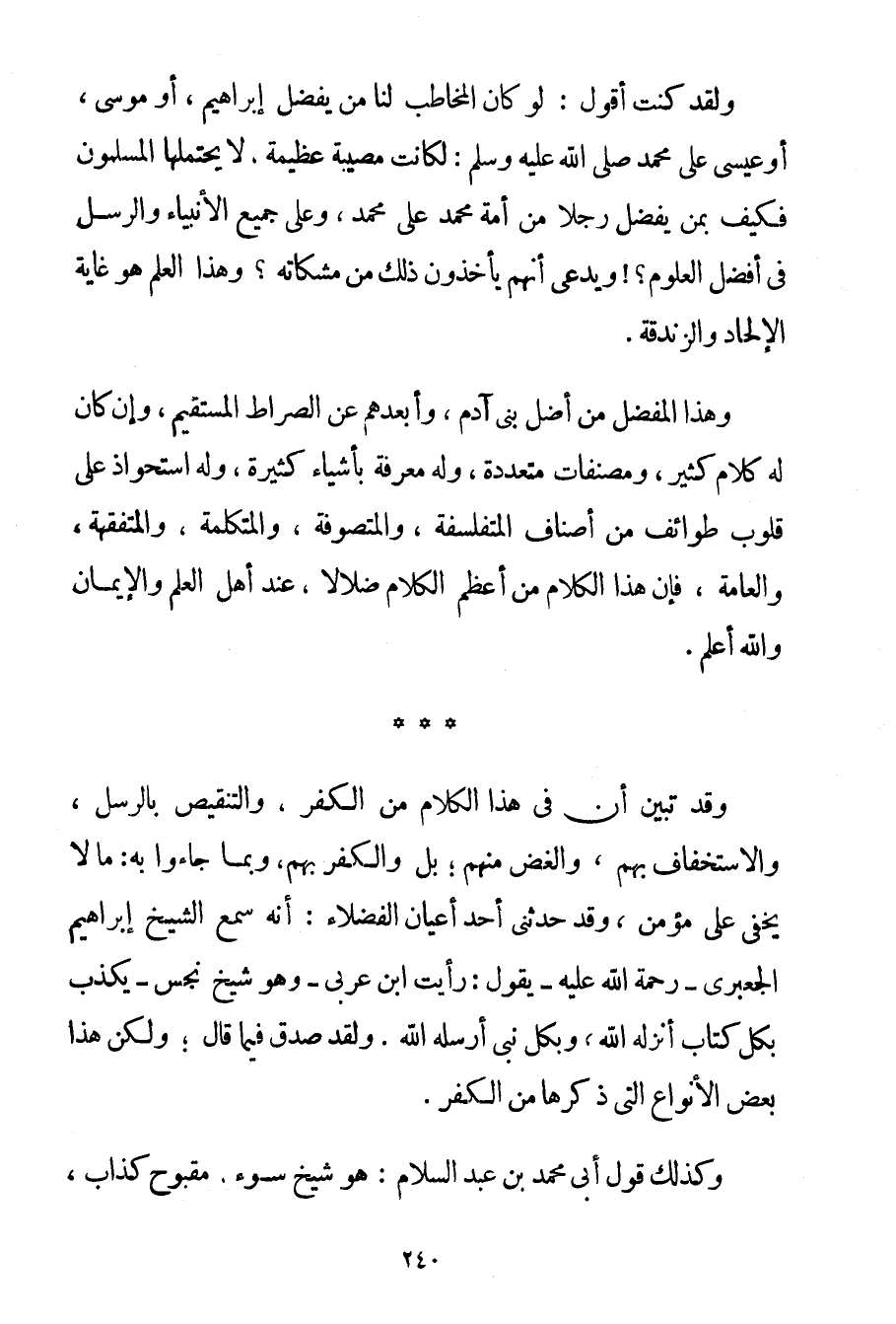 وَلَقَدْ كُنْت أَقُولُ: لَوْ كَانَ الْمُخَاطِبُ لَنَا مَنْ يُفَضِّلُ إبْرَاهِيمَ أَوْ مُوسَى أَوْ عِيسَى عَلَى مُحَمَّدٍ صَلَّى اللَّهُ عَلَيْهِ وَسَلَّمَ: لَكَانَتْ مُصِيبَةٌ عَظِيمَةٌ لَا يَحْتَمِلُهَا الْمُسْلِمُونَ فَكَيْفَ بِمَنْ يُفَضِّلُ رَجُلًا مِنْ أُمَّةِ مُحَمَّدٍ عَلَى مُحَمَّدٍ وَعَلَى جَمِيعِ الْأَنْبِيَاءِ وَالرُّسُلِ فِي أَفْضَلِ الْعُلُومِ وَيَدَّعِي أَنَّهُمْ يَأْخُذُونَ ذَلِكَ مِنْ مِشْكَاتِهِ؟ وَهَذَا الْعِلْمُ هُوَ غَايَةُ الْإِلْحَادِ وَالزَّنْدَقَةِ. وَهَذَا الْمُفَضِّلُ مِنْ أَضَلِّ بَنِي آدَمَ وَأَبْعَدِهِمْ عَنْ الصِّرَاطِ الْمُسْتَقِيمِ وَإِنْ كَانَ لَهُ كَلَامٌ كَثِيرٌ وَمُصَنَّفَاتٌ مُتَعَدِّدَةٌ وَلَهُ مَعْرِفَةٌ بِأَشْيَاءَ كَثِيرَةٍ وَلَهُ اسْتِحْوَاذٌ عَلَى قُلُوبِ طَوَائِفَ مِنْ أَصْنَافِ الْمُتَفَلْسِفَةِ وَالْمُتَصَوِّفَةِ وَالْمُتَكَلِّمَةِ وَالْمُتَفَقِّهَةِ وَالْعَامَّةِ فَإِنَّ هَذَا الْكَلَامَ مِنْ أَعْظَمِ الْكَلَامِ ضَلَالًا عِنْدَ أَهْلِ الْعِلْمِ وَالْإِيمَانِ وَاَللَّهُ أَعْلَمُ. وَقَدْ تَبَيَّنَ أَنَّ فِي هَذَا الْكَلَامِ مِنْ الْكُفْرِ وَالتَّنْقِيصِ بِالرُّسُلِ وَالِاسْتِخْفَافِ بِهِمْ وَالْغَضِّ مِنْهُمْ؛ بَلْ وَالْكُفْرِ بِهِمْ وَبِمَا جَاءُوا بِهِ: مَا لَا يَخْفَى عَلَى مُؤْمِنٍ وَقَدْ حَدَّثَنِي أَحَدُ أَعْيَانِ الْفُضَلَاءِ: أَنَّهُ سَمِعَ الشَّيْخَ إبْرَاهِيمَ الجعبري - رَحْمَةُ اللَّهِ عَلَيْهِ - يَقُولُ: رَأَيْت ابْنَ عَرَبِيٍّ - وَهُوَ شَيْخٌ نَجِسٌ - يُكَذِّبُ بِكُلِّ كِتَابٍ أَنْزَلَهُ اللَّهُ وَبِكُلِّ نَبِيٍّ أَرْسَلَهُ اللَّهُ. وَلَقَدْ صَدَقَ فِيمَا قَالَ؛ وَلَكِنَّ هَذَا بَعْضُ الْأَنْوَاعِ الَّتِي ذَكَرَهَا مِنْ الْكُفْرِ. وَكَذَلِكَ قَوْلُ أَبِي مُحَمَّدِ بْنِ عَبْدِ السَّلَامِ: هُوَ شَيْخُ سُوءٍ مَقْبُوحٌ كَذَّابٌ