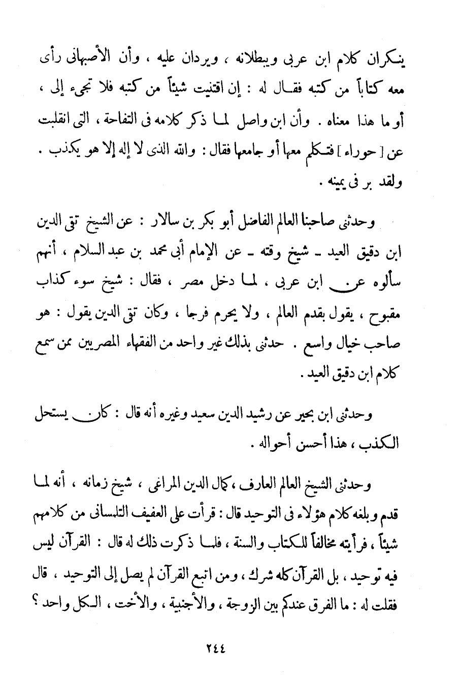 يُنْكِرَانِ كَلَامَ ابْنِ عَرَبِيٍّ وَيُبْطِلَانِهِ وَيَرُدَّانِ عَلَيْهِ وَأَنَّ الأصبهاني رَأَى مَعَهُ كِتَابًا مِنْ كُتُبِهِ فَقَالَ لَهُ: إنْ اقْتَنَيْت شَيْئًا مِنْ كُتُبِهِ فَلَا تَجِئْ إلَيَّ أَوْ مَا هَذَا مَعْنَاهُ. وَأَنَّ ابْنَ وَاصِلٍ لَمَّا ذَكَرَ كَلَامَهُ فِي التُّفَّاحَةِ الَّتِي انْقَلَبَتْ عَنْ حَوْرَاءَ فَتَكَلَّمَ مَعَهَا أَوْ جَامَعَهَا فَقَالَ: وَاَللَّهِ الَّذِي لَا إلَهَ إلَّا هُوَ يَكْذِبُ. وَلَقَدْ بَرَّ فِي يَمِينِهِ. وَحَدَّثَنِي صَاحِبُنَا الْعَالِمُ الْفَاضِلُ أَبُو بَكْرِ بْنُ سالار: عَنْ الشَّيْخِ تَقِيِّ الدِّينِ ابْنِ دَقِيقِ الْعِيدِ - شَيْخِ وَقْتِهِ - عَنْ الْإِمَامِ أَبِي مُحَمَّدِ ابْنِ عَبْدِ السَّلَامِ أَنَّهُمْ سَأَلُوهُ عَنْ ابْنِ عَرَبِيٍّ لَمَّا دَخَلَ مِصْرَ فَقَالَ: شَيْخُ سُوءٍ كَذَّابٌ مَقْبُوحٌ يَقُولُ بِقِدَمِ الْعَالَمِ وَلَا يُحَرِّمُ فَرْجًا وَكَانَ تَقِيُّ الدِّينِ يَقُولُ: هُوَ صَاحِبُ خَيَالٍ وَاسِعٍ. حَدَّثَنِي بِذَلِكَ غَيْرُ وَاحِدٍ مِنْ الْفُقَهَاءِ الْمِصْرِيِّينَ مِمَّنْ سَمِعَ كَلَامَ ابْنِ دَقِيقِ الْعِيدِ. وَحَدَّثَنِي ابْنُ بُحَيْرٍ عَنْ رَشِيدِ الدِّينِ سَعِيدٍ وَغَيْرِهِ أَنَّهُ قَالَ: كَانَ يَسْتَحِلُّ الْكَذِبَ هَذَا أَحْسَنُ أَحْوَالِهِ. وَحَدَّثَنِي الشَّيْخُ الْعَالِمُ الْعَارِفُ كَمَالُ الدِّينِ المراغي شَيْخُ زَمَانِهِ أَنَّهُ لَمَّا قَدِمَ وَبَلَغَهُ كَلَامُ هَؤُلَاءِ فِي التَّوْحِيدِ قَالَ: قَرَأْت عَلَى الْعَفِيفِ التلمساني مِنْ كَلَامِهِمْ شَيْئًا فَرَأَيْته مُخَالِفًا لِلْكِتَابِ وَالسُّنَّةِ فَلَمَّا ذَكَرْت ذَلِكَ لَهُ قَالَ: الْقُرْآنُ لَيْسَ فِيهِ تَوْحِيدٌ بَلْ الْقُرْآنُ كُلُّهُ شِرْكٌ وَمَنْ اتَّبَعَ الْقُرْآنَ لَمْ يَصِلْ إلَى التَّوْحِيدِ قَالَ فَقُلْت لَهُ: مَا الْفَرْقُ عِنْدَكُمْ بَيْنَ الزَّوْجَةِ وَالْأَجْنَبِيَّةِ وَالْأُخْتِ الْكُلُّ وَاحِدٌ؟ قَالَ