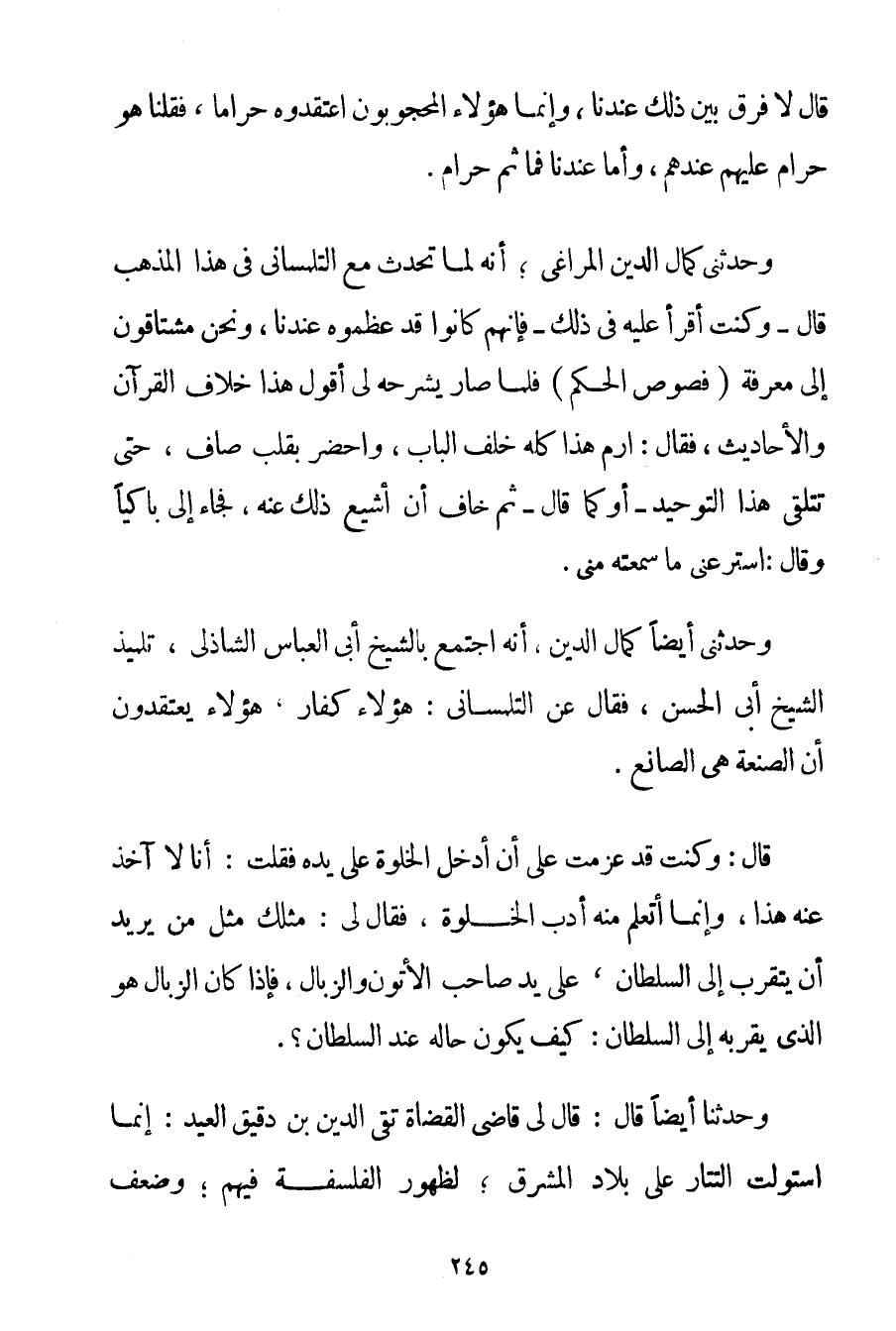 لَا فَرْقَ بَيْنَ ذَلِكَ عِنْدَنَا وَإِنَّمَا هَؤُلَاءِ الْمَحْجُوبُونَ اعْتَقَدُوهُ حَرَامًا فَقُلْنَا هُوَ حَرَامٌ عَلَيْهِمْ عِنْدَهُمْ وَأَمَّا عِنْدَنَا فَمَا ثَمَّ حَرَامٌ. وَحَدَّثَنِي كَمَالُ الدَّيْنِ المراغي؛ أَنَّهُ لَمَّا تَحَدَّثَ مَعَ التلمساني فِي هَذَا الْمَذْهَبِ قَالَ - وَكُنْت أَقْرَأُ عَلَيْهِ فِي ذَلِكَ - فَإِنَّهُمْ كَانُوا قَدْ عَظَّمُوهُ عِنْدَنَا وَنَحْنُ مُشْتَاقُونَ إلَى مَعْرِفَةٍ (فُصُوصُ الْحِكَمِ فَلَمَّا صَارَ يَشْرَحُهُ لِي أَقُولُ هَذَا خِلَافُ الْقُرْآنِ وَالْأَحَادِيثِ فَقَالَ: ارْمِ هَذَا كُلَّهُ خَلْفَ الْبَابِ وَاحْضُرْ بِقَلْبِ صَافٍ حَتَّى تَتَلَقَّى هَذَا التَّوْحِيدَ - أَوْ كَمَا قَالَ - ثُمَّ خَافَ أَنْ أُشِيعَ ذَلِكَ عَنْهُ فَجَاءَ إلَيَّ بَاكِيًا وَقَالَ: اسْتَرْعِنِي مَا سَمِعْته مِنِّي. وَحَدَّثَنِي أَيْضًا كَمَالُ الدَّيْنِ أَنَّهُ اجْتَمَعَ بِالشَّيْخِ أَبِي الْعَبَّاسِ الشاذلي تِلْمِيذِ الشَّيْخِ أَبِي الْحَسَنِ فَقَالَ عَنْ التلمساني: هَؤُلَاءِ كُفَّارٌ هَؤُلَاءِ يَعْتَقِدُونَ أَنَّ الصَّنْعَةَ هِيَ الصَّانِعُ. قَالَ: وَكُنْت قَدْ عَزَمْت عَلَى أَنْ أَدْخُلَ الْخَلْوَةَ عَلَى يَدِهِ فَقُلْت: أَنَا لَا آخُذُ عَنْهُ هَذَا وَإِنَّمَا أَتَعَلَّمُ مِنْهُ أَدَبَ الْخَلْوَةِ فَقَالَ لِي: مَثَلُك مَثَلُ مَنْ يُرِيدُ أَنْ يَتَقَرَّبَ إلَى السُّلْطَانِ عَلَى يَدِ صَاحِبِ الْأَتُونِ وَالزَّبَّالِ فَإِذَا كَانَ الزَّبَّالُ هُوَ الَّذِي يُقَرِّبُهُ إلَى السُّلْطَانِ: كَيْفَ يَكُونُ حَالُهُ عِنْدَ السُّلْطَانِ؟ . وَحَدَّثَنَا أَيْضًا قَالَ: قَالَ لِي قَاضِي الْقُضَاةِ تَقِيُّ الدِّينِ ابْنُ دَقِيقِ الْعِيدِ: إنَّمَا اسْتَوْلَتْ التَّتَارُ عَلَى بِلَادِ الْمَشْرِقِ؛ لِظُهُورِ الْفَلْسَفَةِ فِيهِمْ؛ وَضَعْفِ
