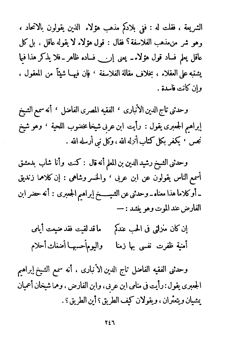 الشَّرِيعَةِ فَقُلْت لَهُ: فَفِي بِلَادِكُمْ مَذْهَبُ هَؤُلَاءِ الَّذِينَ يَقُولُونَ بِالِاتِّحَادِ وَهُوَ شَرٌّ مِنْ مَذْهَبِ الْفَلَاسِفَةِ؟ فَقَالَ: قَوْلُ هَؤُلَاءِ لَا يَقُولُهُ عَاقِلٌ بَلْ كُلُّ عَاقِلٍ يَعْلَمُ فَسَادَ قَوْلِ هَؤُلَاءِ - يَعْنِي أَنَّ فَسَادَهُ ظَاهِرٌ - فَلَا يُذْكَرُ هَذَا فِيمَا يَشْتَبِهُ عَلَى الْعُقَلَاءِ بِخِلَافِ مَقَالَةِ الْفَلَاسِفَةِ فَإِنَّ فِيهَا شَيْئًا مِنْ الْمَعْقُولِ وَإِنْ كَانَتْ فَاسِدَةً. وَحَدَّثَنِي تَاجُ الدِّينِ الْأَنْبَارِيُّ الْفَقِيهُ الْمِصْرِيُّ الْفَاضِلُ أَنَّهُ سَمِعَ الشَّيْخَ إبْرَاهِيمَ الجعبري يَقُولُ: رَأَيْت ابْنَ عَرَبِيٍّ شَيْخًا مَخْضُوبَ اللِّحْيَةِ وَهُوَ شَيْخٌ نَجِسٌ يَكْفُرُ بِكُلِّ كِتَابٍ أَنْزَلَهُ اللَّهُ وَكُلِّ نَبِيٍّ أَرْسَلَهُ اللَّهُ. وَحَدَّثَنِي الشَّيْخُ رَشِيدُ الدِّينِ بْنُ الْمُعَلِّمِ أَنَّهُ قَالَ: كُنْت وَأَنَا شَابٌّ بِدِمَشْقَ أَسْمَعُ النَّاسَ يَقُولُونَ عَنْ ابْنِ عَرَبِيٍّ والخسروشاهي: أَنَّ كِلَاهُمَا زِنْدِيقٌ - أَوْ كَلَامًا هَذَا مَعْنَاهُ - وَحَدَّثَنِي عَنْ الشَّيْخِ إبْرَاهِيمَ الجعبري: أَنَّهُ حَضَرَ ابْنَ الْفَارِضِ عِنْدَ الْمَوْتِ وَهُوَ يُنْشِدُ: