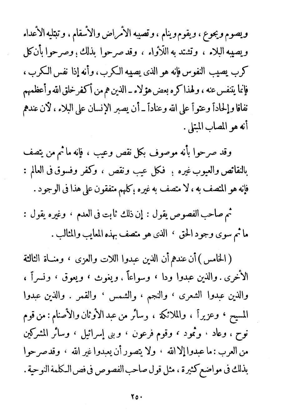 وَيَصُومُ وَيَجُوعُ وَيَقُومُ وَيَنَامُ وَتُصِيبُهُ الْأَمْرَاضُ وَالْأَسْقَامُ وَتَبْتَلِيهِ الْأَعْدَاءُ وَيُصِيبُهُ الْبَلَاءُ وَتَشْتَدُّ بِهِ اللَّأْوَاءُ وَقَدْ صَرَّحُوا بِذَلِكَ؛ وَصَرَّحُوا بِأَنَّ كُلَّ كَرْبٍ يُصِيبُ النُّفُوسَ فَإِنَّهُ هُوَ الَّذِي يُصِيبُهُ الْكَرْبُ وَأَنَّهُ إذَا نَفَّسَ الْكَرْبَ فَإِنَّمَا يَتَنَفَّسُ عَنْهُ وَلِهَذَا كَرِهَ بَعْضُ هَؤُلَاءِ - الَّذِينَ هُمْ مِنْ أَكْفَرِ خَلْقِ اللَّهِ وَأَعْظَمِهِمْ نِفَاقًا وَإِلْحَادًا وَعُتُوًّا عَلَى اللَّهِ وَعِنَادًا - أَنْ يَصْبِرَ الْإِنْسَانُ عَلَى الْبَلَاءِ لِأَنَّ عِنْدَهُمْ أَنَّهُ هُوَ الْمُصَابُ الْمُبْتَلِي. وَقَدْ صَرَّحُوا بِأَنَّهُ مَوْصُوفٌ بِكُلِّ نَقْصٍ وَعَيْبٍ فَإِنَّهُ مَا ثَمَّ مَنْ يَتَّصِفُ بِالنَّقَائِصِ وَالْعُيُوبِ غَيْرُهُ؛ فَكُلُّ عَيْبٍ وَنَقْصٍ وَكُفْرٍ وَفُسُوقٍ فِي الْعَالَمِ: فَإِنَّهُ هُوَ الْمُتَّصِفُ بِهِ لَا مُتَّصِفَ بِهِ غَيْرُهُ؛ كُلُّهُمْ مُتَّفِقُونَ عَلَى هَذَا فِي الْوُجُودِ. ثُمَّ صَاحِبُ الْفُصُوصِ يَقُولُ: إنَّ ذَلِكَ ثَابِتٌ فِي الْعَدَمِ وَغَيْرُهُ يَقُولُ: مَا ثَمَّ سِوَى وُجُودِ الْحَقِّ الَّذِي هُوَ مُتَّصِفٌ بِهَذِهِ الْمَعَايِبِ وَالْمَثَالِبِ. (الْخَامِسُ) أَنَّ عِنْدَهُمْ أَنَّ الَّذِينَ عَبَدُوا اللَّاتَ وَالْعُزَّى وَمَنَاةَ الثَّالِثَةَ الْأُخْرَى. وَاَلَّذِينَ عَبَدُوا وَدًّا وَسُوَاعًا وَيَغُوثَ وَيَعُوقُ وَنَسْرًا وَاَلَّذِينَ عَبَدُوا الشِّعْرَى وَالنَّجْمَ وَالشَّمْسَ وَالْقَمَرَ. وَاَلَّذِينَ عَبَدُوا الْمَسِيحَ وَعُزَيْرًا وَالْمَلَائِكَةَ وَسَائِرُ مَنْ عَبَدَ الْأَوْثَانَ وَالْأَصْنَامَ: مِنْ قَوْمِ نُوحٍ وَعَادٍ وَثَمُودَ وَقَوْمِ فِرْعَوْنَ وَبَنِيَّ إسْرَائِيلَ وَسَائِرِ الْمُشْرِكِينَ مِنْ الْعَرَبِ: مَا عَبَدُوا إلَّا اللَّهَ وَلَا يُتَصَوَّرُ أَنْ يَعْبُدُوا غَيْرَ اللَّهِ وَقَدْ صَرَّحُوا بِذَلِكَ فِي مَوَاضِعَ كَثِيرَةٍ مِثْلُ قَوْلِ صَاحِبِ الْفُصُوصِ فِي فَصِّ الْكَلِمَةِ النوحية.