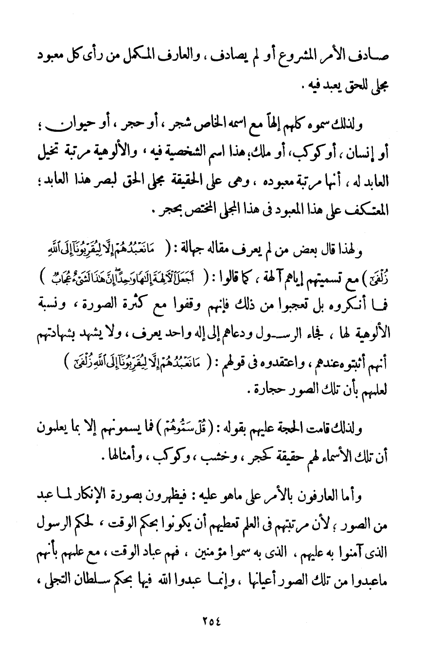 صَادَفَ الْأَمْرَ الْمَشْرُوعَ أَوْ لَمْ يُصَادِفْ وَالْعَارِفُ الْمُكَمَّلُ مَنْ رَأَى كُلَّ مَعْبُودٍ مُجَلَّى لِلْحَقِّ يُعْبَدُ فِيهِ. وَلِذَلِكَ سَمَّوْهُ كُلُّهُمْ إلَهًا مَعَ اسْمِهِ الْخَاصِّ شَجَرٌ أَوْ حَجَرٌ أَوْ حَيَوَانٌ؛ أَوْ إنْسَانٌ أَوْ كَوْكَبٌ أَوْ مَلَكٌ؛ هَذَا اسْمُ الشَّخْصِيَّةِ فِيهِ وَالْأُلُوهِيَّةِ مَرْتَبَةٌ تُخَيِّلُ الْعَابِدَ لَهُ أَنَّهَا مَرْتَبَةُ مَعْبُودِهِ وَهِيَ عَلَى الْحَقِيقَةِ مُجَلَّى الْحَقِّ لِبَصَرِ هَذَا الْعَابِدِ؛ الْمُعْتَكِفِ عَلَى هَذَا الْمَعْبُودِ فِي هَذَا الْمُجَلَّى الْمُخْتَصِّ بِحَجَرِ. وَلِهَذَا قَالَ بَعْضُ مَنْ لَمْ يَعْرِفْ مَقَالَهُ جَهَالَةً: {مَا نَعْبُدُهُمْ إلَّا لِيُقَرِّبُونَا إلَى اللَّهِ زُلْفَى} مَعَ تَسْمِيَتِهِمْ إيَّاهُمْ آلِهَةً كَمَا قَالُوا: {أَجَعَلَ الْآلِهَةَ إلَهًا وَاحِدًا إنَّ هَذَا لَشَيْءٌ عُجَابٌ} فَمَا أَنْكَرُوهُ بَلْ تَعَجَّبُوا مِنْ ذَلِكَ فَإِنَّهُمْ وَقَفُوا مَعَ كَثْرَةِ الصُّورَةِ وَنِسْبَةِ الْأُلُوهِيَّةِ لَهَا فَجَاءَ الرَّسُولُ وَدَعَاهُمْ إلَى إلَهٍ وَاحِدٍ يُعْرَفُ وَلَا يَشْهَدُ بِشَهَادَتِهِمْ أَنَّهُمْ أَثْبَتُوهُ عِنْدَهُمْ وَاعْتَقَدُوهُ فِي قَوْلِهِمْ: {مَا نَعْبُدُهُمْ إلَّا لِيُقَرِّبُونَا إلَى اللَّهِ زُلْفَى} لِعِلْمِهِمْ بِأَنَّ تِلْكَ الصُّوَرَ حِجَارَةٌ. وَلِذَلِكَ قَامَتْ الْحُجَّةُ عَلَيْهِمْ بِقَوْلِهِ: {قُلْ سَمُّوهُمْ} فَمَا يُسَمُّونَهُمْ إلَّا بِمَا يَعْلَمُونَ أَنَّ تِلْكَ الْأَسْمَاءَ لَهُمْ حَقِيقَةٌ كَحَجَرِ وَخَشَبٍ وَكَوْكَبٍ وَأَمْثَالِهَا. وَأَمَّا الْعَارِفُونَ بِالْأَمْرِ عَلَى مَا هُوَ عَلَيْهِ: فَيَظْهَرُونَ بِصُورَةِ الْإِنْكَارِ لِمَا عُبِدَ مِنْ الصُّوَرِ؛ لِأَنَّ مَرْتَبَتَهُمْ فِي الْعِلْمِ تُعْطِيهِمْ أَنْ يَكُونُوا بِحُكْمِ الْوَقْتِ لِحُكْمِ الرَّسُولِ الَّذِي آمَنُوا بِهِ عَلَيْهِمْ الَّذِي بِهِ سُمُّوا مُؤْمِنِينَ فَهُمْ عُبَّادُ الْوَقْتِ مَعَ عِلْمِهِمْ بِأَنَّهُمْ مَا عَبَدُوا مِنْ تِلْكَ الصُّوَرِ أَعْيَانَهَا وَإِنَّمَا عَبَدُوا اللَّهَ فِيهَا بِحُكْمِ سُلْطَانِ التَّجَلِّي
