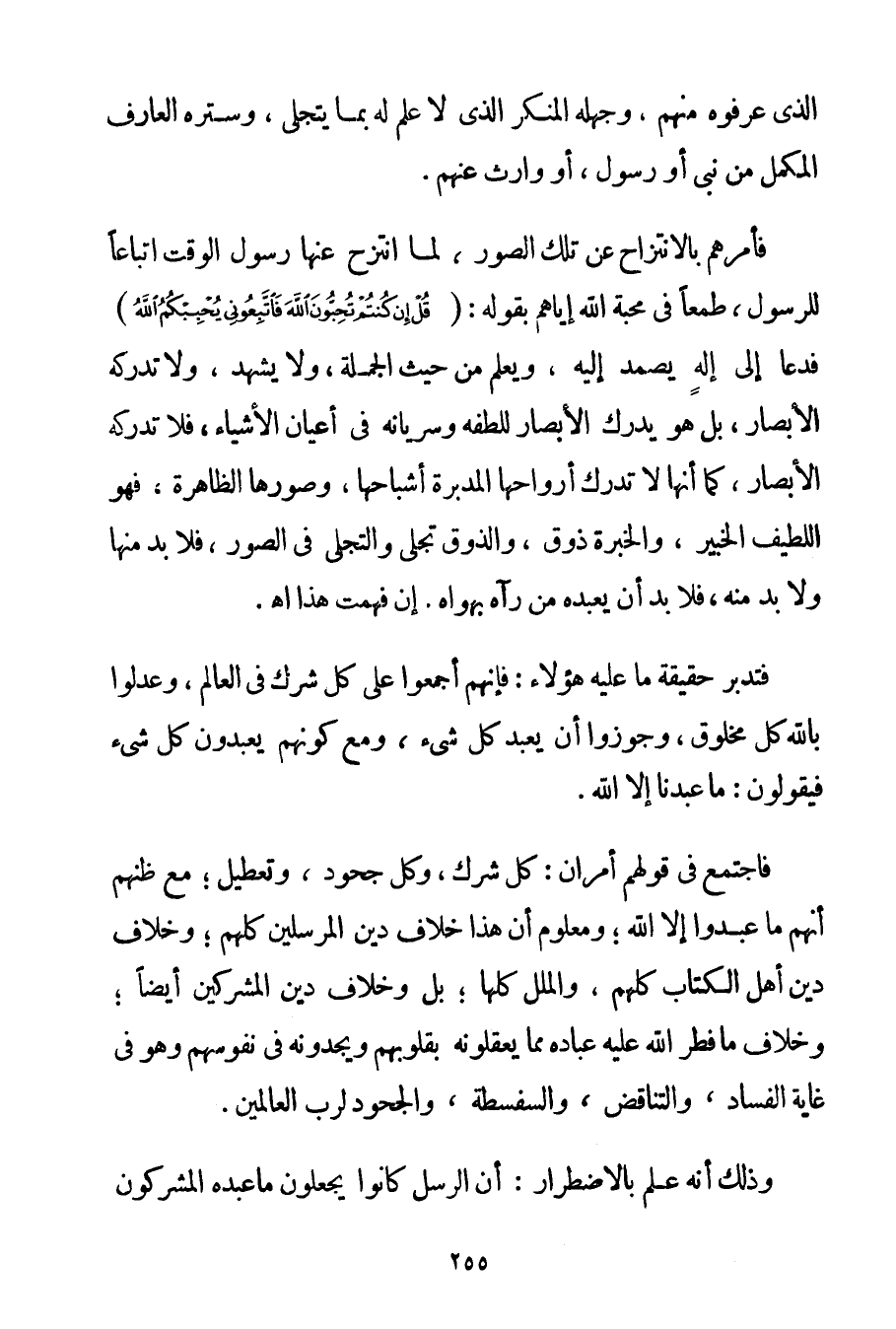 الَّذِي عَرَفُوهُ مِنْهُمْ وَجَهِلَهُ الْمُنْكِرُ الَّذِي لَا عِلْمَ لَهُ بِمَا يَتَجَلَّى وَسَتَرَهُ الْعَارِفُ الْمُكَمَّلُ مِنْ نَبِيٍّ أَوْ رَسُولٍ أَوْ وَارِثٍ عَنْهُمْ. فَأَمَرَهُمْ بِالِانْتِزَاحِ عَنْ تِلْكَ الصُّوَرِ لَمَّا انْتَزَحَ عَنْهَا رَسُولُ الْوَقْتِ اتِّبَاعًا لِلرَّسُولِ طَمَعًا فِي مَحَبَّةِ اللَّهِ إيَّاهُمْ بِقَوْلِهِ: {قُلْ إنْ كُنْتُمْ تُحِبُّونَ اللَّهَ فَاتَّبِعُونِي يُحْبِبْكُمُ اللَّهُ} فَدَعَا إلَى إلَهٍ يُصْمَدُ إلَيْهِ وَيَعْلَمُ مِنْ حَيْثُ الْجُمْلَةُ وَلَا يَشْهَدُ وَلَا تُدْرِكُهُ الْأَبْصَارُ بَلْ هُوَ يُدْرِكُ الْأَبْصَارَ لِلُطْفِهِ وَسَرَيَانِهِ فِي أَعْيَانِ الْأَشْيَاءِ فَلَا تُدْرِكُهُ الْأَبْصَارُ كَمَا أَنَّهَا لَا تُدْرِكُ أَرْوَاحَهَا الْمُدَبِّرَةَ أَشْبَاحَهَا وَصُوَرَهَا الظَّاهِرَةَ فَهُوَ اللَّطِيفُ الْخَبِيرُ وَالْخِبْرَةُ ذَوْقٌ وَالذَّوْقُ تَجَلِّي وَالتَّجَلِّي فِي الصُّوَرِ فَلَا بُدَّ مِنْهَا وَلَا بُدَّ مِنْهُ فَلَا بُدَّ أَنْ يَعْبُدَهُ مَنْ رَآهُ بِهَوَاهُ. إنْ فَهِمْت هَذَا اهـ. فَتَدَبَّرْ حَقِيقَةَ مَا عَلَيْهِ هَؤُلَاءِ: فَإِنَّهُمْ أَجْمَعُوا عَلَى كُلِّ شِرْكٍ فِي الْعَالَمِ وَعَدَلُوا بِاَللَّهِ كُلَّ مَخْلُوقٍ وَجَوَّزُوا أَنْ يُعْبَدَ كُلُّ شَيْءٍ وَمَعَ كَوْنِهِمْ يَعْبُدُونَ كُلَّ شَيْءٍ فَيَقُولُونَ: مَا عَبَدْنَا إلَّا اللَّهَ. فَاجْتَمَعَ فِي قَوْلِهِمْ أَمْرَانِ: كُلُّ شِرْكٍ وَكُلُّ جُحُودٍ وَتَعْطِيلٍ؛ مَعَ ظَنِّهِمْ أَنَّهُمْ مَا عَبَدُوا إلَّا اللَّهَ؛ وَمَعْلُومٌ أَنَّ هَذَا خِلَافُ دِينِ الْمُرْسَلِينَ كُلِّهِمْ؛ وَخِلَافُ دِينِ أَهْلِ الْكِتَابِ كُلِّهِمْ وَالْمِلَلِ كُلِّهَا؛ بَلْ وَخِلَافُ دِينِ الْمُشْرِكِينَ أَيْضًا؛ وَخِلَافُ مَا فَطَرَ اللَّهُ عَلَيْهِ عِبَادَهُ مِمَّا يَعْقِلُونَهُ بِقُلُوبِهِمْ وَيَجِدُونَهُ فِي نُفُوسِهِمْ وَهُوَ فِي غَايَةِ الْفَسَادِ وَالتَّنَاقُضِ وَالسَّفْسَطَةِ وَالْجُحُودِ لِرَبِّ الْعَالَمِينَ. وَذَلِكَ أَنَّهُ عُلِمَ بِالِاضْطِرَارِ: أَنَّ الرُّسُلَ كَانُوا يَجْعَلُونَ مَا عَبَدَهُ الْمُشْرِكُونَ