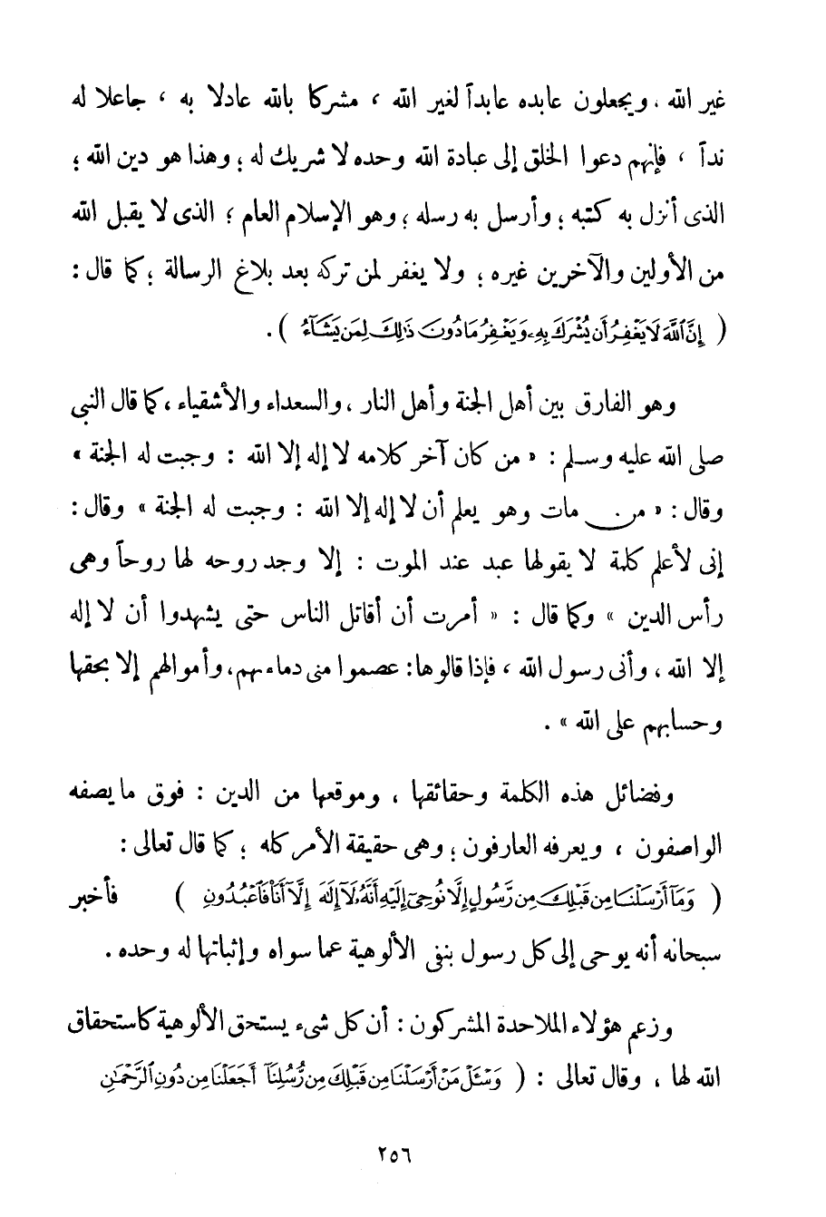 غَيْرَ اللَّهِ؛ وَيَجْعَلُونَ عَابِدَهُ عَابِدًا لِغَيْرِ اللَّهِ مُشْرِكًا بِاَللَّهِ عَادِلًا بِهِ جَاعِلًا لَهُ نِدًّا فَإِنَّهُمْ دَعَوْا الْخَلْقَ إلَى عِبَادَةِ اللَّهِ وَحْدَهُ لَا شَرِيكَ لَهُ؛ وَهَذَا هُوَ دِينُ اللَّهِ؛ الَّذِي أَنْزَلَ بِهِ كُتُبَهُ؛ وَأَرْسَلَ بِهِ رُسُلَهُ؛ وَهُوَ الْإِسْلَامُ الْعَامُّ؛ الَّذِي لَا يَقْبَلُ اللَّهُ مِنْ الْأَوَّلِينَ والآخرين غَيْرَهُ؛ وَلَا يَغْفِرُ لِمَنْ تَرَكَهُ بَعْدَ بَلَاغِ الرِّسَالَةِ؛ كَمَا قَالَ: {إنَّ اللَّهَ لَا يَغْفِرُ أَنْ يُشْرَكَ بِهِ وَيَغْفِرُ مَا دُونَ ذَلِكَ لِمَنْ يَشَاءُ} . وَهُوَ الْفَارِقُ بَيْنَ أَهْلِ الْجَنَّةِ وَأَهْلِ النَّارِ وَالسُّعَدَاءِ وَالْأَشْقِيَاءِ كَمَا قَالَ النَّبِيُّ صَلَّى اللَّهُ عَلَيْهِ وَسَلَّمَ {مَنْ كَانَ آخِرُ كَلَامِهِ لَا إلَهَ إلَّا اللَّهُ: وَجَبَتْ لَهُ الْجَنَّةُ} وَقَالَ: {مَنْ مَاتَ وَهُوَ يَعْلَمُ أَنْ لَا إلَهَ إلَّا اللَّهُ: وَجَبَتْ لَهُ الْجَنَّةُ} وَقَالَ: {إنِّي لَأَعْلَمُ كَلِمَةً لَا يَقُولُهَا عَبْدٌ عِنْدَ الْمَوْتِ: إلَّا وُجِدَ رُوحُهُ لَهَا رُوحًا وَهِيَ رَأْسُ الدِّينِ} وَكَمَا قَالَ: {أُمِرْت أَنْ أُقَاتِلَ النَّاسَ حَتَّى يَشْهَدُوا أَنْ لَا إلَهَ إلَّا اللَّهُ وَأَنِّي رَسُولُ اللَّهِ فَإِذَا قَالُوهَا: عَصَمُوا مِنِّي دِمَاءَهُمْ وَأَمْوَالَهُمْ إلَّا بِحَقِّهَا وَحِسَابُهُمْ عَلَى اللَّهِ} . وَفَضَائِلُ هَذِهِ الْكَلِمَةِ وَحَقَائِقُهَا وَمَوْقِعُهَا مِنْ الدِّينِ: فَوْقَ مَا يَصِفُهُ الْوَاصِفُونَ وَيَعْرِفُهُ الْعَارِفُونَ؛ وَهِيَ حَقِيقَةُ الْأَمْرِ كُلِّهِ؛ كَمَا قَالَ تَعَالَى: {وَمَا أَرْسَلْنَا مِنْ قَبْلِكَ مِنْ رَسُولٍ إلَّا نُوحِي إلَيْهِ أَنَّهُ لَا إلَهَ إلَّا أَنَا فَاعْبُدُونِ} فَأَخْبَرَ سُبْحَانَهُ أَنَّهُ يُوحِي إلَى كُلِّ رَسُولٍ بِنَفْيِ الْأُلُوهِيَّةِ عَمَّا سِوَاهُ وَإِثْبَاتِهَا لَهُ وَحْدَهُ. وَزَعَمَ هَؤُلَاءِ الْمَلَاحِدَةُ الْمُشْرِكُونَ: أَنَّ كُلَّ شَيْءٍ يَسْتَحِقُّ الْأُلُوهِيَّةَ كَاسْتِحْقَاقِ اللَّهِ لَهَا وَقَالَ تَعَالَى: {وَاسْأَلْ مَنْ أَرْسَلْنَا مِنْ قَبْلِكَ مِنْ رُسُلِنَا أَجَعَلْنَا مِنْ دُونِ