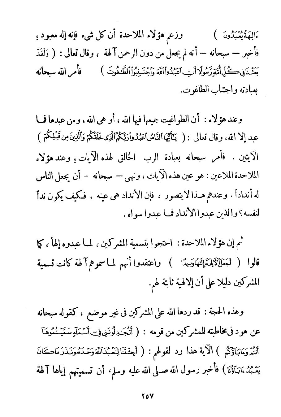 الرَّحْمَنِ آلِهَةً يُعْبَدُونَ} وَزَعَمَ هَؤُلَاءِ الْمَلَاحِدَةُ أَنَّ كُلَّ شَيْءٍ فَإِنَّهُ إلَهٌ مَعْبُودٌ؛ فَأَخْبَرَ - سُبْحَانَهُ - أَنَّهُ لَمْ يَجْعَلْ مِنْ دُونِ الرَّحْمَنِ آلِهَةً وَقَالَ تَعَالَى: {وَلَقَدْ بَعَثْنَا فِي كُلِّ أُمَّةٍ رَسُولًا أَنِ اُعْبُدُوا اللَّهَ وَاجْتَنِبُوا الطَّاغُوتَ} فَأَمَرَ اللَّهُ سُبْحَانَهُ بِعِبَادَتِهِ وَاجْتِنَابِ الطَّاغُوتِ. وَعِنْدَ هَؤُلَاءِ: أَنَّ الطَّوَاغِيتَ جَمِيعَهَا فِيهَا اللَّهُ أَوْ هِيَ اللَّهُ وَمَنْ عَبَدَهَا فَمَا عَبَدَ إلَّا اللَّهَ وَقَالَ تَعَالَى: {يَا أَيُّهَا النَّاسُ اعْبُدُوا رَبَّكُمُ الَّذِي خَلَقَكُمْ وَالَّذِينَ مِنْ قَبْلِكُمْ} الْآيَتَيْنِ. فَأَمَرَ سُبْحَانَهُ بِعِبَادَةِ الرَّبِّ الْخَالِقِ لِهَذِهِ الْآيَاتِ؛ وَعِنْدَ هَؤُلَاءِ الْمَلَاحِدَةِ الْمَلَاعِينِ: هُوَ عَيْنُ هَذِهِ الْآيَاتِ وَنَهَى - سُبْحَانَهُ - أَنْ يَجْعَلَ النَّاسُ لَهُ أَنْدَادًا وَعِنْدَهُمْ هَذَا لَا يُتَصَوَّرُ فَإِنَّ الْأَنْدَادَ هِيَ عَيْنُهُ فَكَيْفَ يَكُونُ نِدًّا لِنَفْسِهِ؟ وَاَلَّذِينَ عَبَدُوا الْأَنْدَادَ فَمَا عَبَدُوا سِوَاهُ. ثُمَّ إنَّ هَؤُلَاءِ الْمَلَاحِدَةَ: احْتَجُّوا بِتَسْمِيَةِ الْمُشْرِكِينَ لِمَا عَبَدُوهُ إلَهًا كَمَا قَالُوا {أَجَعَلَ الْآلِهَةَ إلَهًا وَاحِدًا} وَاعْتَقَدُوا أَنَّهُمْ لَمَّا سَمَّوْهُمْ آلِهَةً كَانَتْ تَسْمِيَةُ الْمُشْرِكِينَ دَلِيلًا عَلَى أَنَّ الْإِلَهِيَّةَ ثَابِتَةٌ لَهُمْ. وَهَذِهِ الْحُجَّةُ: قَدْ رَدَّهَا اللَّهُ عَلَى الْمُشْرِكِينَ فِي غَيْرِ مَوْضِعٍ كَقَوْلِهِ سُبْحَانَهُ عَنْ هُودٍ فِي مُخَاطَبَتِهِ لِلْمُشْرِكِينَ مِنْ قَوْمِهِ: {أَتُجَادِلُونَنِي فِي أَسْمَاءٍ سَمَّيْتُمُوهَا أَنْتُمْ وَآبَاؤُكُمْ} الْآيَةَ هَذَا رَدٌّ لِقَوْلِهِ: {أَجِئْتَنَا لِنَعْبُدَ اللَّهَ وَحْدَهُ وَنَذَرَ مَا كَانَ يَعْبُدُ آبَاؤُنَا} فَأَخْبَرَ رَسُولُ اللَّهِ صَلَّى اللَّهُ عَلَيْهِ وَسَلَّمَ أَنَّ تَسْمِيَتَهُمْ إيَّاهَا آلِهَةً