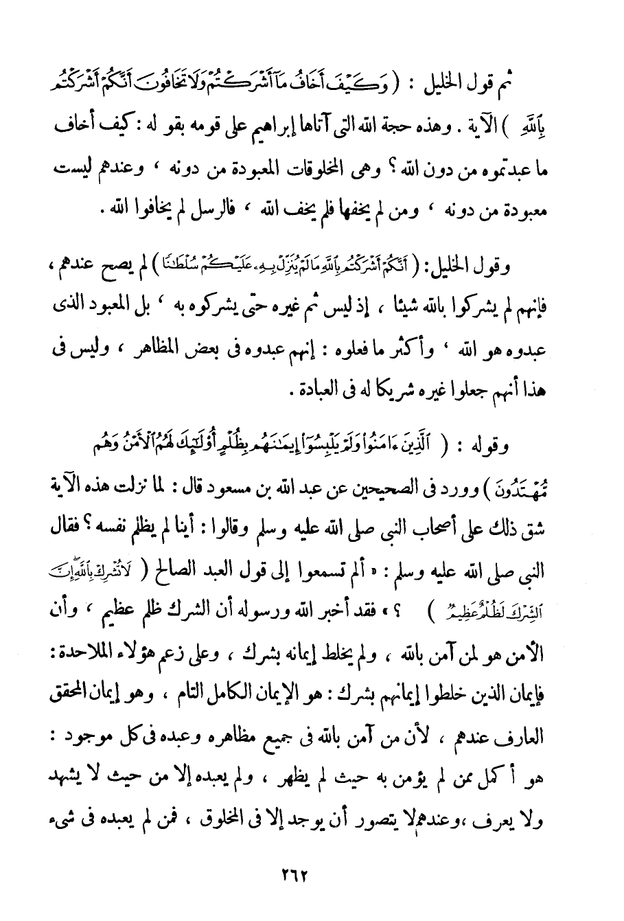 الْآيَةَ. ثُمَّ قَوْلُ الْخَلِيلِ: {وَكَيْفَ أَخَافُ مَا أَشْرَكْتُمْ وَلَا تَخَافُونَ أَنَّكُمْ أَشْرَكْتُمْ بِاللَّهِ} الْآيَةَ. وَهَذِهِ حُجَّةُ اللَّهِ الَّتِي آتَاهَا إبْرَاهِيمَ عَلَى قَوْمِهِ بِقَوْلِهِ: كَيْفَ أَخَافُ مَا عَبَدْتُمُوهُ مِنْ دُونِ اللَّهِ؟ وَهِيَ الْمَخْلُوقَاتُ الْمَعْبُودَةُ مَنْ دُونِهِ وَعِنْدَهُمْ لَيْسَتْ مَعْبُودَةً مَنْ دُونِهِ وَمَنْ لَمْ يَخَفْهَا فَلَمْ يَخَفْ اللَّهَ فَالرُّسُلُ لَمْ يَخَافُوا اللَّهَ. وَقَوْلُ الْخَلِيلِ: {أَنَّكُمْ أَشْرَكْتُمْ بِاللَّهِ مَا لَمْ يُنَزِّلْ بِهِ عَلَيْكُمْ سُلْطَانًا} لَمْ يَصِحَّ عِنْدَهُمْ فَإِنَّهُمْ لَمْ يُشْرِكُوا بِاَللَّهِ شَيْئًا إذْ لَيْسَ ثَمَّ غَيْرُهُ حَتَّى يُشْرِكُوهُ بِهِ بَلْ الْمَعْبُودُ الَّذِي عَبَدُوهُ هُوَ اللَّهُ وَأَكْثَرُ مَا فَعَلُوهُ: أَنَّهُمْ عَبَدُوهُ فِي بَعْضِ الْمَظَاهِرِ وَلَيْسَ فِي هَذَا أَنَّهُمْ جَعَلُوا غَيْرَهُ شَرِيكًا لَهُ فِي الْعِبَادَةِ. وَقَوْلُهُ: {الَّذِينَ آمَنُوا وَلَمْ يَلْبِسُوا إيمَانَهُمْ بِظُلْمٍ أُولَئِكَ لَهُمُ الْأَمْنُ وَهُمْ مُهْتَدُونَ} وَوَرَدَ فِي الصَّحِيحَيْنِ عَنْ عَبْدِ اللَّهِ بْنِ مَسْعُودٍ قَالَ: {لَمَّا نَزَلَتْ هَذِهِ الْآيَةُ شَقَّ ذَلِكَ عَلَى أَصْحَابِ النَّبِيِّ صَلَّى اللَّهُ عَلَيْهِ وَسَلَّمَ وَقَالُوا: أَيُّنَا لَمْ يَظْلِمْ نَفْسَهُ؟ فَقَالَ النَّبِيُّ صَلَّى اللَّهُ عَلَيْهِ وَسَلَّمَ أَلَمْ تَسْمَعُوا إلَى قَوْلِ الْعَبْدِ الصَّالِحِ {لَا تُشْرِكْ بِاللَّهِ إنَّ الشِّرْكَ لَظُلْمٌ عَظِيمٌ} ؟} فَقَدْ أَخْبَرَ اللَّهُ وَرَسُولُهُ أَنَّ الشِّرْكَ ظُلْمٌ عَظِيمٌ وَأَنَّ الْأَمْنَ هُوَ لِمَنْ آمَنَ بِاَللَّهِ وَلَمْ يَخْلِطْ إيمَانَهُ بِشِرْكِ وَعَلَى زَعْمِ هَؤُلَاءِ الْمَلَاحِدَةِ: فَإِيمَانُ الَّذِينَ خَلَطُوا إيمَانَهُمْ بِشِرْكِ: هُوَ الْإِيمَانُ الْكَامِلُ التَّامُّ وَهُوَ إيمَانُ الْمُحَقِّقِ الْعَارِفِ عِنْدَهُمْ لِأَنَّ مَنْ آمَنَ بِاَللَّهِ فِي جَمِيعِ مَظَاهِرِهِ وَعَبَدَهُ فِي كُلِّ مَوْجُودٍ: هُوَ أَكْمَلُ مِمَّنْ لَمْ يُؤْمِنْ بِهِ حَيْثُ لَمْ يَظْهَرْ وَلَمْ يَعْبُدْهُ إلَّا مِنْ حَيْثُ لَا يُشْهَدُ وَلَا يُعْرَفُ وَعِنْدَهُمْ لَا يُتَصَوَّرُ أَنْ يُوجَدَ إلَّا فِي الْمَخْلُوقِ فَمَنْ لَمْ يَعْبُدْهُ فِي شَيْءٍ