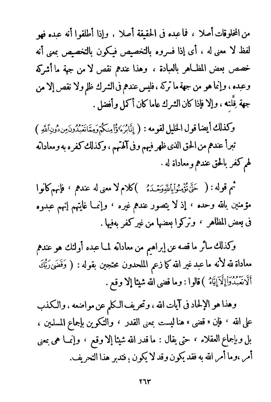 مِنْ الْمَخْلُوقَاتِ أَصْلًا فَمَا عَبَدَهُ فِي الْحَقِيقَةِ أَصْلًا وَإِذَا أَطْلَقُوا أَنَّهُ عَبَدَهُ فَهُوَ لَفْظٌ لَا مَعْنَى لَهُ أَيْ إذَا فَسَّرُوهُ بِالتَّخْصِيصِ فَيَكُونُ بِالتَّخْصِيصِ بِمَعْنَى أَنَّهُ خَصَّصَ بَعْضَ الْمَظَاهِرِ بِالْعِبَادَةِ وَهَذَا عِنْدَهُمْ نَقْصٌ لَا مِنْ جِهَةِ مَا أَشْرَكَهُ وَعَبَدَهُ وَإِنَّمَا هُوَ مِنْ جِهَةِ مَا تَرَكَهُ فَلَيْسَ عِنْدَهُمْ فِي الشِّرْكِ ظُلْمٌ وَلَا نَقْصٌ إلَّا مِنْ جِهَةِ قِلَّتِهِ وَإِلَّا فَإِذَا كَانَ الشِّرْكُ عَامًّا كَانَ أَكْمَلَ وَأَفْضَلَ. وَكَذَلِكَ أَيْضًا قَوْلُ الْخَلِيلِ لِقَوْمِهِ: {إنَّا بُرَآءُ مِنْكُمْ وَمِمَّا تَعْبُدُونَ مِنْ دُونِ اللَّهِ} تَبَرَّأَ عِنْدَهُمْ مِنْ الْحَقِّ الَّذِي ظَهَرَ فِيهِمْ وَفِي آلِهَتِهِمْ وَكَذَلِكَ كُفْرُهُ بِهِ وَمُعَادَاتُهُ لَهُمْ كُفْرٌ بِالْحَقِّ عِنْدَهُمْ وَمُعَادَاةٌ لَهُ. ثُمَّ قَوْلُهُ: {حَتَّى تُؤْمِنُوا بِاللَّهِ وَحْدَهُ} كَلَامٌ لَا مَعْنَى لَهُ عِنْدَهُمْ فَإِنَّهُمْ كَانُوا مُؤْمِنِينَ بِاَللَّهِ وَحْدَهُ إذْ لَا يُتَصَوَّرُ عِنْدَهُمْ غَيْرُهُ وَإِنَّمَا غَايَتُهُمْ أَنَّهُمْ عَبَدُوهُ فِي بَعْضِ الْمَظَاهِرِ وَتَرَكُوا بَعْضَهَا مِنْ غَيْرِ كُفْرٍ بِهِ فِيهَا. وَكَذَلِكَ سَائِرُ مَا قَصَّهُ عَنْ إبْرَاهِيمَ مِنْ مُعَادَاتِهِ لِمَا عَبَدَهُ أُولَئِكَ هُوَ عِنْدَهُمْ مُعَادَاةٌ لِلَّهِ لِأَنَّهُ مَا عَبَدَ غَيْرَ اللَّهِ كَمَا زَعَمَ الْمُلْحِدُونَ مُحْتَجِّينَ بِقَوْلِهِ: {وَقَضَى رَبُّكَ أَلَّا تَعْبُدُوا إلَّا إيَّاهُ} قَالُوا. وَمَا قَضَى اللَّهُ شَيْئًا إلَّا وَقَعَ. وَهَذَا هُوَ الْإِلْحَادُ فِي آيَاتِ اللَّهِ وَتَحْرِيفُ الْكَلِمِ عَنْ مَوَاضِعِهِ وَالْكَذِبُ عَلَى اللَّهِ فَإِنَّ " قَضَى " هُنَا لَيْسَتْ بِمَعْنَى الْقَدَرِ وَالتَّكْوِينِ بِإِجْمَاعِ الْمُسْلِمِينَ بَلْ وَبِإِجْمَاعِ الْعُقَلَاءِ حَتَّى يُقَالَ: مَا قَدَّرَ اللَّهُ شَيْئًا إلَّا وَقَعَ وَإِنَّمَا هِيَ بِمَعْنَى أَمَرَ وَمَا أَمَرَ اللَّهُ بِهِ فَقَدْ يَكُونُ وَقَدْ لَا يَكُونُ؛ فَتَدَبَّرْ هَذَا التَّحْرِيفَ.