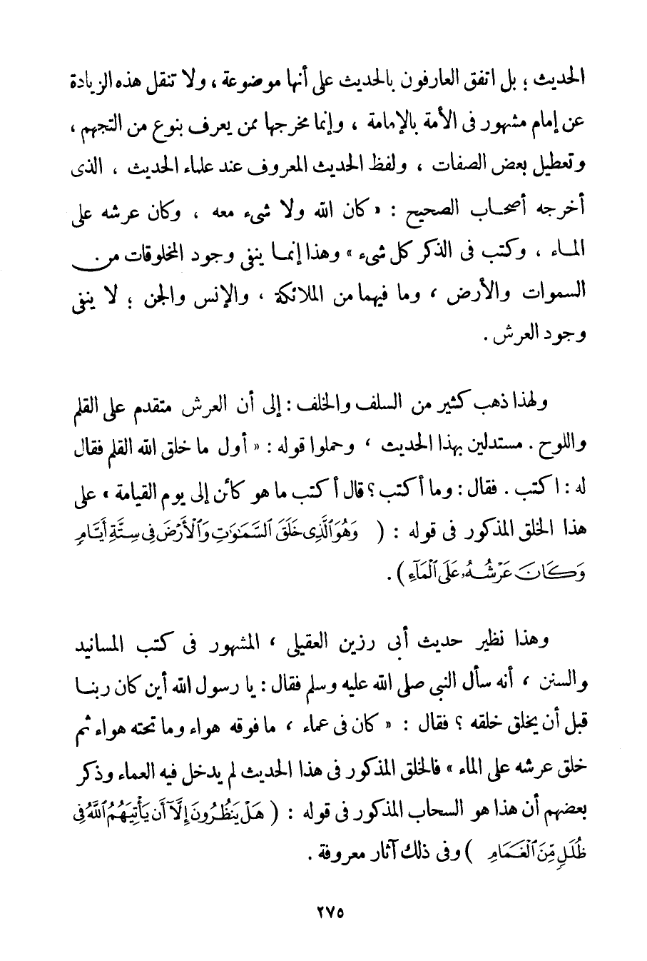بَلْ اتَّفَقَ الْعَارِفُونَ بِالْحَدِيثِ عَلَى أَنَّهَا مَوْضُوعَةٌ وَلَا تُنْقَلُ هَذِهِ الزِّيَادَةُ عَنْ إمَامٍ مَشْهُورٍ فِي الْأُمَّةِ بِالْإِمَامَةِ وَإِنَّمَا مَخْرَجُهَا مِمَّنْ يُعْرَفُ بِنَوْعِ مِنْ التَّجَهُّمِ وَتَعْطِيلِ بَعْضِ الصِّفَاتِ وَلَفْظُ الْحَدِيثِ الْمَعْرُوفِ عِنْدَ عُلَمَاءِ الْحَدِيثِ الَّذِي أَخْرَجَهُ أَصْحَابُ الصَّحِيحِ: {كَانَ اللَّهُ وَلَا شَيْءَ مَعَهُ وَكَانَ عَرْشُهُ عَلَى الْمَاءِ وَكَتَبَ فِي الذِّكْرِ كُلَّ شَيْءٍ} وَهَذَا إنَّمَا يَنْفِي وُجُودَ الْمَخْلُوقَاتِ مِنْ السَّمَوَاتِ وَالْأَرْضِ وَمَا فِيهِمَا مِنْ الْمَلَائِكَةِ وَالْإِنْسِ وَالْجِنِّ؛ لَا يَنْفِي وُجُودَ الْعَرْشِ. وَلِهَذَا ذَهَبَ كَثِيرٌ مِنْ السَّلَفِ وَالْخَلَفِ: إلَى أَنَّ الْعَرْشَ مُتَقَدِّمٌ عَلَى الْقَلَمِ وَاللَّوْحِ. مُسْتَدِلِّينَ بِهَذَا الْحَدِيثِ وَحَمَلُوا قَوْلَهُ: {أَوَّلُ مَا خَلَقَ اللَّهُ الْقَلَمَ فَقَالَ لَهُ: اُكْتُبْ فَقَالَ: وَمَا أَكْتُبُ؟ قَالَ اُكْتُبْ مَا هُوَ كَائِنٌ إلَى يَوْمِ الْقِيَامَةِ} عَلَى هَذَا الْخَلْقِ الْمَذْكُورِ فِي قَوْلِهِ: {وَهُوَ الَّذِي خَلَقَ السَّمَاوَاتِ وَالْأَرْضَ فِي سِتَّةِ أَيَّامٍ وَكَانَ عَرْشُهُ عَلَى الْمَاءِ} . وَهَذَا نَظِيرُ حَدِيثِ أَبِي رَزِينٍ العقيلي الْمَشْهُورِ فِي كُتُبِ الْمَسَانِيدِ وَالسُّنَنِ أَنَّهُ سَأَلَ النَّبِيَّ صَلَّى اللَّهُ عَلَيْهِ وَسَلَّمَ فَقَالَ: {يَا رَسُولَ اللَّهِ أَيْنَ كَانَ رَبُّنَا قَبْلَ أَنْ يَخْلُقَ خَلْقَهُ؟ فَقَالَ: كَانَ فِي عَمَاءٍ مَا فَوْقَهُ هَوَاءٌ وَمَا تَحْتَهُ هَوَاءٌ ثُمَّ خَلَقَ عَرْشَهُ عَلَى الْمَاءِ} فَالْخَلْقُ الْمَذْكُورُ فِي هَذَا الْحَدِيثِ لَمْ يَدْخُلْ فِيهِ الْعَمَاءُ وَذَكَرَ بَعْضُهُمْ أَنَّ هَذَا هُوَ السَّحَابُ الْمَذْكُورُ فِي قَوْلِهِ: {هَلْ يَنْظُرُونَ إلَّا أَنْ يَأْتِيَهُمُ اللَّهُ فِي ظُلَلٍ مِنَ الْغَمَامِ} وَفِي ذَلِكَ آثَارٌ مَعْرُوفَةٌ.