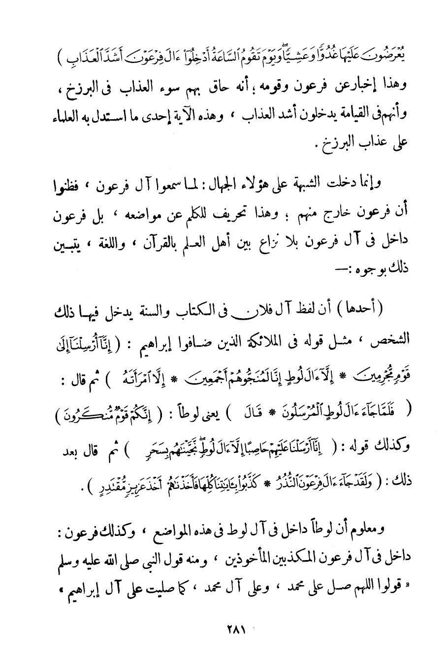 {النَّارُ يُعْرَضُونَ عَلَيْهَا غُدُوًّا وَعَشِيًّا وَيَوْمَ تَقُومُ السَّاعَةُ أَدْخِلُوا آلَ فِرْعَوْنَ أَشَدَّ الْعَذَابِ} وَهَذَا إخْبَارٌ عَنْ فِرْعَوْنَ وَقَوْمِهِ؛ أَنَّهُ حَاقَ بِهِمْ سُوءُ الْعَذَابِ فِي الْبَرْزَخِ وَأَنَّهُمْ فِي الْقِيَامَةِ يَدْخُلُونَ أَشَدَّ الْعَذَابِ وَهَذِهِ الْآيَةُ إحْدَى مَا اسْتَدَلَّ بِهِ الْعُلَمَاءُ عَلَى عَذَابِ الْبَرْزَخِ. وَإِنَّمَا دَخَلَتْ الشُّبْهَةُ عَلَى هَؤُلَاءِ الْجُهَّالِ: لَمَّا سَمِعُوا آلَ فِرْعَوْنَ فَظَنُّوا أَنَّ فِرْعَوْنَ خَارِجٌ مِنْهُمْ؛ وَهَذَا تَحْرِيفٌ لِلْكَلِمِ عَنْ مَوَاضِعِهِ بَلْ فِرْعَوْنُ دَاخِلٌ فِي آلِ فِرْعَوْنَ بِلَا نِزَاعٍ بَيْنَ أَهْلِ الْعِلْمِ بِالْقُرْآنِ وَاللُّغَةِ يَتَبَيَّنُ ذَلِكَ بِوُجُوهِ: - (أَحَدُهُمَا) أَنَّ لَفْظَ آلِ فُلَانٍ فِي الْكِتَابِ وَالسُّنَّةِ يَدْخُلُ فِيهَا ذَلِكَ الشَّخْصُ مِثْلُ قَوْلِهِ فِي الْمَلَائِكَةِ الَّذِينَ ضَافُوا إبْرَاهِيمَ: {إنَّا أُرْسِلْنَا إلَى قَوْمٍ مُجْرِمِينَ} {إلَّا آلَ لُوطٍ إنَّا لَمُنَجُّوهُمْ أَجْمَعِينَ} {إلَّا امْرَأَتَهُ} ثُمَّ قَالَ: {فَلَمَّا جَاءَ آلَ لُوطٍ الْمُرْسَلُونَ} {قَالَ} يَعْنِي لُوطًا: {إنَّكُمْ قَوْمٌ مُنْكَرُونَ} وَكَذَلِكَ قَوْلُهُ: {إنَّا أَرْسَلْنَا عَلَيْهِمْ حَاصِبًا إلَّا آلَ لُوطٍ نَجَّيْنَاهُمْ بِسَحَرٍ} ثُمَّ قَالَ بَعْدَ ذَلِكَ: {وَلَقَدْ جَاءَ آلَ فِرْعَوْنَ النُّذُرُ} {كَذَّبُوا بِآيَاتِنَا كُلِّهَا فَأَخَذْنَاهُمْ أَخْذَ عَزِيزٍ مُقْتَدِرٍ} . وَمَعْلُومٌ أَنَّ لُوطًا دَاخِلٌ فِي آلِ لُوطٍ فِي هَذِهِ الْمَوَاضِعِ، وكذلك فِرْعَوْنُ: دَاخِلٌ فِي آلِ فِرْعَوْنَ الْمُكَذِّبِينَ الْمَأْخُوذِينَ وَمِنْهُ قَوْلُ النَّبِيِّ صَلَّى اللَّهُ عَلَيْهِ وَسَلَّمَ {قُولُوا اللَّهُمَّ صَلِّ عَلَى مُحَمَّدٍ وَعَلَى آلِ مُحَمَّدٍ كَمَا صَلَّيْت عَلَى آلِ إبْرَاهِيمَ}