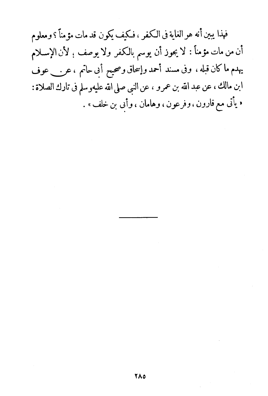 فَهَذَا يُبَيِّنُ أَنَّهُ هُوَ الْغَايَةُ فِي الْكُفْرِ فَكَيْفَ يَكُونُ قَدْ مَاتَ مُؤْمِنًا؟ وَمَعْلُومٌ أَنَّ مَنْ مَاتَ مُؤْمِنًا: لَا يَجُوزُ أَنْ يُوسَمَ بِالْكُفْرِ وَلَا يُوصَفَ؛ لِأَنَّ الْإِسْلَامَ يَهْدِمُ مَا كَانَ قَبْلَهُ وَفِي مُسْنَدِ أَحْمَدَ وَإِسْحَاقَ وَصَحِيحِ أَبِي حَاتِمٍ عَنْ عَوْفِ بْنِ مَالِكٍ عَنْ عَبْدِ اللَّهِ بْنِ عَمْرٍو {عَنْ النَّبِيِّ صَلَّى اللَّهُ عَلَيْهِ وَسَلَّمَ فِي تَارِكِ الصَّلَاةِ: يَأْتِي مَعَ قَارُونَ وَفِرْعَوْنَ وَهَامَانَ وأبي بْنِ خَلَفٍ} .