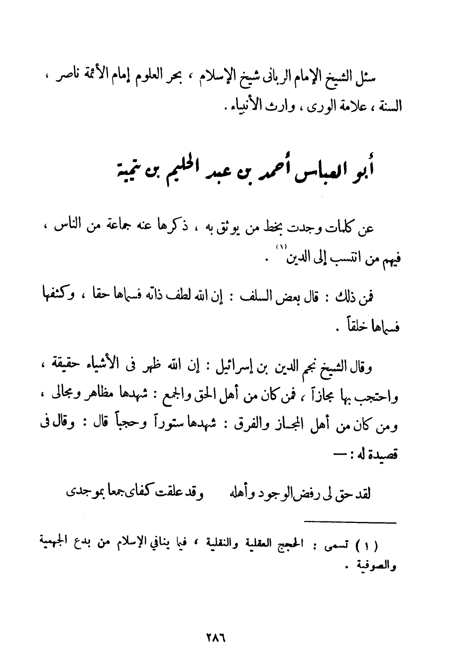 سُئِلَ الشَّيْخُ الْإِمَامُ الرَّبَّانِيُّ شَيْخُ الْإِسْلَامِ بَحْرُ الْعُلُومِ إمَامُ الْأَئِمَّةِ نَاصِرُ السُّنَّةِ عَلَّامَةُ الْوَرَى وَارِثُ الْأَنْبِيَاءِ. أَبُو الْعَبَّاسِ أَحْمَدُ بْنُ عَبْدِ الْحَلِيمِ ابْنُ تَيْمِيَّة - رَضِيَ اللَّهُ عَنْهُ -: