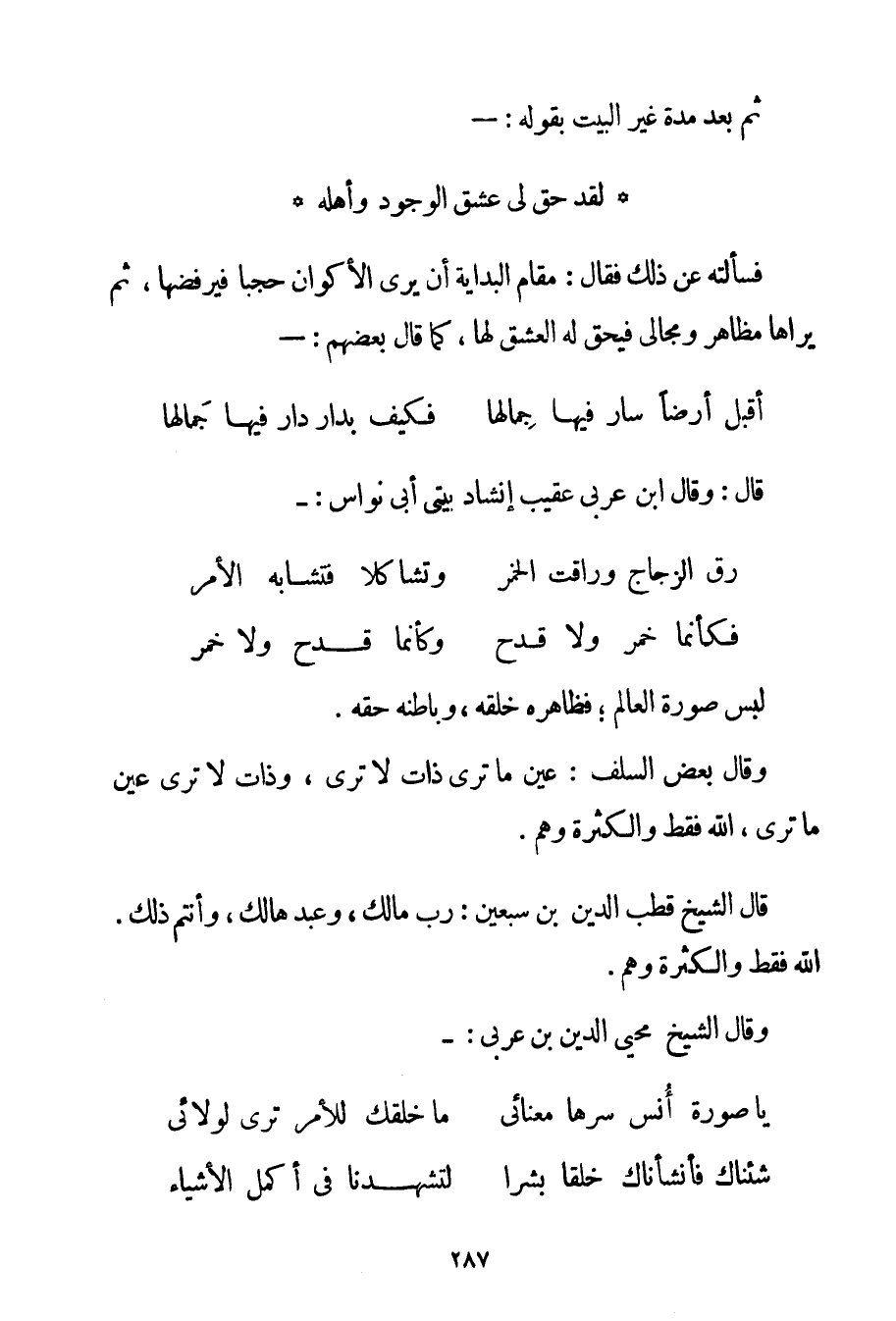 لَبِسَ صُورَةَ الْعَالَمِ؛ فَظَاهِرُهُ خَلْقُهُ وَبَاطِنُهُ حَقُّهُ. وَقَالَ بَعْضُ السَّلَفِ: عَيْنُ مَا تَرَى ذَاتٌ لَا تَرَى وَذَاتٌ لَا تَرَى عَيْنُ مَا تَرَى اللَّهُ فَقَطْ وَالْكَثْرَةُ وَهْمٌ. قَالَ الشَّيْخُ قُطْبُ الدِّينِ ابْنُ سَبْعِينَ: رَبٌّ مَالِكٌ وَعَبْدٌ هَالِكٌ وَأَنْتُمْ ذَلِكَ. اللَّهُ فَقَطْ وَالْكَثْرَةُ وَهْمٌ. وَقَالَ الشَّيْخُ مُحْيِي الدِّينِ ابْنُ عَرَبِيٍّ: