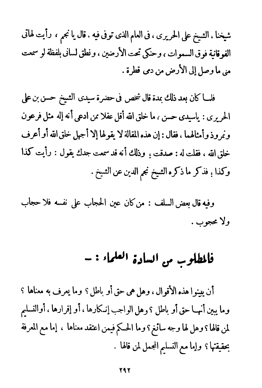شَيْخِنَا الشَّيْخِ عَلِيٍّ الْحَرِيرِيِّ فِي الْعَامِ الَّذِي تُوُفِّيَ فِيهِ قَالَ يَا نَجْمُ رَأَيْت لَهَاتِي الْفَوْقَانِيَّةَ فَوْقَ السَّمَوَاتِ وَحَنَكِي تَحْتَ الْأَرْضِينَ وَنَطَقَ لِسَانِي بِلَفْظَةِ لَوْ سُمِعَتْ مِنِّي مَا وَصَلَ إلَى الْأَرْضِ مِنْ دَمِي قَطْرَةٌ. فَلَمَّا كَانَ بَعْدَ ذَلِكَ بِمُدَّةِ قَالَ شَخْصٌ فِي حَضْرَةِ سَيِّدِي الشَّيْخِ حَسَنِ بْنِ عَلِيٍّ الْحَرِيرِيِّ: يَا سَيِّدِي حَسَنُ مَا خَلَقَ اللَّهُ أَقَلَّ عَقْلًا مِمَّنْ ادَّعَى أَنَّهُ إلَهٌ مِثْلُ فِرْعَوْنَ ونمروذ وَأَمْثَالِهِمَا فَقَالَ: إنَّ هَذِهِ الْمَقَالَةَ لَا يَقُولُهَا إلَّا أَجْهَلُ خَلْقِ اللَّهِ أَوْ أَعْرَفُ خَلْقِ اللَّهِ فَقُلْت لَهُ: صَدَقْت؛ وَذَلِكَ أَنَّهُ قَدْ سَمِعْت جَدَّك يَقُولُ: رَأَيْت كَذَا وَكَذَا؛ فَذَكَرَ مَا ذَكَرَهُ الشَّيْخُ نَجْمُ الدِّينِ عَنْ الشَّيْخِ. وَفِيهِ قَالَ بَعْضُ السَّلَفِ: مَنْ كَانَ عَيْنُ الْحِجَابِ عَلَى نَفْسِهِ فَلَا حِجَابَ وَلَا مَحْجُوبَ. فَالْمَطْلُوبُ مِنْ السَّادَةِ الْعُلَمَاءِ: - أَنْ يُبَيِّنُوا هَذِهِ الْأَقْوَالَ وَهَلْ هِيَ حَقٌّ أَوْ بَاطِلٌ؟ وَمَا يُعْرَفُ بِهِ مَعْنَاهَا؟ وَمَا يُبَيِّنُ أَنَّهَا حَقٌّ أَوْ بَاطِلٌ؟ وَهَلْ الْوَاجِبُ إنْكَارُهَا أَوْ إقْرَارُهَا أَوْ التَّسْلِيمُ لِمَنْ قَالَهَا؟ وَهَلْ لَهَا وَجْهٌ سَائِغٌ؟ وَمَا الْحُكْمُ فِيمَنْ اعْتَقَدَ مَعْنَاهَا إمَّا مَعَ الْمَعْرِفَةِ بِحَقِيقَتِهَا؟ وَإِمَّا مَعَ التَّسْلِيمِ الْمُجْمَلِ لِمَنْ قَالَهَا.