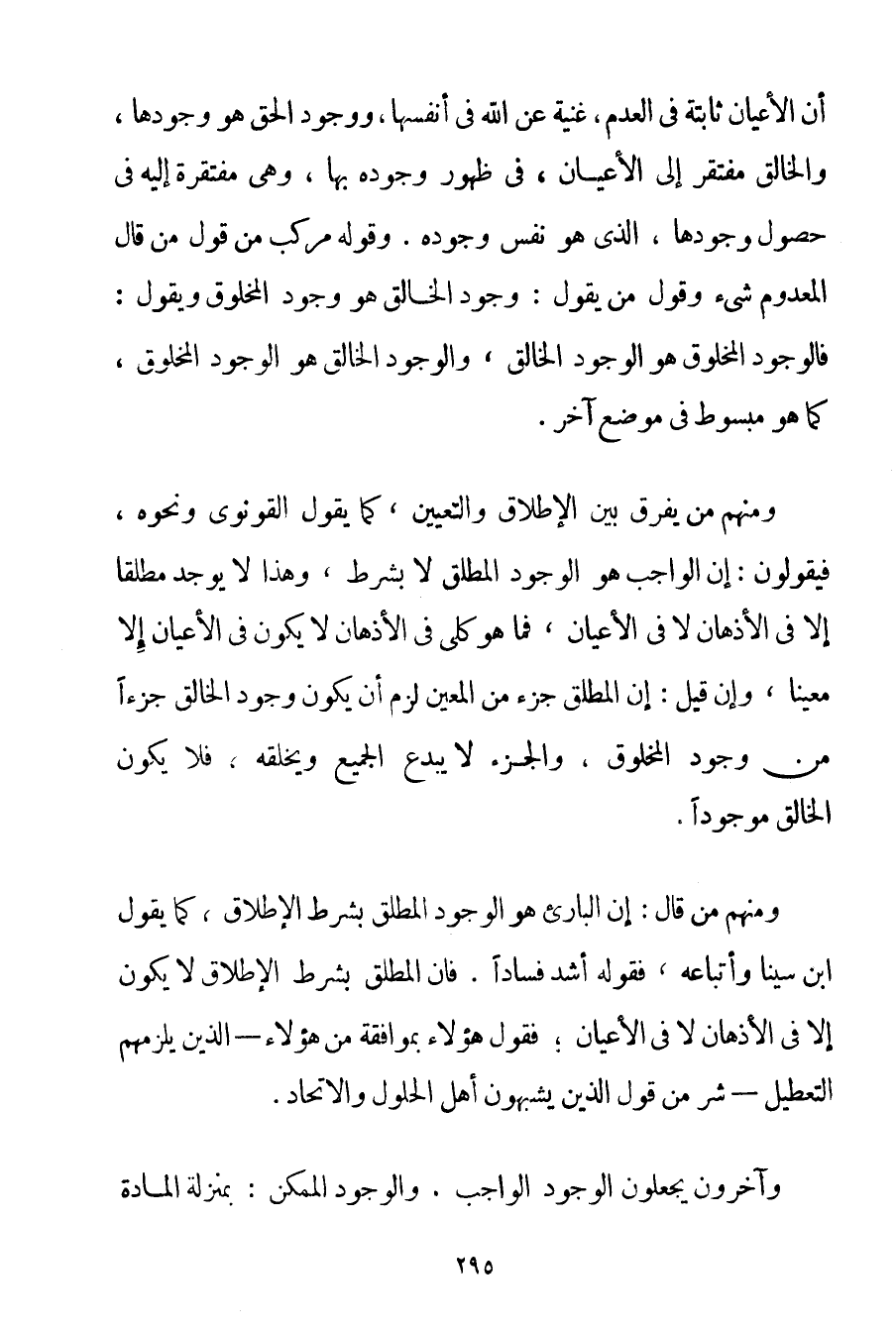 أَنَّ الْأَعْيَانَ ثَابِتَةٌ فِي الْعَدَمِ غَنِيَّةٌ عَنْ اللَّهِ فِي أَنْفُسِهَا وَوُجُودُ الْحَقِّ هُوَ وُجُودُهَا وَالْخَالِقُ مُفْتَقِرٌ إلَى الْأَعْيَانِ فِي ظُهُورِ وُجُودِهِ بِهَا وَهَى مُفْتَقِرَةٌ إلَيْهِ فِي حُصُولِ وُجُودِهَا الَّذِي هُوَ نَفْسُ وُجُودِهِ. وَقَوْلُهُ مُرَكَّبٌ مِنْ قَوْلِ مَنْ قَالَ الْمَعْدُومُ شَيْءٌ وَقَوْلِ مَنْ يَقُولُ: وُجُودُ الْخَالِقِ هُوَ وُجُودُ الْمَخْلُوقِ وَيَقُولُ: فَالْوُجُودُ الْمَخْلُوقُ هُوَ الْوُجُودُ الْخَالِقُ وَالْوُجُودُ الْخَالِقُ هُوَ الْوُجُودُ الْمَخْلُوقُ كَمَا هُوَ مَبْسُوطٌ فِي مَوْضِعٍ آخَرَ. وَمِنْهُمْ مَنْ يُفَرِّقُ بَيْنَ الْإِطْلَاقِ وَالتَّعْيِينِ كَمَا يَقُولُ القونوي وَنَحْوُهُ فَيَقُولُونَ: إنَّ الْوَاجِبَ هُوَ الْوُجُودُ الْمُطْلَقُ لَا بِشَرْطِ وَهَذَا لَا يُوجَدُ مُطْلَقًا إلَّا فِي الْأَذْهَانِ لَا فِي الْأَعْيَانِ فَمَا هُوَ كُلِّيٌّ فِي الْأَذْهَانِ لَا يَكُونُ فِي الْأَعْيَانِ إلَّا مُعَيَّنًا وَإِنْ قِيلَ: إنَّ الْمُطْلَقَ جُزْءٌ مِنْ الْمُعَيَّنِ لَزِمَ أَنْ يَكُونَ وُجُودُ الْخَالِقِ جُزْءًا مِنْ وُجُودِ الْمَخْلُوقِ وَالْجُزْءُ لَا يُبْدِعُ الْجَمِيعَ وَيَخْلُقُهُ فَلَا يَكُونُ الْخَالِقُ مَوْجُودًا. وَمِنْهُمْ مَنْ قَالَ: إنَّ الْبَارِئَ هُوَ الْوُجُودُ الْمُطْلَقُ بِشَرْطِ الْإِطْلَاقِ كَمَا يَقُولُ ابْنُ سِينَا وَأَتْبَاعُهُ فَقَوْلُهُ أَشَدُّ فَسَادًا. فَإِنَّ الْمُطْلَقَ بِشَرْطِ الْإِطْلَاقِ لَا يَكُونُ إلَّا فِي الْأَذْهَانِ لَا فِي الْأَعْيَانِ؛ فَقَوْلُ هَؤُلَاءِ بِمُوَافَقَةِ مِنْ هَؤُلَاءِ - الَّذِينَ يَلْزَمُهُمْ التَّعْطِيلُ - شَرٌّ مِنْ قَوْلِ الَّذِينَ يُشْبِهُونَ أَهْلَ الْحُلُولِ وَالِاتِّحَادِ. وَآخَرُونَ يَجْعَلُونَ الْوُجُودَ الْوَاجِبَ وَالْوُجُودَ الْمُمْكِنَ) بِمَنْزِلَةِ الْمَادَّةِ