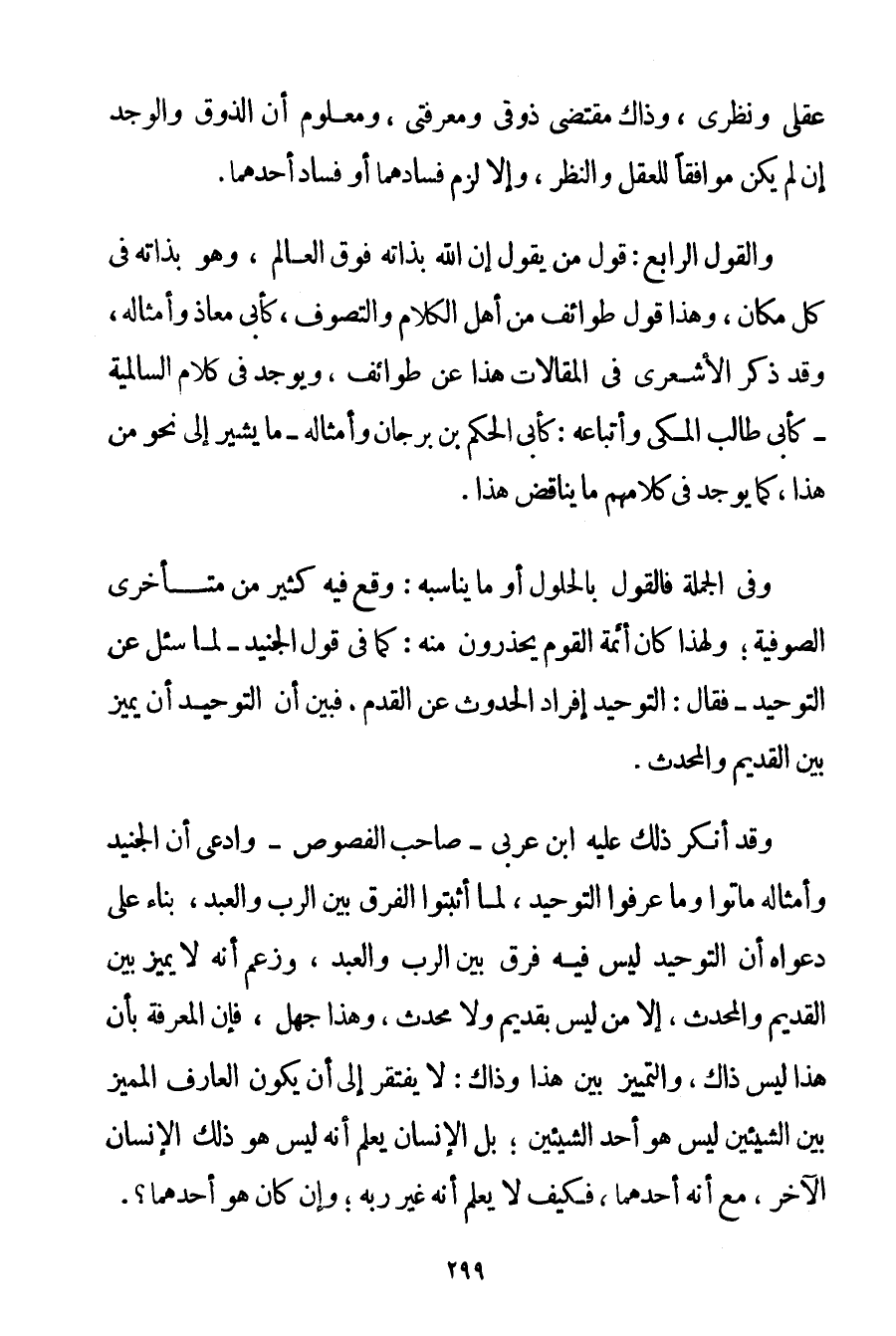 عَقْلِيٌّ وَنَظَرِيٌّ وَذَاكَ مُقْتَضًى ذَوْقِيٌّ ومعرفتي وَمَعْلُومٌ أَنَّ الذَّوْقَ وَالْوَجْدَ إنْ لَمْ يَكُنْ مُوَافِقًا لِلْعَقْلِ وَالنَّظَرِ وَإِلَّا لَزِمَ فَسَادُهُمَا أَوْ فَسَادُ أَحَدِهِمَا. (وَالْقَوْلُ الرَّابِعُ) قَوْلُ مَنْ يَقُولُ إنَّ اللَّهَ بِذَاتِهِ فَوْقَ الْعَالَمِ وَهُوَ بِذَاتِهِ فِي كُلِّ مَكَانٍ وَهَذَا قَوْلُ طَوَائِفَ مِنْ أَهْلِ الْكَلَامِ وَالتَّصَوُّفِ كَأَبِي مُعَاذٍ وَأَمْثَالِهِ وَقَدْ ذَكَرَ الْأَشْعَرِيُّ فِي الْمَقَالَاتِ هَذَا عَنْ طَوَائِفَ وَيُوجَدُ فِي كَلَامِ - السالمية - كَأَبِي طَالِبٍ الْمَكِّيِّ وَأَتْبَاعِهِ: كَأَبِي الْحَكَمِ بْنِ برجان وَأَمْثَالِهِ - مَا يُشِيرُ إلَى نَحْوٍ مَنْ هَذَا كَمَا يُوجَدُ فِي كَلَامِهِمْ مَا يُنَاقِضُ هَذَا. وَفِي الْجُمْلَةِ فَالْقَوْلُ بِالْحُلُولِ أَوْ مَا يُنَاسِبُهُ: وَقَعَ فِيهِ كَثِيرٌ مِنْ مُتَأَخِّرِي الصُّوفِيَّةِ؛ وَلِهَذَا كَانَ أَئِمَّةُ الْقَوْمِ يُحَذِّرُونَ مِنْهُ: كَمَا فِي قَوْلِ الْجُنَيْد - لَمَّا سُئِلَ عَنْ التَّوْحِيدِ - فَقَالَ: التَّوْحِيدُ إفْرَادُ الْحُدُوثِ عَنْ الْقِدَمِ فَبَيَّنَ أَنَّ التَّوْحِيدَ أَنْ يُمَيَّزَ بَيْنَ الْقَدِيمِ وَالْمُحْدَثِ. وَقَدْ أَنْكَرَ ذَلِكَ عَلَيْهِ ابْنُ عَرَبِيٍّ - صَاحِبُ الْفُصُوصِ - وَادَّعَى أَنَّ الْجُنَيْد وَأَمْثَالَهُ مَاتُوا وَمَا عَرَفُوا التَّوْحِيدَ لَمَّا أَثْبَتُوا الْفَرْقَ بَيْنَ الرَّبِّ وَالْعَبْدِ بِنَاءً عَلَى دَعْوَاهُ أَنَّ التَّوْحِيدَ لَيْسَ فِيهِ فَرْقٌ بَيْنَ الرَّبِّ وَالْعَبْدِ وَزَعَمَ أَنَّهُ لَا يُمَيِّزُ بَيْنَ الْقَدِيمِ وَالْمُحْدَثِ إلَّا مَنْ لَيْسَ بِقَدِيمِ وَلَا مُحْدَثٍ وَهَذَا جَهْلٌ فَإِنَّ الْمَعْرِفَةَ بِأَنَّ هَذَا لَيْسَ ذَاكَ وَالتَّمْيِيزُ بَيْنَ هَذَا وَذَاكَ: لَا يَفْتَقِرُ إلَى أَنْ يَكُونَ الْعَارِفُ الْمُمَيِّزُ بَيْنَ الشَّيْئَيْنِ لَيْسَ هُوَ أَحَدَ الشَّيْئَيْنِ؛ بَلْ الْإِنْسَانُ يَعْلَمُ أَنَّهُ لَيْسَ هُوَ ذَلِكَ الْإِنْسَانُ الْآخَرُ مَعَ أَنَّهُ أَحَدُهُمَا فَكَيْفَ لَا يَعْلَمُ أَنَّهُ غَيْرُ رَبِّهِ؛ وَإِنْ كَانَ هُوَ أَحَدَهُمَا؟ .