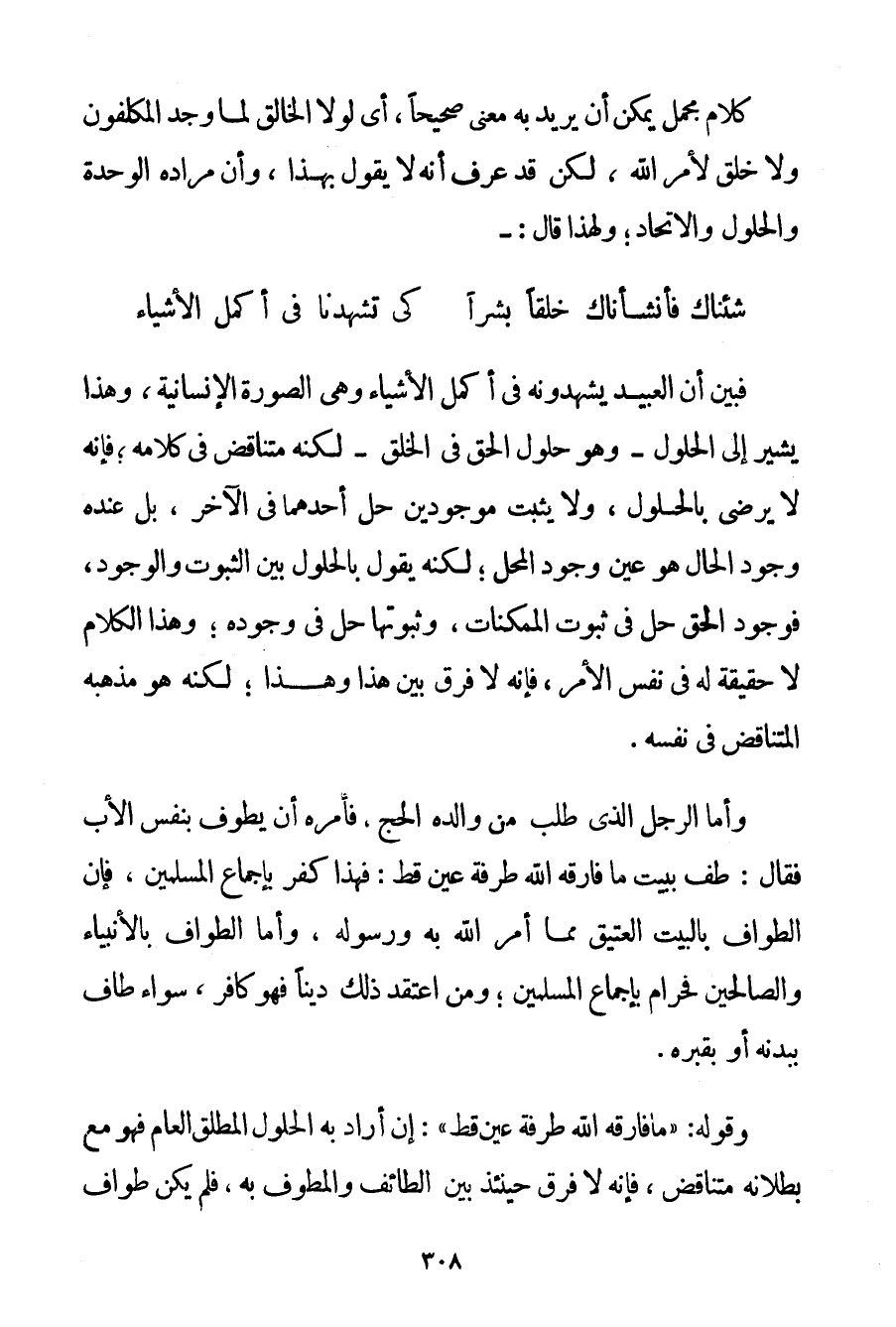 وَأَمَّا الرَّجُلُ الَّذِي طَلَبَ مِنْ وَالِدِهِ الْحَجَّ فَأَمَرَهُ أَنْ يَطُوفَ بِنَفْسِ الْأَبِ فَقَالَ: طُفْ بِبَيْتِ مَا فَارَقَهُ اللَّهُ طَرْفَةَ عَيْنٍ قَطُّ ": فَهَذَا كُفْرٌ بِإِجْمَاعِ الْمُسْلِمِينَ فَإِنَّ الطَّوَافَ بِالْبَيْتِ الْعَتِيقِ مِمَّا أَمَرَ اللَّهُ بِهِ وَرَسُولُهُ وَأَمَّا الطَّوَافُ بِالْأَنْبِيَاءِ وَالصَّالِحِينَ فَحَرَامٌ بِإِجْمَاعِ الْمُسْلِمِينَ؛ وَمَنْ اعْتَقَدَ ذَلِكَ دِينًا فَهُوَ كَافِرٌ سَوَاءٌ طَافَ بِبَدَنِهِ أَوْ بِقَبْرِهِ. وَقَوْلُهُ: " مَا فَارَقَهُ اللَّهُ طَرْفَةَ عَيْنٍ قَطُّ ": إنْ أَرَادَ بِهِ الْحُلُولَ الْمُطْلَقَ الْعَامَّ فَهُوَ مَعَ بُطْلَانِهِ مُتَنَاقِضٌ فَإِنَّهُ لَا فَرْقَ حِينَئِذٍ بَيْنَ الطَّائِفِ وَالْمَطُوفِ بِهِ فَلَمْ يَكُنْ طَوَافٌ