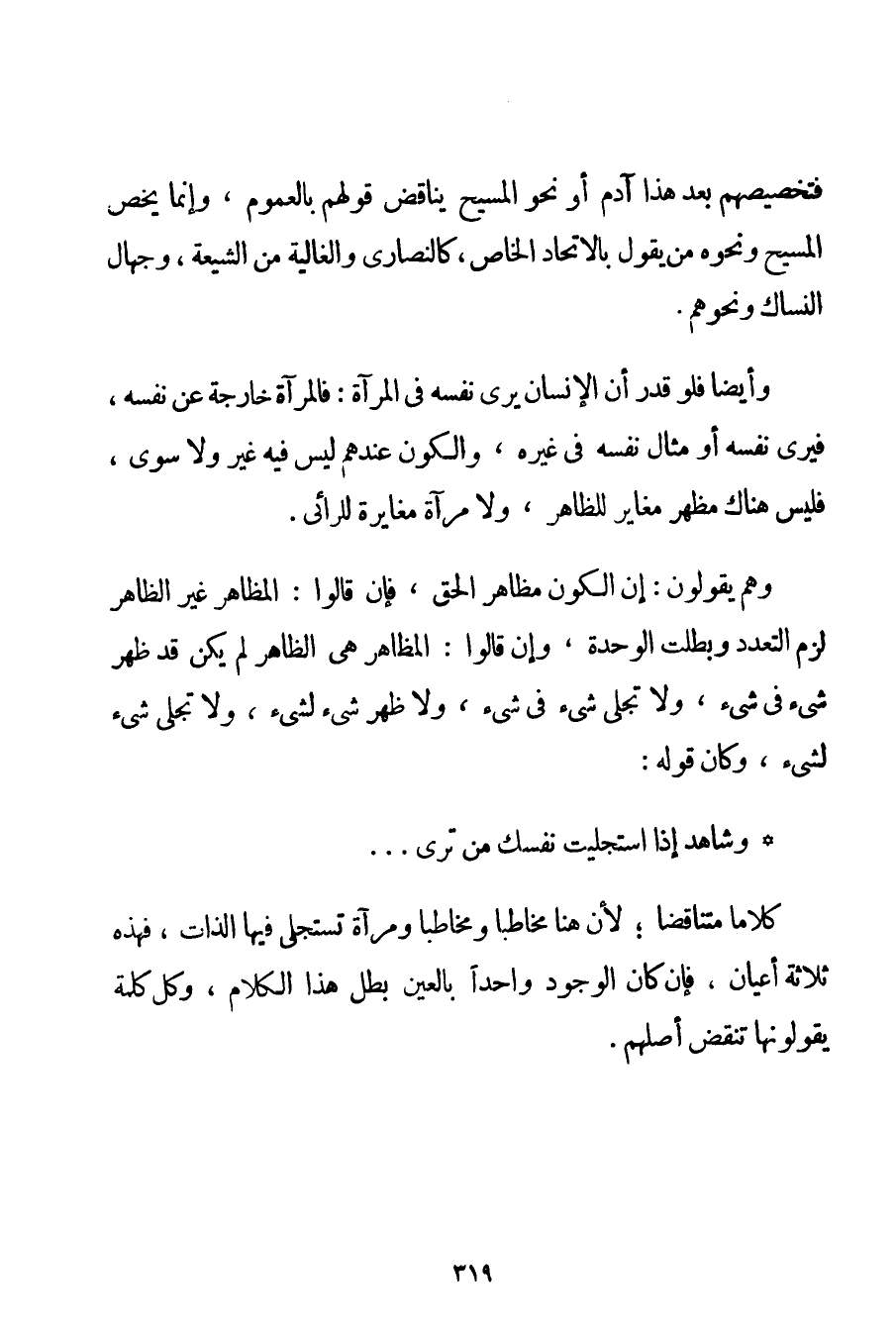 كَلَامًا مُتَنَاقِضًا؛ لِأَنَّ هُنَا مُخَاطِبًا وَمُخَاطَبًا وَمِرْآةً تُسْتَجْلَى فِيهَا الذَّاتُ فَهَذِهِ ثَلَاثَةُ أَعْيَانٍ فَإِنْ كَانَ الْوُجُودُ وَاحِدًا بِالْعَيْنِ بَطَلَ هَذَا الْكَلَامُ وَكُلُّ كَلِمَةٍ يَقُولُونَهَا تَنْقُضُ أَصْلَهُمْ.
