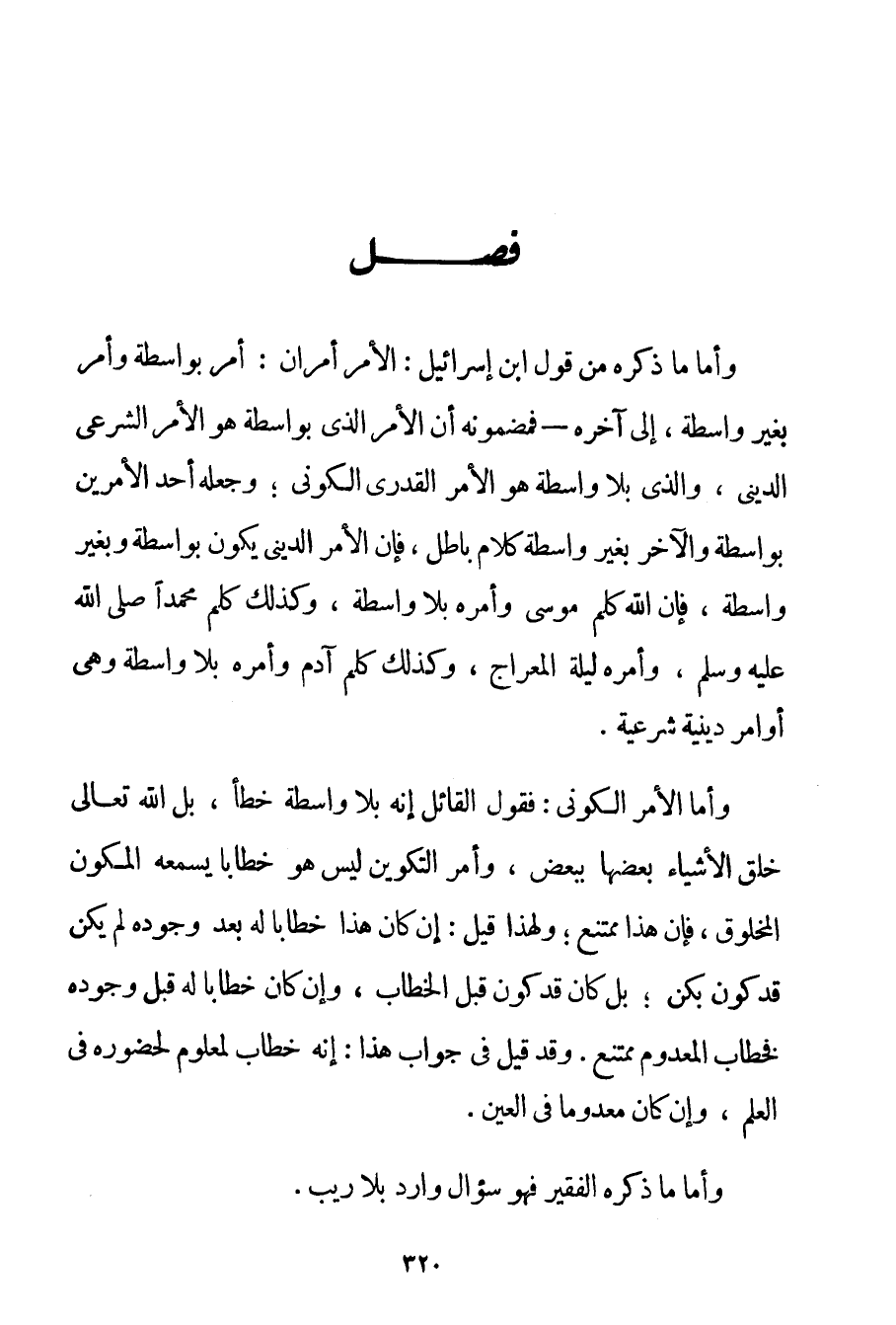 وَأَمَّا مَا ذَكَرَهُ مِنْ قَوْلِ ابْنِ إسْرَائِيلَ: الْأَمْرُ أَمْرَانِ: أَمْرٌ بِوَاسِطَةِ وَأَمْرٌ بِغَيْرِ وَاسِطَةٍ إلَى آخِرِهِ - فَمَضْمُونُهُ أَنَّ الْأَمْرَ الَّذِي بِوَاسِطَةِ هُوَ الْأَمْرُ الشَّرْعِيُّ الدِّينِيُّ وَاَلَّذِي بَلَا وَاسِطَةٍ هُوَ الْأَمْرُ الْقَدَرِيُّ الْكَوْنِيُّ؛ وَجَعْلُهُ أَحَدَ الْأَمْرَيْنِ بِوَاسِطَةِ وَالْآخَرَ بِغَيْرِ وَاسِطَةٍ كَلَامٌ بَاطِلٌ فَإِنَّ الْأَمْرَ الدِّينِيَّ يَكُونُ بِوَاسِطَةِ وَبِغَيْرِ وَاسِطَةٍ فَإِنَّ اللَّهَ كَلَّمَ مُوسَى وَأَمَرَهُ بِلَا وَاسِطَةٍ وَكَذَلِكَ كَلَّمَ مُحَمَّدًا صَلَّى اللَّهُ عَلَيْهِ وَسَلَّمَ وَأَمَرَهُ لَيْلَةَ الْمِعْرَاجِ وَكَذَلِكَ كَلَّمَ آدَمَ وَأَمَرَهُ بِلَا وَاسِطَةٍ وَهِيَ أَوَامِرُ دِينِيَّةٌ شَرْعِيَّةٌ. وَأَمَّا الْأَمْرُ الْكَوْنِيُّ: فَقَوْلُ الْقَائِلِ إنَّهُ بِلَا وَاسِطَةٍ خَطَأٌ بَلْ اللَّهُ تَعَالَى خَلَقَ الْأَشْيَاءَ بَعْضَهَا بِبَعْضِ وَأَمْرُ التَّكْوِينِ لَيْسَ هُوَ خِطَابًا يَسْمَعُهُ الْمُكَوَّنُ الْمَخْلُوقُ فَإِنَّ هَذَا مُمْتَنِعٌ؛ وَلِهَذَا قِيلَ: إنْ كَانَ هَذَا خِطَابًا لَهُ بَعْدَ وُجُودِهِ لَمْ يَكُنْ قَدْ كُوِّنَ بكن؛ بَلْ كَانَ قَدْ كُوِّنَ قَبْلَ الْخِطَابِ وَإِنْ كَانَ خِطَابًا لَهُ قَبْلَ وُجُودِهِ فَخِطَابُ الْمَعْدُومِ مُمْتَنِعٌ. وَقَدْ قِيلَ فِي جَوَابِ هَذَا: إنَّهُ خِطَابٌ لِمَعْلُومِ لِحُضُورِهِ فِي الْعِلْمِ وَإِنْ كَانَ مَعْدُومًا فِي الْعَيْنِ. وَأَمَّا مَا ذَكَرَهُ الْفَقِيرُ فَهُوَ سُؤَالٌ وَارِدٌ بِلَا رَيْبٍ.