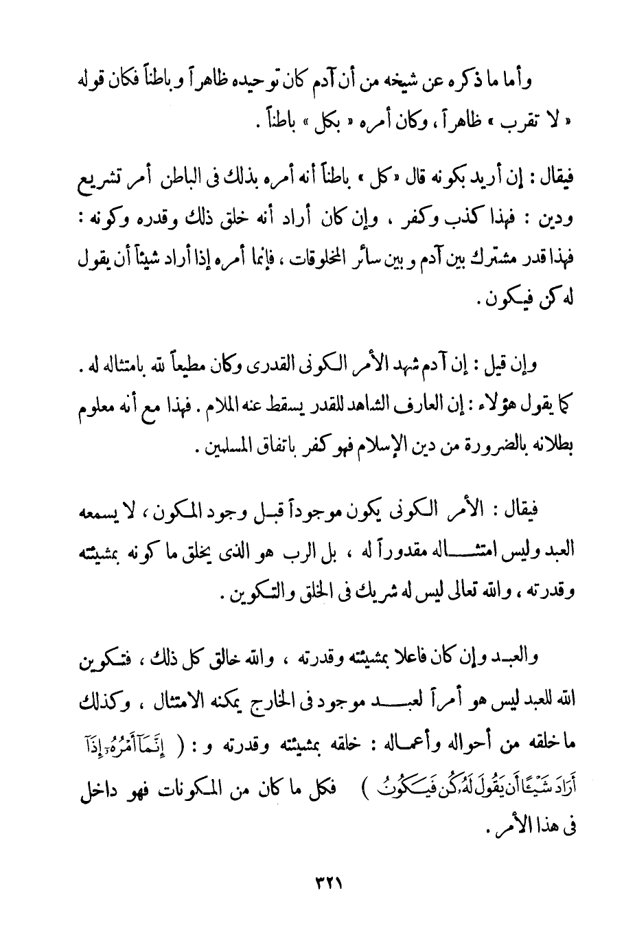 وَأَمَّا مَا ذَكَرَهُ عَنْ شَيْخِهِ مِنْ أَنَّ آدَمَ كَانَ تَوْحِيدُهُ ظَاهِرًا وَبَاطِنًا فَكَانَ قَوْلُهُ " لَا تَقْرَبْ " ظَاهِرًا وَكَانَ أَمْرُهُ " بكل " بَاطِنًا. فَيُقَالُ: إنْ أُرِيدَ بِكَوْنِهِ قَالَ " كُلْ " بَاطِنًا أَنَّهُ أَمَرَهُ بِذَلِكَ فِي الْبَاطِنِ أَمْرَ تَشْرِيعٍ وَدِينٍ: فَهَذَا كَذِبٌ وَكُفْرٌ وَإِنْ كَانَ أَرَادَ أَنَّهُ خَلَقَ ذَلِكَ وَقَدَّرَهُ وَكَوَّنَهُ: فَهَذَا قَدَرٌ مُشْتَرَكٌ بَيْنَ آدَمَ وَبَيْنَ سَائِرِ الْمَخْلُوقَاتِ فَإِنَّمَا أَمْرُهُ إذَا أَرَادَ شَيْئًا أَنْ يَقُولَ لَهُ كُنْ فَيَكُونُ. وَإِنْ قِيلَ: إنَّ آدَمَ شَهِدَ الْأَمْرَ الْكَوْنِيَّ الْقَدَرِيَّ وَكَانَ مُطِيعًا لِلَّهِ بِامْتِثَالِهِ لَهُ. كَمَا يَقُولُ هَؤُلَاءِ: إنَّ الْعَارِفَ الشَّاهِدَ لِلْقَدَرِ يَسْقُطُ عَنْهُ الْمُلَامُ. فَهَذَا مَعَ أَنَّهُ مَعْلُومٌ بُطْلَانُهُ بِالضَّرُورَةِ مِنْ دِينِ الْإِسْلَامِ فَهُوَ كُفْرٌ بِاتِّفَاقِ الْمُسْلِمِينَ. فَيُقَالُ: الْأَمْرُ الْكَوْنِيُّ يَكُونُ مَوْجُودًا قَبْلَ وُجُودِ الْمُكَوَّنِ لَا يَسْمَعُهُ الْعَبْدُ وَلَيْسَ امْتِثَالُهُ مَقْدُورًا لَهُ بَلْ الرَّبُّ هُوَ الَّذِي يَخْلُقُ مَا كَوَّنَهُ بِمَشِيئَتِهِ وَقُدْرَتِهِ وَاَللَّهُ تَعَالَى لَيْسَ لَهُ شَرِيكٌ فِي الْخَلْقِ وَالتَّكْوِينِ. وَالْعَبْدُ وَإِنْ كَانَ فَاعِلًا بِمَشِيئَتِهِ وَقُدْرَتِهِ وَاَللَّهُ خَالِقُ كُلِّ ذَلِكَ فَتَكْوِينُ اللَّهِ لِلْعَبْدِ لَيْسَ هُوَ أَمْرًا لِعَبْدِ مَوْجُودٍ فِي الْخَارِجِ يُمْكِنُهُ الِامْتِثَالُ وَكَذَلِكَ مَا خَلَقَهُ مِنْ أَحْوَالِهِ وَأَعْمَالِهِ: خَلَقَهُ بِمَشِيئَتِهِ وَقُدْرَتِهِ و: {إنَّمَا أَمْرُهُ إذَا أَرَادَ شَيْئًا أَنْ يَقُولَ لَهُ كُنْ فَيَكُونُ} فَكُلُّ مَا كَانَ مِنْ الْمُكَوَّنَاتِ فَهُوَ دَاخِلٌ فِي هَذَا الْأَمْرِ.