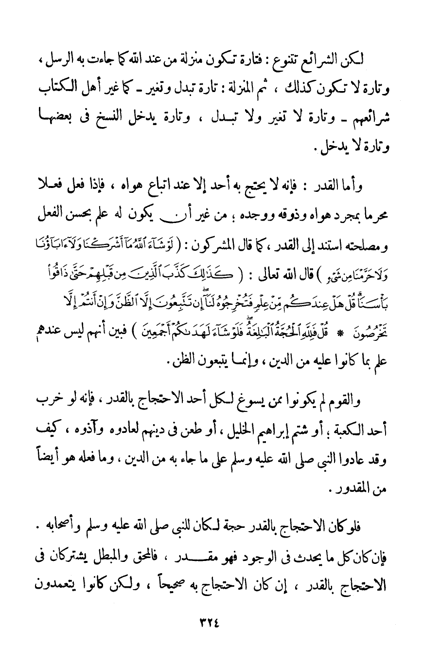 لَكِنَّ الشَّرَائِعَ تَتَنَوَّعُ: فَتَارَةً تَكُونُ مُنَزَّلَةً مِنْ عِنْدِ اللَّهِ كَمَا جَاءَتْ بِهِ الرُّسُلُ وَتَارَةً لَا تَكُونُ كَذَلِكَ ثُمَّ الْمَنْزِلَةُ: تَارَةً تُبَدَّلُ وَتُغَيَّرُ - كَمَا غَيَّرَ أَهْلُ الْكِتَابِ شَرَائِعَهُمْ - وَتَارَةً لَا تُغَيَّرُ وَلَا تُبَدَّلُ وَتَارَةً يَدْخُلُ النَّسْخُ فِي بَعْضِهَا وَتَارَةً لَا يَدْخُلُ. وَأَمَّا الْقَدَرُ: فَإِنَّهُ لَا يَحْتَجُّ بِهِ أَحَدٌ إلَّا عِنْدَ اتِّبَاعِ هَوَاهُ فَإِذَا فَعَلَ فِعْلًا مُحَرَّمًا بِمُجَرَّدِ هَوَاهُ وَذَوْقِهِ وَوَجْدِهِ؛ مِنْ غَيْرِ أَنْ يَكُونَ لَهُ عِلْمٌ بِحُسْنِ الْفِعْلِ وَمَصْلَحَتِهِ اسْتَنَدَ إلَى الْقَدَرِ كَمَا قَالَ الْمُشْرِكُونَ: {لَوْ شَاءَ اللَّهُ مَا أَشْرَكْنَا وَلَا آبَاؤُنَا وَلَا حَرَّمْنَا مِنْ شَيْءٍ} قَالَ اللَّهُ تَعَالَى: {كَذَلِكَ كَذَّبَ الَّذِينَ مِنْ قَبْلِهِمْ حَتَّى ذَاقُوا بَأْسَنَا قُلْ هَلْ عِنْدَكُمْ مِنْ عِلْمٍ فَتُخْرِجُوهُ لَنَا إنْ تَتَّبِعُونَ إلَّا الظَّنَّ وَإِنْ أَنْتُمْ إلَّا تَخْرُصُونَ} {قُلْ فَلِلَّهِ الْحُجَّةُ الْبَالِغَةُ فَلَوْ شَاءَ لَهَدَاكُمْ أَجْمَعِينَ} فَبَيَّنَ أَنَّهُمْ لَيْسَ عِنْدَهُمْ عِلْمٌ بِهَا كَانُوا عَلَيْهِ مِنْ الدِّينِ وَإِنَّمَا يَتَّبِعُونَ الظَّنَّ. وَالْقَوْمُ لَمْ يَكُونُوا مِمَّنْ يَسُوغُ لِكُلِّ أَحَدٍ الِاحْتِجَاجُ بِالْقَدَرِ فَإِنَّهُ لَوْ خَرَّبَ أَحَدٌ الْكَعْبَةَ؛ أَوْ شَتَمَ إبْرَاهِيمَ الْخَلِيلَ أَوْ طَعَنَ فِي دِينِهِمْ لَعَادَوْهُ وَآذَوْهُ كَيْفَ وَقَدْ عَادَوْا النَّبِيَّ صَلَّى اللَّهُ عَلَيْهِ وَسَلَّمَ عَلَى مَا جَاءَ بِهِ مِنْ الدِّينِ وَمَا فَعَلَهُ هُوَ أَيْضًا مِنْ الْمَقْدُورِ. فَلَوْ كَانَ الِاحْتِجَاجُ بِالْقَدَرِ حُجَّةً لَكَانَ لِلنَّبِيِّ صَلَّى اللَّهُ عَلَيْهِ وَسَلَّمَ وَأَصْحَابِهِ. فَإِنْ كَانَ كُلُّ مَا يَحْدُثُ فِي الْوُجُودِ فَهُوَ مُقَدَّرٌ فَالْمُحِقُّ وَالْمُبْطِلُ يَشْتَرِكَانِ فِي الِاحْتِجَاجِ بِالْقَدَرِ إنْ كَانَ الِاحْتِجَاجُ بِهِ صَحِيحًا وَلَكِنْ كَانُوا يَتَعَمَّدُونَ عَلَى