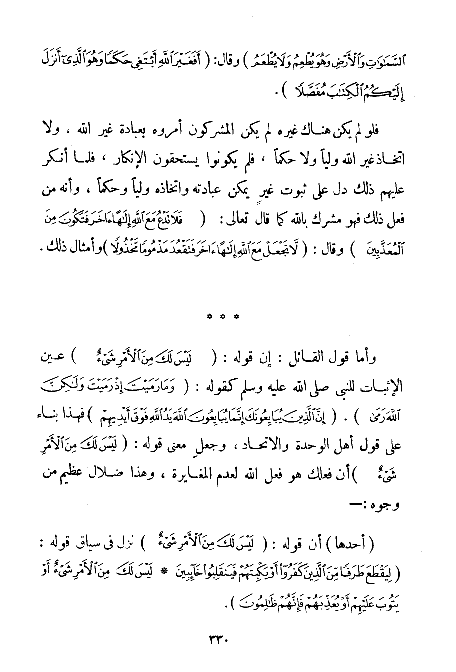 وَأَمَّا قَوْلُ الْقَائِلِ: إنَّ قَوْلَهُ: {لَيْسَ لَكَ مِنَ الْأَمْرِ شَيْءٌ} عَيْنُ الْإِثْبَاتِ لِلنَّبِيِّ صَلَّى اللَّهُ عَلَيْهِ وَسَلَّمَ كَقَوْلِهِ: {وَمَا رَمَيْتَ إذْ رَمَيْتَ وَلَكِنَّ اللَّهَ رَمَى} . {إنَّ الَّذِينَ يُبَايِعُونَكَ إنَّمَا يُبَايِعُونَ اللَّهَ يَدُ اللَّهِ فَوْقَ أَيْدِيهِمْ} فَهَذَا بِنَاءً عَلَى قَوْلِ أَهْلِ الْوَحْدَةِ وَالِاتِّحَادِ وَجُعِلَ مَعْنَى قَوْلِهِ: {لَيْسَ لَكَ مِنَ الْأَمْرِ شَيْءٌ} أَنَّ فِعْلَك هُوَ فِعْلُ اللَّهِ لِعَدَمِ الْمُغَايَرَةِ وَهَذَا ضَلَالٌ عَظِيمٌ مِنْ وُجُوهٍ: