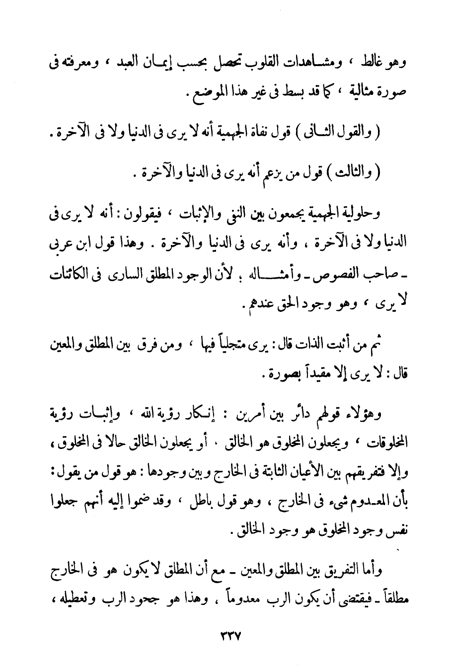 وَهُوَ غالط وَمُشَاهَدَاتُ الْقُلُوبِ تَحْصُلُ بِحَسَبِ إيمَانِ الْعَبْدِ وَمَعْرِفَتِهِ فِي صُورَةٍ مِثَالِيَّةٍ كَمَا قَدْ بُسِطَ فِي غَيْرِ هَذَا الْمَوْضِعِ. (وَالْقَوْلُ الثَّانِي) قَوْلُ نفاة الْجَهْمِيَّة أَنَّهُ لَا يَرَى فِي الدُّنْيَا وَلَا فِي الْآخِرَةِ. (وَالثَّالِثُ) قَوْلُ مَنْ يَزْعُمُ أَنَّهُ يَرَى فِي الدُّنْيَا وَالْآخِرَةِ. وَحُلُولِيَّةُ الْجَهْمِيَّة يَجْمَعُونَ بَيْنَ النَّفْيِ وَالْإِثْبَاتِ فَيَقُولُونَ: إنَّهُ لَا يَرَى فِي الدُّنْيَا وَلَا فِي الْآخِرَةِ وَإِنَّهُ يَرَى فِي الدُّنْيَا وَالْآخِرَةِ. وَهَذَا قَوْلُ ابْنِ عَرَبِيٍّ - صَاحِبِ الْفُصُوصِ - وَأَمْثَالِهِ؛ لِأَنَّ الْوُجُودَ الْمُطْلَقَ السَّارِيَ فِي الْكَائِنَاتِ لَا يُرَى وَهُوَ وُجُودُ الْحَقِّ عِنْدَهُمْ. ثُمَّ مَنْ أَثْبَتَ الذَّاتَ قَالَ: يَرَى مُتَجَلِّيًا فِيهَا وَمَنْ فَرَّقَ بَيْنَ الْمُطْلَقِ وَالْمُعَيَّنِ قَالَ: لَا يَرَى إلَّا مُقَيَّدًا بِصُورَةِ. وَهَؤُلَاءِ قَوْلُهُمْ دَائِرٌ بَيْنَ أَمْرَيْنِ: إنْكَارُ رُؤْيَةِ اللَّهِ وَإِثْبَاتُ رُؤْيَةِ الْمَخْلُوقَاتِ وَيَجْعَلُونَ الْمَخْلُوقَ هُوَ الْخَالِقُ أَوْ يَجْعَلُونَ الْخَالِقَ حَالًّا فِي الْمَخْلُوقِ وَإِلَّا فَتَفْرِيقُهُمْ بَيْنَ الْأَعْيَانِ الثَّابِتَةِ فِي الْخَارِجِ وَبَيْنَ وُجُودهَا: هُوَ قَوْلُ مَنْ يَقُولُ: بِأَنَّ الْمَعْدُومَ شَيْءٌ فِي الْخَارِجِ وَهُوَ قَوْلٌ بَاطِلٌ وَقَدْ ضَمُّوا إلَيْهِ أَنَّهُمْ جَعَلُوا نَفْسَ وُجُودِ الْمَخْلُوقِ هُوَ وُجُودُ الْخَالِقِ. وَأَمَّا التَّفْرِيقُ بَيْنَ الْمُطْلَقِ وَالْمُعَيَّنِ -) مَعَ أَنَّ الْمُطْلَقَ لَا يَكُونُ هُوَ فِي الْخَارِجِ مُطْلَقًا - فَيَقْتَضِي أَنْ يَكُونَ الرَّبُّ مَعْدُومًا وَهَذَا هُوَ جُحُودُ الرَّبِّ وَتَعْطِيلُهُ