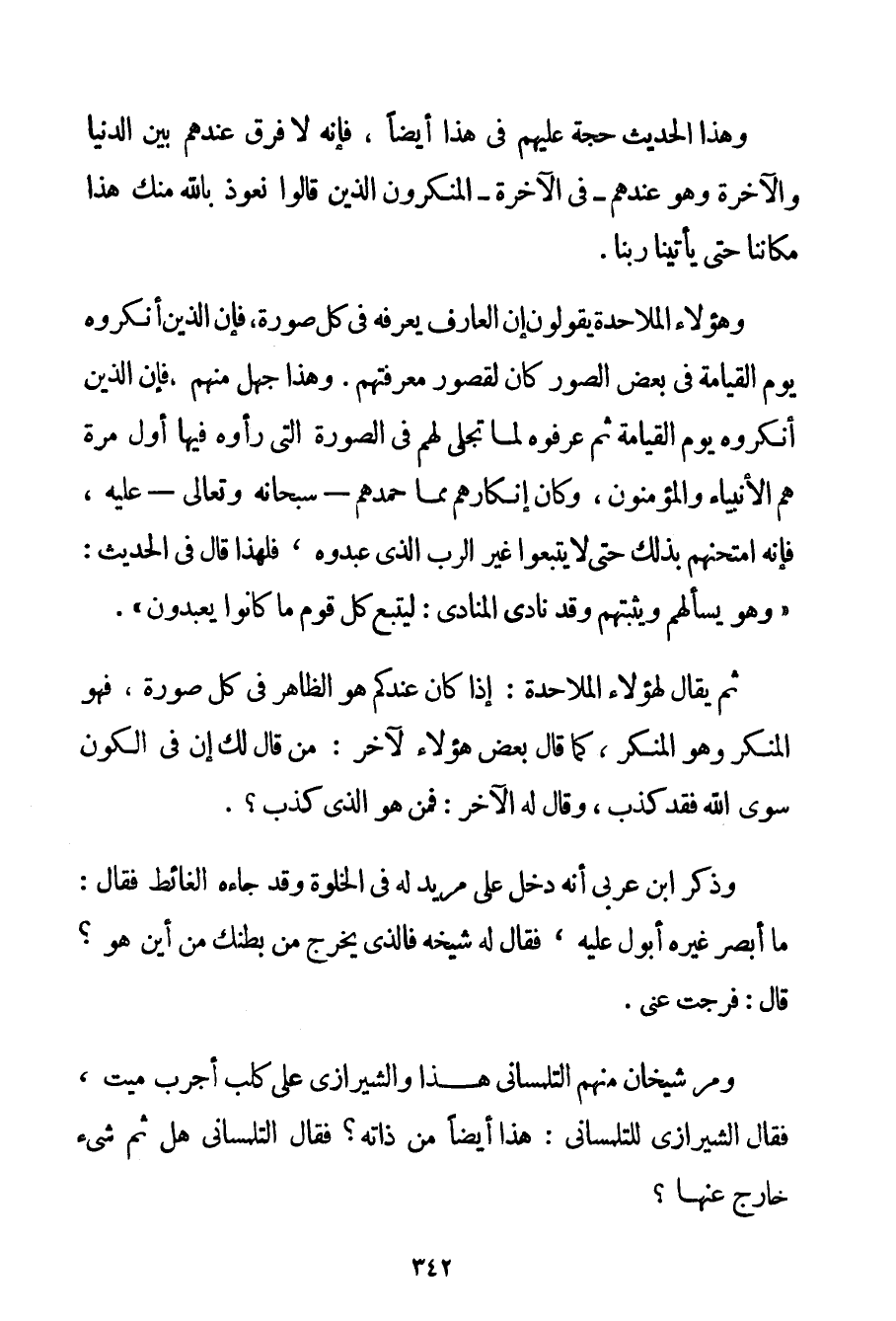 وَهَذَا الْحَدِيثُ حُجَّةٌ عَلَيْهِمْ فِي هَذَا أَيْضًا فَإِنَّهُ لَا فَرْقَ عِنْدَهُمْ بَيْنَ الدُّنْيَا وَالْآخِرَةِ وَهُوَ عِنْدَهُمْ - فِي الْآخِرَةِ - الْمُنْكِرُونَ الَّذِينَ قَالُوا نَعُوذُ بِاَللَّهِ مِنْك هَذَا مَكَانُنَا حَتَّى يَأْتِيَنَا رَبُّنَا. وَهَؤُلَاءِ الْمَلَاحِدَةُ يَقُولُونَ إنَّ الْعَارِفَ يَعْرِفُهُ فِي كُلِّ صُورَةٍ فَإِنَّ الَّذِينَ أَنْكَرُوهُ يَوْمَ الْقِيَامَةِ فِي بَعْضِ الصُّوَرِ كَانَ لِقُصُورِ مَعْرِفَتِهِمْ. وَهَذَا جَهْلٌ مِنْهُمْ فَإِنَّ الَّذِينَ أَنْكَرُوهُ يَوْمَ الْقِيَامَةِ ثُمَّ عَرَفُوهُ لَمَّا تَجَلَّى لَهُمْ فِي الصُّورَةِ الَّتِي رَأَوْهُ فِيهَا أَوَّلَ مَرَّةٍ هُمْ الْأَنْبِيَاءُ وَالْمُؤْمِنُونَ وَكَانَ إنْكَارُهُمْ مِمَّا حَمِدَهُمْ - سُبْحَانَهُ وَتَعَالَى - عَلَيْهِ فَإِنَّهُ امْتَحَنَهُمْ بِذَلِكَ حَتَّى لَا يَتَّبِعُوا غَيْرَ الرَّبِّ الَّذِي عَبَدُوهُ فَلِهَذَا قَالَ فِي الْحَدِيثِ: {وَهُوَ يَسْأَلُهُمْ وَيُثَبِّتُهُمْ وَقَدْ نَادَى الْمُنَادِي: لِيَتَّبِعْ كُلُّ قَوْمٍ مَا كَانُوا يَعْبُدُونَ} . ثُمَّ يُقَالُ لِهَؤُلَاءِ الْمَلَاحِدَةِ: إذَا كَانَ عِنْدَكُمْ هُوَ الظَّاهِرُ فِي كُلِّ صُورَةٍ فَهُوَ الْمُنْكَرُ وَهُوَ الْمُنْكَرُ كَمَا قَالَ بَعْضُ هَؤُلَاءِ لِآخَرَ: مَنْ قَالَ لَك أَنَّ فِي الْكَوْنِ سِوَى اللَّهِ فَقَدْ كَذَبَ وَقَالَ لَهُ الْآخَرُ: فَمَنْ هُوَ الَّذِي كَذَبَ؟ . وَذَكَرَ ابْنُ عَرَبِيٍّ أَنَّهُ دَخَلَ عَلَى مُرِيدٍ لَهُ فِي الْخَلْوَةِ وَقَدْ جَاءَهُ الْغَائِطُ فَقَالَ: مَا أُبْصِرُ غَيْرَهُ أَبُولُ عَلَيْهِ فَقَالَ لَهُ شَيْخُهُ فَاَلَّذِي يَخْرُجُ مِنْ بَطْنِك مِنْ أَيْنَ هُوَ؟ قَالَ: فَرَّجْت عَنِّي. وَمَرَّ شَيْخَانِ مِنْهُمْ التلمساني هَذَا وَالشِّيرَازِيُّ عَلَى كَلْبٍ أَجْرَبَ مَيِّتٍ فَقَالَ الشِّيرَازِيُّ للتلمساني: هَذَا أَيْضًا مِنْ ذَاتِهِ؟ فَقَالَ التلمساني هَلْ ثَمَّ شَيْءٌ خَارِجٌ عَنْهَا؟
