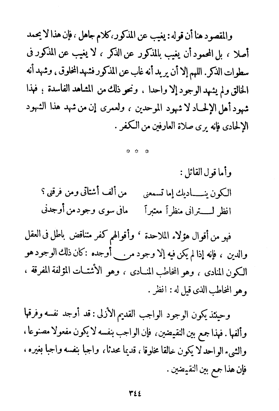 الْكَوْنُ يُنَادِيك أَمَا تَسْمَعُنِي مَنْ أَلَّفَ أَشْتَاتِي وَمَنْ فَرَّقَنِي؟ اُنْظُرْ لِتَرَانِي مَنْظَرًا مُعْتَبِرًا مَا فِي سِوَى وُجُودِ مَنْ أَوْجَدَنِي فَهُوَ مِنْ أَقْوَالِ هَؤُلَاءِ الْمَلَاحِدَةِ وَأَقْوَالِهِمْ كُفْرٌ مُتَنَاقِضٌ بَاطِلٌ فِي الْعَقْلِ وَالدِّينِ فَإِنَّهُ إذَا لَمْ يَكُنْ فِيهِ إلَّا وُجُودُ مَنْ أَوْجَدَهُ: كَانَ ذَلِكَ الْوُجُودُ هُوَ الْكَوْنُ الْمُنَادِي وَهُوَ الْمُخَاطَبُ الْمُنَادَى وَهُوَ الْأَشْتَاتُ الْمُؤَلَّفَةُ الْمُفَرَّقَةُ وَهُوَ الْمُخَاطَبُ الَّذِي قِيلَ لَهُ: اُنْظُرْ. وَحِينَئِذٍ يَكُونُ الْوُجُودُ الْوَاجِبُ الْقَدِيمُ الْأَزَلِيُّ: قَدْ أَوْجَدَ نَفْسَهُ وَفَرَّقَهَا وَأَلَّفَهَا. فَهَذَا جَمْعٌ بَيْنَ النَّقِيضَيْنِ فَإِنَّ الْوَاجِبَ بِنَفْسِهِ لَا يَكُونُ مَفْعُولًا مَصْنُوعًا وَالشَّيْءُ الْوَاحِدُ لَا يَكُونُ خَالِقًا مَخْلُوقًا قَدِيمًا مُحْدِثًا وَاجِبًا بِنَفْسِهِ وَاجِبًا بِغَيْرِهِ فَإِنَّ هَذَا جَمْعٌ بَيْنَ النَّقِيضَيْنِ.