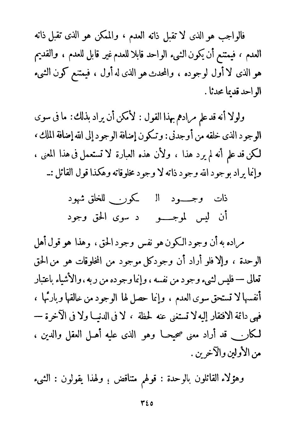 فَالْوَاجِبُ هُوَ الَّذِي لَا تَقْبَلُ ذَاتُهُ الْعَدَمَ وَالْمُمْكِنُ هُوَ الَّذِي تَقْبَلُ ذَاتُهُ الْعَدَمَ فَيَمْتَنِعُ أَنْ يَكُونَ الشَّيْءُ الْوَاحِدُ قَابِلًا لِلْعَدَمِ غَيْرُ قَابِلٍ لِلْعَدَمِ وَالْقَدِيمُ هُوَ الَّذِي لَا أَوَّلَ لِوُجُودِهِ وَالْمُحْدَثُ هُوَ الَّذِي لَهُ أَوَّلُ فَيَمْتَنِعُ كَوْنُ الشَّيْءِ الْوَاحِدِ قَدِيمًا مُحْدِثًا. وَلَوْلَا أَنَّهُ قَدْ عَلِمَ مُرَادَهُمْ بِهَذَا الْقَوْلِ: لَأَمْكَنَ أَنْ يُرَادَ بِذَلِكَ: مَا فِي سِوَى الْوُجُودِ الَّذِي خَلَقَهُ مَنْ أَوْجَدَنِي: وَتَكُونُ إضَافَةُ الْوُجُودِ إلَى اللَّهِ) إضَافَةَ الْمِلْكِ لَكِنْ قَدْ عَلِمَ أَنَّهُ لَمْ يُرِدْ هَذَا وَلِأَنَّ هَذِهِ الْعِبَارَةَ لَا تُسْتَعْمَلُ فِي هَذَا الْمَعْنَى وَإِنَّمَا يُرَادُ بِوُجُودِ اللَّهِ وُجُودُ ذَاتِهِ لَا وُجُودُ مَخْلُوقَاتِهِ وَهَكَذَا قَوْلُ الْقَائِلِ: - ذَاتُ وُجُودِ الْكَوْنِ لِلْخَلْقِ شُهُودُ أَنْ لَيْسَ لِمَوْجُودِ سِوَى الْحَقِّ وُجُودُ مُرَادُهُ بِهِ أَنَّ وُجُودَ الْكَوْنِ هُوَ نَفْسُ وُجُودِ الْحَقِّ) وَهَذَا هُوَ قَوْل أَهْلِ الْوَحْدَةِ وَإِلَّا فَلَوْ أَرَادَ أَنَّ وُجُودَ كُلِّ مَوْجُودٍ مِنْ الْمَخْلُوقَاتِ هُوَ مِنْ الْحَقِّ تَعَالَى - فَلَيْسَ لِشَيْءِ وُجُودٌ مِنْ نَفْسِهِ وَإِنَّمَا وُجُودُهُ مِنْ رَبِّهِ وَالْأَشْيَاءُ بِاعْتِبَارِ أَنْفُسِهَا لَا تَسْتَحِقُّ سِوَى الْعَدَمِ وَإِنَّمَا حَصَلَ لَهَا الْوُجُودُ مِنْ خَالِقِهَا وَبَارِئِهَا فَهِيَ دَائِمَةُ الِافْتِقَارِ إلَيْهِ لَا تَسْتَغْنِي عَنْهُ لَحْظَةً لَا فِي الدُّنْيَا وَلَا فِي الْآخِرَةِ - لَكَانَ قَدْ أَرَادَ مَعْنًى صَحِيحًا وَهُوَ الَّذِي عَلَيْهِ أَهْلُ الْعَقْلِ وَالدِّينِ مِنْ الْأَوَّلِينَ والآخرين. وَهَؤُلَاءِ الْقَائِلُونَ بِالْوَحْدَةِ: قَوْلُهُمْ مُتَنَاقِضٌ؛ وَلِهَذَا يَقُولُونَ:
