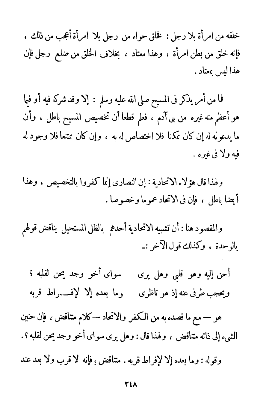 خَلْقُهُ مِنْ امْرَأَةٍ بِلَا رَجُلٍ: فَخَلْقُ حَوَّاءَ مِنْ رِجْلٍ بِلَا امْرَأَةٍ أَعْجَبُ مِنْ ذَلِكَ فَإِنَّهُ خُلِقَ مِنْ بَطْنِ امْرَأَةٍ وَهَذَا مُعْتَادٌ بِخِلَافِ الْخَلْقِ مِنْ ضِلْعِ رَجُلٍ فَإِنَّ هَذَا لَيْسَ بِمُعْتَادِ. فَمَا مِنْ أَمْرٍ يُذْكَرُ فِي الْمَسِيحِ صَلَّى اللَّهُ عَلَيْهِ وَسَلَّمَ إلَّا وَقَدْ شَرَكَهُ فِيهِ أَوْ فِيمَا هُوَ أَعْظَمُ مِنْهُ غَيْرُهُ مِنْ بَنِي آدَمَ فَعُلِمَ قَطْعًا أَنَّ تَخْصِيصَ الْمَسِيحِ بَاطِلٌ وَأَنَّ مَا يَدَّعُونَهُ لَهُ إنْ كَانَ مُمْكِنًا فَلَا اخْتِصَاصَ لَهُ بِهِ وَإِنْ كَانَ مُمْتَنِعًا فَلَا وُجُودَ لَهُ فِيهِ وَلَا فِي غَيْرِهِ. وَلِهَذَا قَالَ هَؤُلَاءِ الِاتِّحَادِيَّةُ: إنَّ النَّصَارَى إنَّمَا كَفَرُوا بِالتَّخْصِيصِ وَهَذَا أَيْضًا بَاطِلٌ فَإِنَّ فِي الِاتِّحَادِ عُمُومًا وَخُصُوصًا. وَالْمَقْصُودُ هُنَا أَنَّ تَشْبِيهَ الِاتِّحَادِيَّةِ أَحَدَهُمْ بِالظِّلِّ الْمُسْتَحِيلِ يُنَاقِضُ قَوْلَهُمْ بِالْوَحْدَةِ) وَكَذَلِكَ قَوْلُ الْآخَرِ: - أَحِنُّ إلَيْهِ وَهُوَ قَلْبِي وَهَلْ يَرَى سِوَايَ أَخُو وَجْدٍ يَحِنُّ لِقَلْبِهِ؟ وَيَحْجُبُ طَرْفِي عَنْهُ إذْ هُوَ نَاظِرِي وَمَا بَعْدَهُ إلَّا لِإِفْرَاطِ قُرْبِهِ هُوَ - مَعَ مَا قَصَدَهُ بِهِ مِنْ الْكُفْرِ وَالِاتِّحَادِ - كَلَامٌ مُتَنَاقِضٌ فَإِنَّ حَنِينَ الشَّيْءِ إلَى ذَاتِهِ مُتَنَاقِضٌ وَلِهَذَا قَالَ: وَهَلْ يَرَى سِوَايَ أَخُو وَجْدٍ يَحِنُّ لِقَلْبِهِ؟ . وَقَوْلُهُ: وَمَا بَعْدَهُ إلَّا لِإِفْرَاطِ قُرْبِهِ مُتَنَاقِضٌ؛ فَإِنَّهُ لَا قُرْبَ وَلَا بُعْدَ عِنْدَ