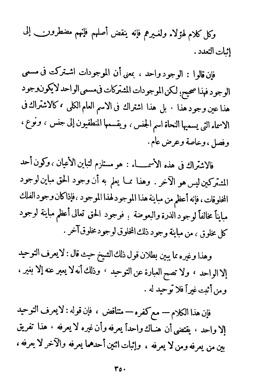 وَكُلُّ كَلَامٍ لِهَؤُلَاءِ وَلِغَيْرِهِمْ فَإِنَّهُ يَنْقُضُ أَصْلَهُمْ فَإِنَّهُمْ مُضْطَرُّونَ إلَى إثْبَاتِ التَّعَدُّدِ. فَإِنْ قَالُوا: الْوُجُودُ وَاحِدٌ بِمَعْنَى أَنَّ الْمَوْجُودَاتِ اشْتَرَكَتْ فِي مُسَمَّى الْوُجُودِ فَهَذَا صَحِيحٌ؛ لَكِنَّ الْمَوْجُودَاتِ الْمُشْتَرِكَاتِ فِي مُسَمَّى الْوَاحِدِ لَا يَكُونُ وُجُودُ هَذَا عَيْنَ وُجُودِ هَذَا بَلْ هَذَا اشْتِرَاكٌ فِي الِاسْمِ الْعَامِّ الْكُلِّيِّ كَالِاشْتِرَاكِ فِي الْأَسْمَاءِ الَّتِي يُسَمِّيهَا النُّحَاةُ اسْمَ الْجِنْسِ وَيُقَسِّمُهَا الْمَنْطِقِيُّونَ إلَى جِنْسٍ وَنَوْعٍ وَفَصْلٍ وَخَاصَّةٍ وَعَرَضٍ عَامٍّ. فَالِاشْتِرَاكُ فِي هَذِهِ الْأَسْمَاءِ: هُوَ مُسْتَلْزِمٌ لِتَبَايُنِ الْأَعْيَانِ وَكَوْنُ أَحَدِ الْمُشْتَرِكَيْنِ لَيْسَ هُوَ الْآخَرَ. وَهَذَا مِمَّا يُعْلَمُ بِهِ أَنَّ وُجُودَ الْحَقِّ مُبَايِنٌ لِوُجُودِ الْمَخْلُوقَاتِ فَإِنَّهُ أَعْظَمُ مِنْ مُبَايَنَةِ هَذَا الْمَوْجُودِ لِهَذَا الْمَوْجُودِ فَإِذَا كَانَ وُجُودُ الْفَلَكِ مُبَايِنًا مُخَالِفًا لِوُجُودِ الذَّرَّةِ وَالْبَعُوضَةِ؛ فَوُجُودُ الْحَقِّ تَعَالَى أَعْظَمُ مُبَايَنَةً لِوُجُودِ كُلِّ مَخْلُوقٍ مِنْ مُبَايَنَةِ وُجُودِ ذَلِكَ الْمَخْلُوقِ لِوُجُودِ مَخْلُوقٍ آخَرَ. وَهَذَا وَغَيْرُهُ مِمَّا يُبَيِّنُ بُطْلَانَ قَوْلِ ذَلِكَ الشَّيْخِ حَيْثُ قَالَ: لَا يَعْرِفُ التَّوْحِيدَ إلَّا الْوَاحِدُ وَلَا تَصِحُّ الْعِبَارَةُ عَنْ التَّوْحِيدِ وَذَلِكَ أَنَّهُ لَا يُعَبَّرُ عَنْهُ إلَّا بِغَيْرِ وَمَنْ أَثْبَتَ غَيْرًا فَلَا تَوْحِيدَ لَهُ. فَإِنَّ هَذَا الْكَلَامَ - مَعَ كُفْرِهِ - مُتَنَاقِضٌ فَإِنَّ قَوْلَهُ: لَا يَعْرِفُ التَّوْحِيدَ إلَّا وَاحِدٌ) يَقْتَضِي أَنَّ هُنَاكَ وَاحِدًا يَعْرِفُهُ وَأَنَّ غَيْرَهُ لَا يَعْرِفُهُ هَذَا تَفْرِيقٌ بَيْنَ مَنْ يَعْرِفُهُ وَمَنْ لَا يَعْرِفُهُ وَإِثْبَاتُ اثْنَيْنِ أَحَدِهِمَا يَعْرِفُهُ وَالْآخَرِ لَا يَعْرِفُهُ