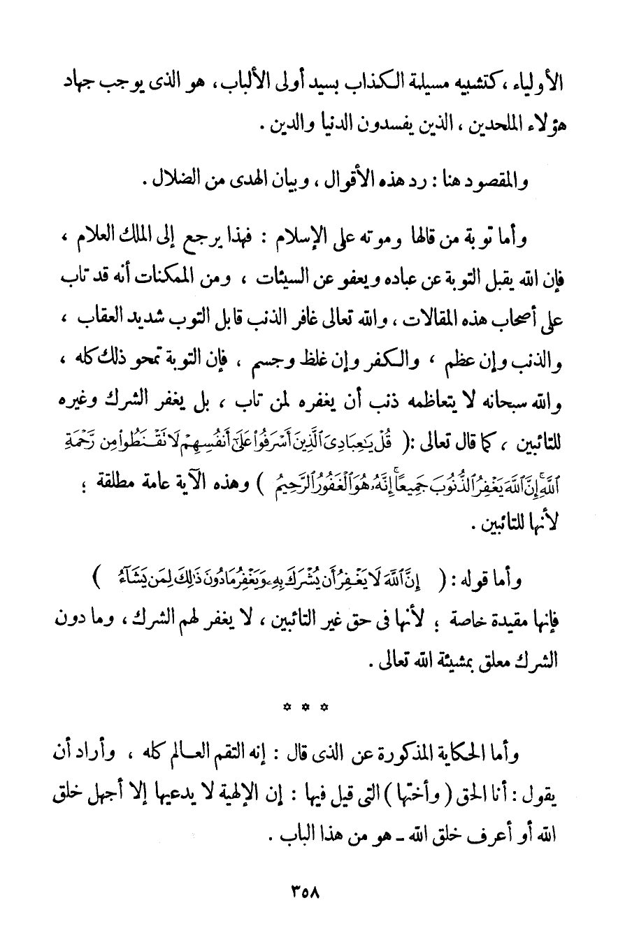 وَأَمَّا تَوْبَةُ مَنْ قَالَهَا وَمَوْتُهُ عَلَى الْإِسْلَامِ فَهَذَا يَرْجِعُ إلَى الْمَلِكِ الْعَلَّامِ فَإِنَّ اللَّهَ يَقْبَلُ التَّوْبَةَ عَنْ عِبَادِهِ وَيَعْفُو عَنْ السَّيِّئَاتِ وَمِنْ الْمُمْكِنَات أَنَّهُ قَدْ تَابَ عَلَى أَصْحَابِ هَذِهِ الْمَقَالَاتِ وَاَللَّهُ تَعَالَى غَافِرُ الذَّنْبِ قَابِلُ التَّوْبِ شَدِيدُ الْعِقَابِ وَالذَّنْبُ وَإِنْ عَظُمَ وَالْكُفْرُ وَإِنْ غَلُظَ وَجَسُمَ فَإِنَّ التَّوْبَةَ تَمْحُو ذَلِكَ كُلَّهُ وَاَللَّهُ سُبْحَانَهُ لَا يَتَعَاظَمُهُ ذَنْبٌ أَنْ يَغْفِرَهُ لِمَنْ تَابَ بَلْ يَغْفِرُ الشِّرْكَ وَغَيْرَهُ لِلتَّائِبِينَ كَمَا قَالَ تَعَالَى: {قُلْ يَا عِبَادِيَ الَّذِينَ أَسْرَفُوا عَلَى أَنْفُسِهِمْ لَا تَقْنَطُوا مِنْ رَحْمَةِ اللَّهِ إنَّ اللَّهَ يَغْفِرُ الذُّنُوبَ جَمِيعًا إنَّهُ هُوَ الْغَفُورُ الرَّحِيمُ} وَهَذِهِ الْآيَةُ عَامَّةٌ مُطْلَقَةٌ؛ لِأَنَّهَا لِلتَّائِبِينَ. وَأَمَّا قَوْلُهُ: {إنَّ اللَّهَ لَا يَغْفِرُ أَنْ يُشْرَكَ بِهِ وَيَغْفِرُ مَا دُونَ ذَلِكَ لِمَنْ يَشَاءُ} فَإِنَّهَا مُقَيَّدَةٌ خَاصَّةً؛ لِأَنَّهَا فِي حَقّ غَيْرِ التَّائِبِينَ لَا يَغْفِرُ لَهُمْ الشِّرْكَ وَمَا دُونَ الشِّرْكِ مُعَلَّقٌ بِمَشِيئَةِ اللَّهِ تَعَالَى. وَأَمَّا الْحِكَايَةُ الْمَذْكُورَةُ عَنْ الَّذِي قَالَ: إنَّهُ الْتَقَمَ الْعَالَمَ كُلَّهُ وَأَرَادَ أَنْ يَقُولَ: أَنَا الْحَقُّ وَأُخْتُهَا الَّتِي قِيلَ فِيهَا: إنَّ الْإِلَهِيَّةَ لَا يَدَّعِيهَا إلَّا أَجْهَلُ خَلْقِ اللَّهِ أَوْ أَعْرَفُ خَلْقِ اللَّهِ - هُوَ مِنْ هَذَا الْبَابِ.