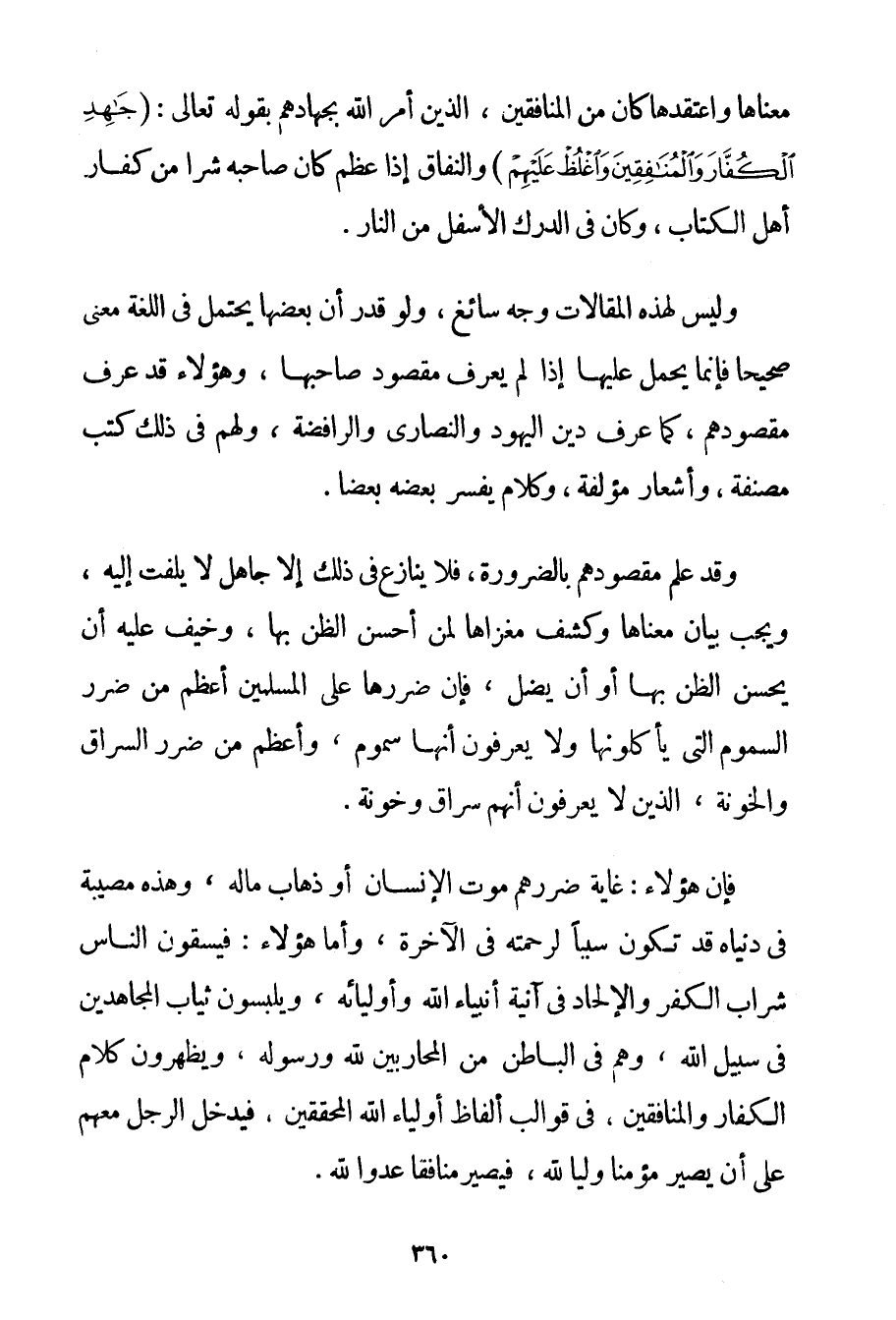 مَعْنَاهَا وَاعْتَقَدَهَا كَانَ مِنْ الْمُنَافِقِينَ الَّذِينَ أَمَرَ اللَّهُ بِجِهَادِهِمْ بِقَوْلِهِ تَعَالَى: {جَاهِدِ الْكُفَّارَ وَالْمُنَافِقِينَ وَاغْلُظْ عَلَيْهِمْ} وَالنِّفَاقُ إذَا عَظُمَ كَانَ صَاحِبُهُ شَرًّا مِنْ كُفَّارِ أَهْلِ الْكِتَابِ وَكَانَ فِي الدَّرْكِ الْأَسْفَلِ مِنْ النَّارِ. وَلَيْسَ لِهَذِهِ الْمَقَالَاتِ وَجْهٌ سَائِغٌ وَلَوْ قُدِّرَ أَنَّ بَعْضَهَا يَحْتَمِلُ فِي اللُّغَةِ مَعْنًى صَحِيحًا فَإِنَّمَا يُحْمَلُ عَلَيْهَا إذَا لَمْ يُعْرَفْ مَقْصُودُ صَاحِبِهَا وَهَؤُلَاءِ قَدْ عُرِفَ مَقْصُودُهُمْ كَمَا عُرِفَ دِينُ الْيَهُودِ وَالنَّصَارَى وَالرَّافِضَةِ وَلَهُمْ فِي ذَلِكَ كُتُبٌ مُصَنَّفَةٌ وَأَشْعَارٌ مُؤَلَّفَةٌ وَكَلَامٌ يُفَسِّرُ بَعْضُهُ بَعْضًا. وَقَدْ عُلِمَ مَقْصُودُهُمْ بِالضَّرُورَةِ فَلَا يُنَازِعُ فِي ذَلِكَ إلَّا جَاهِلٌ لَا يُلْفَتُ إلَيْهِ وَيَجِبُ بَيَانُ مَعْنَاهَا وَكَشْفُ مَغْزَاهَا لِمَنْ أَحْسَنَ الظَّنَّ بِهَا وَخِيفَ عَلَيْهِ أَنْ يُحْسِنَ الظَّنَّ بِهَا أَوْ أَنْ يَضِلَّ فَإِنَّ ضَرَرَهَا عَلَى الْمُسْلِمِينَ أَعْظَمُ مِنْ ضَرَرِ السُّمُومِ الَّتِي يَأْكُلُونَهَا وَلَا يَعْرِفُونَ أَنَّهَا سُمُومٌ وَأَعْظَمُ مِنْ ضَرَرِ السُّرَّاقِ وَالْخَوَنَةِ الَّذِينَ لَا يَعْرِفُونَ أَنَّهُمْ سُرَّاقٌ وَخَوَنَةٌ. فَإِنَّ هَؤُلَاءِ: غَايَةُ ضررهم مَوْتُ الْإِنْسَانِ أَوْ ذَهَابُ مَالِهِ وَهَذِهِ مُصِيبَةٌ فِي دُنْيَاهُ قَدْ تَكُونُ سَبَبًا لِرَحْمَتِهِ فِي الْآخِرَةِ وَأَمَّا هَؤُلَاءِ: فَيَسْقُونَ النَّاسَ شَرَابَ الْكُفْرِ وَالْإِلْحَادِ فِي آنِيَةِ أَنْبِيَاءِ اللَّهِ وَأَوْلِيَائِهِ وَيَلْبَسُونَ ثِيَابَ الْمُجَاهِدِينَ فِي سَبِيلِ اللَّهِ وَهُمْ فِي الْبَاطِنِ مِنْ الْمُحَارِبِينَ لِلَّهِ وَرَسُولِهِ وَيُظْهِرُونَ كَلَامَ الْكُفَّارِ وَالْمُنَافِقِينَ فِي قَوَالِبِ أَلْفَاظِ أَوْلِيَاءِ اللَّهِ الْمُحَقِّقِينَ فَيَدْخُلُ الرَّجُلُ مَعَهُمْ عَلَى أَنْ يَصِيرَ مُؤْمِنًا وَلِيًّا لِلَّهِ فَيَصِيرُ مُنَافِقًا عَدُوًّا لِلَّهِ.
