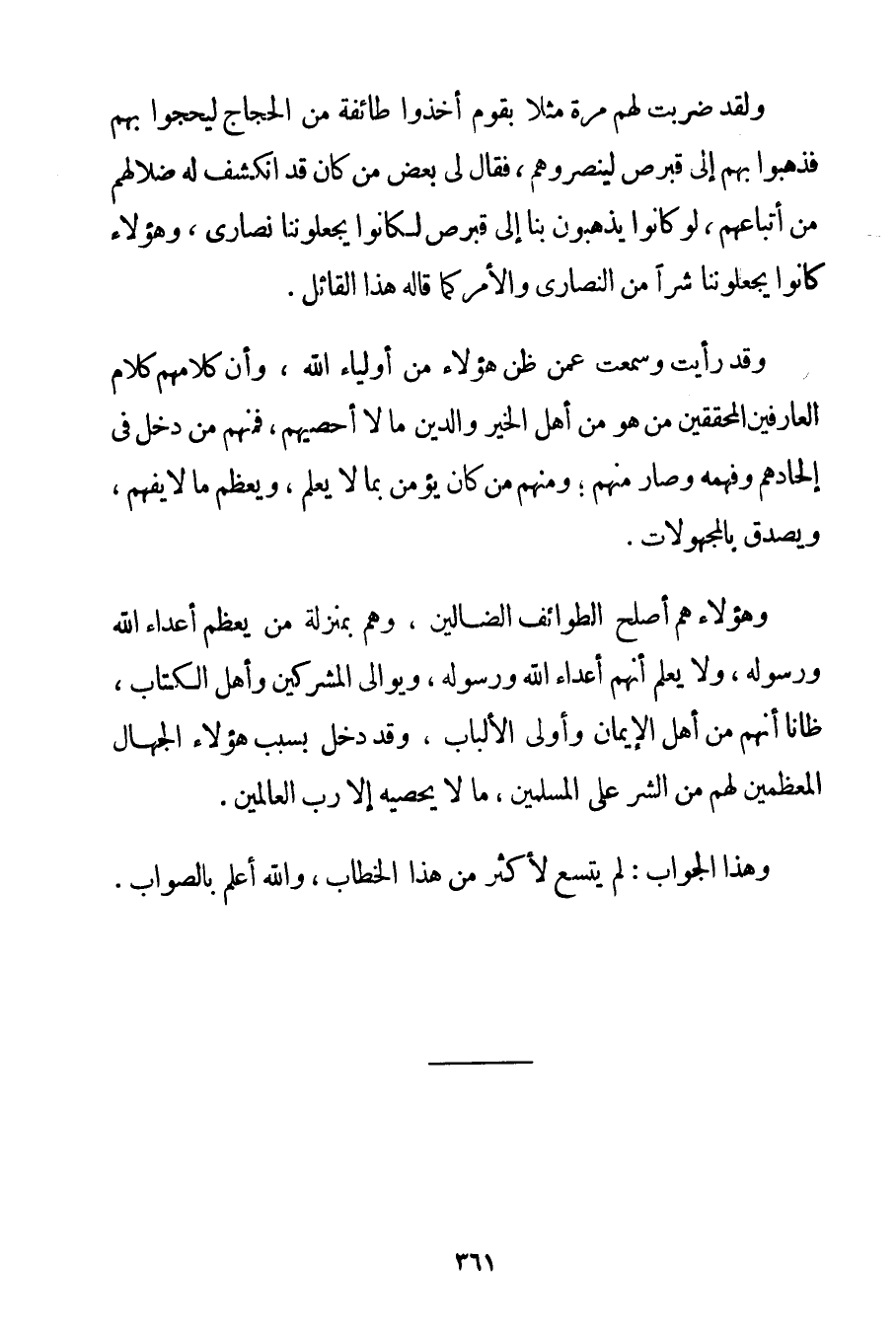 وَلَقَدْ ضَرَبْت لَهُمْ مَرَّةً مَثَلًا بِقَوْمِ أَخَذُوا طَائِفَةً مِنْ الْحُجَّاجِ لِيَحُجُّوا بِهِمْ فَذَهَبُوا بِهِمْ إلَى قُبْرُصَ لِيُنَصِرُوهُمْ فَقَالَ لِي بَعْضُ مَنْ كَانَ قَدْ انْكَشَفَ لَهُ ضَلَالُهُمْ مِنْ أَتْبَاعِهِمْ لَوْ كَانُوا يَذْهَبُونَ بِنَا إلَى قُبْرُصَ لَكَانُوا يَجْعَلُونَنَا نَصَارَى وَهَؤُلَاءِ كَانُوا يَجْعَلُونَنَا شَرًّا مِنْ النَّصَارَى وَالْأَمْرُ كَمَا قَالَهُ هَذَا الْقَائِلُ. وَقَدْ رَأَيْت وَسَمِعْت عَمَّنْ ظَنَّ هَؤُلَاءِ مِنْ أَوْلِيَاءِ اللَّهِ وَأَنَّ كَلَامَهُمْ كَلَامُ الْعَارِفِينَ الْمُحَقِّقِينَ مَنْ هُوَ مِنْ أَهْلِ الْخَيْرِ وَالدِّينِ مَا لَا أُحْصِيهِمْ فَمِنْهُمْ مَنْ دَخَلَ فِي إلْحَادِهِمْ وَفَهِمَهُ وَصَارَ مِنْهُمْ؛ وَمِنْهُمْ مَنْ كَانَ يُؤْمِنُ بِمَا لَا يَعْلَمُ وَيُعَظِّمُ مَا لَا يَفْهَمُ وَيُصَدِّقُ بِالْمَجْهُولَاتِ. وَهَؤُلَاءِ هُمْ أَصْلَحُ الطَّوَائِفِ الضَّالِّينَ وَهُمْ بِمَنْزِلَةِ مَنْ يُعَظِّمُ أَعْدَاءَ اللَّهِ وَرَسُولِهِ وَلَا يَعْلَمُ أَنَّهُمْ أَعْدَاءُ اللَّهِ وَرَسُولُهُ وَيُوَالِي الْمُشْرِكِينَ وَأَهْلَ الْكِتَابِ ظَانًّا أَنَّهُمْ مِنْ أَهْلِ الْإِيمَانِ وَأُولِي الْأَلْبَابِ وَقَدْ دَخَلَ بِسَبَبِ هَؤُلَاءِ الْجُهَّالِ الْمُعَظِّمِينَ لَهُمْ مِنْ الشَّرِّ عَلَى الْمُسْلِمِينَ مَا لَا يُحْصِيه إلَّا رَبُّ الْعَالَمِينَ. وَهَذَا الْجَوَابُ: لَمْ يَتَّسِعْ لِأَكْثَرَ مِنْ هَذَا الْخِطَابِ وَاَللَّهُ أَعْلَمُ بِالصَّوَابِ.