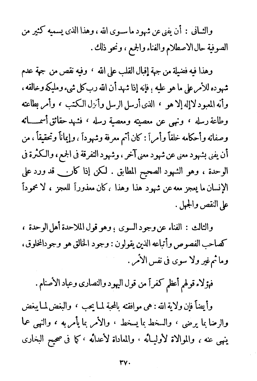 وَالثَّانِي: أَنْ يَفْنَى عَنْ شُهُودِ مَا سِوَى اللَّهِ وَهَذَا الَّذِي يُسَمِّيهِ كَثِيرٌ مِنْ الصُّوفِيَّةِ حَالَ الِاصْطِلَامِ وَالْفَنَاءِ وَالْجَمْعِ وَنَحْوِ ذَلِكَ. وَهَذَا فِيهِ فَضِيلَةٌ مِنْ جِهَةِ إقْبَالِ الْقَلْبِ عَلَى اللَّهِ وَفِيهِ نَقْصٌ مِنْ جِهَةِ عَدَمِ شُهُودِهِ لِلْأَمْرِ عَلَى مَا هُوَ عَلَيْهِ فَإِنَّهُ إذَا شَهِدَ أَنَّ اللَّهَ رَبُّ كُلِّ شَيْءٍ وَمَلِيكُهُ وَخَالِقُهُ وَأَنَّهُ الْمَعْبُودُ لَا إلَهَ إلَّا هُوَ الَّذِي أَرْسَلَ الرُّسُلَ وَأَنْزَلَ الْكُتُبَ وَأَمَرَ بِطَاعَتِهِ وَطَاعَةِ رُسُلِهِ وَنَهَى عَنْ مَعْصِيَتِهِ وَمَعْصِيَةِ رُسُلِهِ فَشَهِدَ حَقَائِقَ أَسْمَائِهِ وَصِفَاتِهِ وَأَحْكَامِهِ خُلُقًا وَأَمْرًا: كَانَ أَتَمَّ مَعْرِفَةً وَشُهُودًا وَإِيمَانًا وَتَحْقِيقًا مِنْ أَنْ يَفْنَى بِشُهُودِ مَعْنًى عَنْ شُهُودِ مَعْنًى آخَرَ وَشُهُودِ التَّفْرِقَةِ فِي الْجَمْعِ وَالْكَثْرَةِ فِي الْوَحْدَةِ وَهُوَ الشُّهُودُ الصَّحِيحُ الْمُطَابِقُ. لَكِنْ إذَا كَانَ قَدْ وَرَدَ عَلَى الْإِنْسَانِ مَا يَعْجِزُ مَعَهُ عَنْ شُهُودِ هَذَا وَهَذَا كَانَ مَعْذُورًا لِلْعَجْزِ لَا مَحْمُودًا عَلَى النَّقْصِ وَالْجَهْلِ. وَالثَّالِثُ: الْفَنَاءُ عَنْ وُجُودِ السِّوَى؛ وَهُوَ قَوْلُ الْمَلَاحِدَةِ أَهْلِ الْوَحْدَةِ كَصَاحِبِ الْفُصُوصِ وَأَتْبَاعِهِ الَّذِينَ يَقُولُونَ: وُجُودُ الْخَالِقِ هُوَ وُجُودُ الْمَخْلُوقِ وَمَا ثَمَّ غَيْرٌ وَلَا سِوَى فِي نَفْسِ الْأَمْرِ. فَهَؤُلَاءِ قَوْلُهُمْ أَعْظَمُ كُفْرًا مِنْ قَوَّلَ الْيَهُودِ وَالنَّصَارَى وَعُبَّادِ الْأَصْنَامِ. وَأَيْضًا فَإِنَّ وِلَايَةَ اللَّهِ: هِيَ مُوَافَقَتُهُ بِالْمَحَبَّةِ لِمَا يُحِبُّ وَالْبُغْضُ لِمَا يُبْغِضُ وَالرِّضَا بِمَا يَرْضَى وَالسُّخْطُ بِمَا يَسْخَطُ وَالْأَمْرُ بِمَا يَأْمُرُ بِهِ وَالنَّهْيُ عَمَّا يَنْهَى عَنْهُ وَالْمُوَالَاةُ لِأَوْلِيَائِهِ وَالْمُعَادَاةُ لِأَعْدَائِهِ كَمَا فِي صَحِيحِ الْبُخَارِيِّ