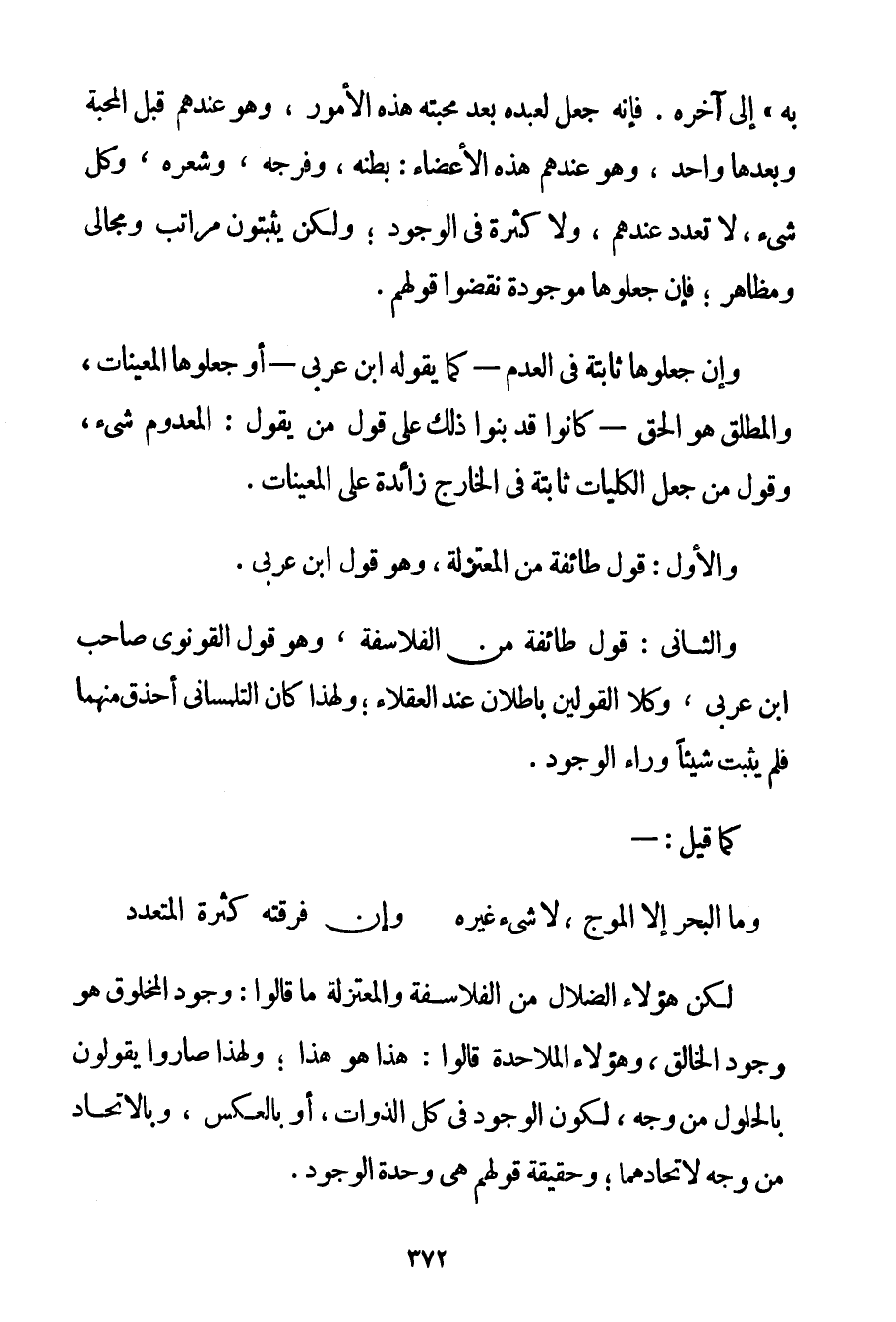 بِهِ} إلَى آخِرِهِ. فَإِنَّهُ جَعَلَ لِعَبْدِهِ بَعْدَ مَحَبَّتِهِ هَذِهِ الْأُمُورَ وَهُوَ عِنْدَهُمْ قَبْلَ الْمَحَبَّةِ وَبَعْدَهَا وَاحِدٌ وَهُوَ عِنْدَهُمْ هَذِهِ الْأَعْضَاءُ: بَطْنُهُ وَفَرْجُهُ وَشَعْرُهُ وَكُلُّ شَيْءٍ لَا تَعَدُّدَ عِنْدَهُمْ وَلَا كَثْرَةَ فِي الْوُجُودِ؛ وَلَكِنْ يُثْبِتُونَ مَرَاتِبَ وَمَجَالِيَ وَمَظَاهِرَ؛ فَإِنْ جَعَلُوهَا مَوْجُودَةً نَقَضُوا قَوْلَهُمْ. وَإِنْ جَعَلُوهَا ثَابِتَةً فِي الْعَدَمِ - كَمَا يَقُولُهُ ابْنُ عَرَبِيٍّ - أَوْ جَعَلُوهَا الْمُعَيَّنَاتِ وَالْمُطْلَقُ هُوَ الْحَقُّ - كَانُوا قَدْ بَنَوْا ذَلِكَ عَلَى قَوْلِ مَنْ يَقُولُ: الْمَعْدُومُ شَيْءٌ وَقَوْلُ مَنْ جَعَلَ الْكُلِّيَّاتِ ثَابِتَةً فِي الْخَارِجِ زَائِدَةٌ عَلَى الْمُعَيَّنَاتِ. وَالْأَوَّلُ: قَوْلُ طَائِفَةٍ مِنْ الْمُعْتَزِلَةِ وَهُوَ قَوْلُ ابْنِ عَرَبِيٍّ. وَالثَّانِي: قَوْلُ طَائِفَةٍ مِنْ الْفَلَاسِفَةِ وَهُوَ قَوْلُ القونوي صَاحِبُ ابْنِ عَرَبِيٍّ وَكِلَا الْقَوْلَيْنِ بَاطِلَانِ عِنْدَ الْعُقَلَاءِ وَلِهَذَا كَانَ التلمساني أَحْذَقَ مِنْهُمَا فَلَمْ يُثْبِتْ شَيْئًا وَرَاءَ الْوُجُودِ. كَمَا قِيلَ: - وَمَا الْبَحْرُ إلَّا الْمَوْجُ لَا شَيْءَ غَيْرَهُ وَإِنْ فَرَّقَتْهُ كَثْرَةُ الْمُتَعَدِّدِ لَكِنَّ هَؤُلَاءِ الضُّلَّالَ مِنْ الْفَلَاسِفَةِ وَالْمُعْتَزِلَةِ مَا قَالُوا: وُجُودُ الْمَخْلُوقِ هُوَ وُجُودُ الْخَالِقِ وَهَؤُلَاءِ الْمَلَاحِدَةُ قَالُوا: هَذَا هُوَ هَذَا؛ وَلِهَذَا صَارُوا يَقُولُونَ بِالْحُلُولِ مِنْ وَجْهٍ لِكَوْنِ الْوُجُودِ فِي كُلِّ الذَّوَاتِ أَوْ بِالْعَكْسِ وَبِالِاتِّحَادِ مِنْ وَجْهٍ لِاتِّحَادِهِمَا؛ وَحَقِيقَةُ قَوْلِهِمْ هِيَ وَحْدَةُ الْوُجُودِ.