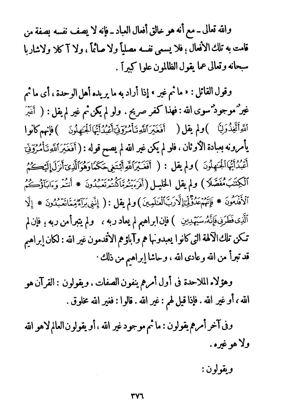 وَاَللَّهُ تَعَالَى - مَعَ أَنَّهُ هُوَ خَالِقُ أَفْعَالِ الْعِبَادِ - فَإِنَّهُ لَا يَصِفُ نَفْسَهُ بِصِفَةِ مَنْ قَامَتْ بِهِ تِلْكَ الْأَفْعَالُ؛ فَلَا يُسَمِّي نَفْسَهُ مُصَلِّيًا وَلَا صَائِمًا وَلَا آكِلًا وَلَا شَارِبًا سُبْحَانَهُ وَتَعَالَى عَمَّا يَقُولُ الظَّالِمُونَ عُلُوًّا كَبِيرًا. وَقَوْلُ الْقَائِلِ: " مَا ثَمَّ غَيْرٌ " إذَا أَرَادَ بِهِ مَا يُرِيدُهُ أَهْلُ الْوَحْدَةِ أَيْ مَا ثَمَّ غَيْرٌ مَوْجُودٌ سِوَى اللَّهِ: فَهَذَا كُفْرٌ صَرِيحٌ. وَلَوْ لَمْ يَكُنْ ثَمَّ غَيْرٌ لَمْ يَقُلْ: {أَغَيْرَ اللَّهِ أَتَّخِذُ وَلِيًّا} وَلَمْ يَقُلْ {أَفَغَيْرَ اللَّهِ تَأْمُرُونِّي أَعْبُدُ أَيُّهَا الْجَاهِلُونَ} فَإِنَّهُمْ كَانُوا يَأْمُرُونَهُ بِعِبَادَةِ الْأَوْثَانِ فَلَوْ لَمْ يَكُنْ غَيْرُ اللَّهِ لَمْ يَصِحَّ قَوْلُهُ: {أَفَغَيْرَ اللَّهِ تَأْمُرُونِّي أَعْبُدُ أَيُّهَا الْجَاهِلُونَ} وَلَمْ يَقُلْ: {أَفَغَيْرَ اللَّهِ أَبْتَغِي حَكَمًا وَهُوَ الَّذِي أَنْزَلَ إلَيْكُمُ الْكِتَابَ مُفَصَّلًا} وَلَمْ يَقُلْ الْخَلِيلُ {أَفَرَأَيْتُمْ مَا كُنْتُمْ تَعْبُدُونَ} {أَنْتُمْ وَآبَاؤُكُمُ الْأَقْدَمُونَ} {فَإِنَّهُمْ عَدُوٌّ لِي إلَّا رَبَّ الْعَالَمِينَ} وَلَمْ يَقُلْ: {إنَّنِي بَرَاءٌ مِمَّا تَعْبُدُونَ} {إلَّا الَّذِي فَطَرَنِي فَإِنَّهُ سَيَهْدِينِ} فَإِنَّ إبْرَاهِيمَ لَمْ يُعَادِ رَبَّهُ وَلَمْ يَتَبَرَّأْ مِنْ رَبِّهِ؛ فَإِنْ لَمْ تَكُنْ تِلْكَ الْآلِهَةُ الَّتِي كَانُوا يَعْبُدُونَهَا هُمْ وَآبَاؤُهُمْ الْأَقْدَمُونَ غَيْرَ اللَّهِ: لَكَانَ إبْرَاهِيمُ قَدْ تَبَرَّأَ مِنْ اللَّهِ وَعَادَى اللَّهَ وَحَاشَا إبْرَاهِيمَ مِنْ ذَلِكَ. وَهَؤُلَاءِ الْمَلَاحِدَةُ فِي أَوَّلِ أَمْرِهِمْ يَنْفُونَ الصِّفَاتِ وَيَقُولُونَ: الْقُرْآنُ هُوَ اللَّهُ أَوْ غَيْرُ اللَّهِ. فَإِذَا قِيلَ لَهُمْ: غَيْرُ اللَّهِ. قَالُوا: فَغَيْرُ اللَّهِ مَخْلُوقٌ. وَفِي آخِرِ أَمْرِهِمْ يَقُولُونَ: مَا ثَمَّ مَوْجُودٌ غَيْرُ اللَّهِ أَوْ يَقُولُونَ الْعَالَمُ لَا هُوَ اللَّهُ وَلَا هُوَ غَيْرُهُ. وَيَقُولُونَ: