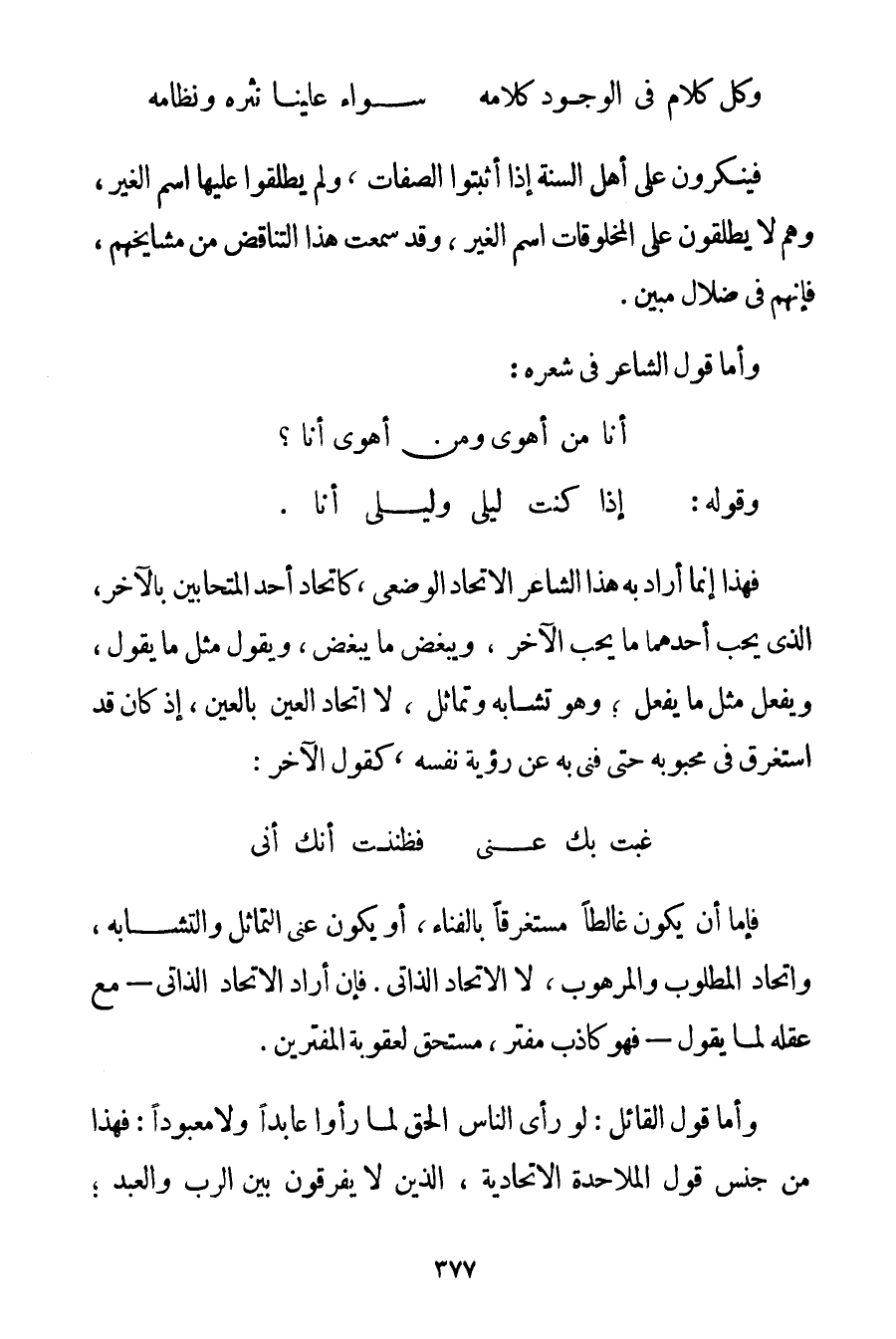 وَكُلُّ كَلَامٍ فِي الْوُجُودِ كَلَامُهُ سَوَاءٌ عَلَيْنَا نَثْرُهُ وَنِظَامُهُ فَيُنْكِرُونَ عَلَى أَهْلِ السُّنَّةِ إذَا أَثْبَتُوا الصِّفَاتِ وَلَمْ يُطْلِقُوا عَلَيْهَا اسْمَ الْغَيْرِ وَهُمْ لَا يُطْلِقُونَ عَلَى الْمَخْلُوقَاتِ اسْمَ الْغَيْرِ وَقَدْ سَمِعْت هَذَا التَّنَاقُضَ مِنْ مَشَايِخِهِمْ فَإِنَّهُمْ فِي ضَلَالٍ مُبِينٍ. وَأَمَّا قَوْل الشَّاعِرِ فِي شِعْرِهِ: أَنَا مَنْ أَهْوَى وَمَنْ أَهْوَى أَنَا؟ وَقَوْلُهُ: إذَا كُنْت لَيْلَى وَلَيْلَى أَنَا. فَهَذَا إنَّمَا أَرَادَ بِهِ هَذَا الشَّاعِرُ الِاتِّحَادَ الْوَضْعِيَّ كَاتِّحَادِ أَحَدِ الْمُتَحَابَّيْنِ بِالْآخَرِ الَّذِي يُحِبُّ أَحَدُهُمَا مَا يُحِبُّ الْآخَرَ وَيُبْغِضُ مَا يُبْغِضُ وَيَقُولُ مِثْلَ مَا يَقُولُ وَيَفْعَلُ مِثْلَ مَا يَفْعَلُ وَهُوَ تَشَابُهٌ وَتَمَاثُلٌ لَا اتِّحَادُ الْعَيْنِ بِالْعَيْنِ إذْ كَانَ قَدْ اسْتَغْرَقَ فِي مَحْبُوبِهِ حَتَّى فَنِيَ بِهِ عَنْ رُؤْيَةِ نَفْسِهِ كَقَوْلِ الْآخَرِ: غِبْت بِك عَنِّي فَظَنَنْت أَنَّك أَنِّي فَإِمَّا أَنْ يَكُونَ غالطا مُسْتَغْرِقًا بِالْفَنَاءِ أَوْ يَكُونُ عَنَى التَّمَاثُلَ وَالتَّشَابُهَ وَاتِّحَادَ الْمَطْلُوبِ وَالْمَرْهُوبِ لَا الِاتِّحَادَ الذَّاتِيَّ. فَإِنْ أَرَادَ الِاتِّحَادَ الذَّاتِيَّ - مَعَ عَقْلِهِ لِمَا يَقُولُ - فَهُوَ كَاذِبٌ مُفْتَرٍ مُسْتَحِقٌّ لِعُقُوبَةِ الْمُفْتَرِينَ. وَأَمَّا قَوْل الْقَائِلِ: لَوْ رَأَى النَّاسُ الْحَقَّ لَمَا رَأَوْا عَابِدًا وَلَا مَعْبُودًا: فَهَذَا مِنْ جِنْسِ قَوْلِ الْمَلَاحِدَةِ الِاتِّحَادِيَّةِ الَّذِينَ لَا يُفَرِّقُونَ بَيْنَ الرَّبِّ وَالْعَبْدِ؛
