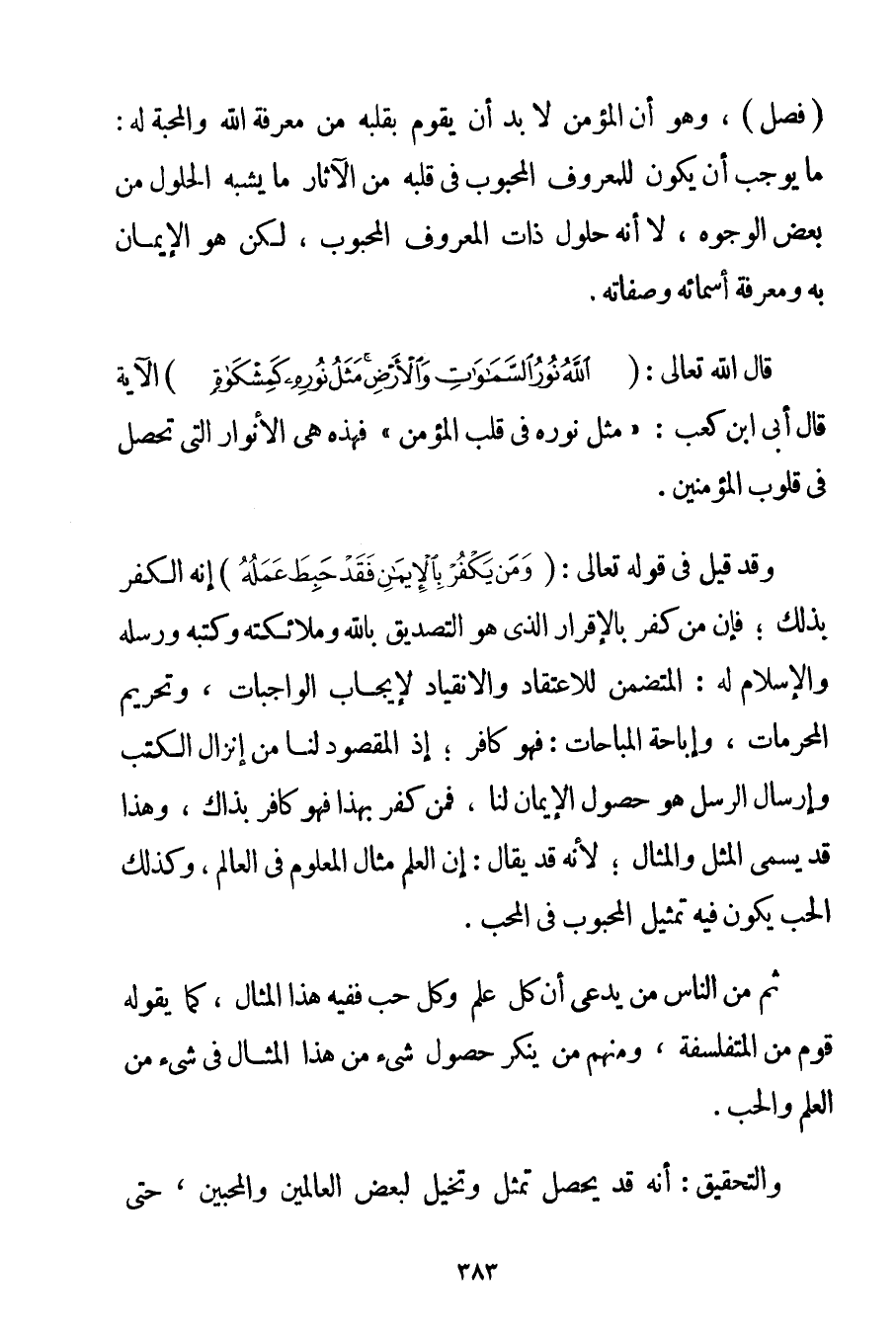 وَهُوَ أَنَّ الْمُؤْمِنَ لَا بُدَّ أَنْ يَقُومَ بِقَلْبِهِ مِنْ مَعْرِفَةِ اللَّهِ وَالْمَحَبَّةِ لَهُ: مَا يُوجِبُ أَنْ يَكُونَ لِلْمَعْرُوفِ الْمَحْبُوبِ فِي قَلْبِهِ مِنْ الْآثَارِ مَا يُشْبِهُ الْحُلُولَ مِنْ بَعْضِ الْوُجُوهِ لَا أَنَّهُ حُلُولُ ذَاتِ الْمَعْرُوفِ الْمَحْبُوبِ لَكِنْ هُوَ الْإِيمَانُ بِهِ وَمَعْرِفَةُ أَسْمَائِهِ وَصِفَاتِهِ. قَالَ اللَّهُ تَعَالَى. {نُورُ السَّمَاوَاتِ وَالْأَرْضِ مَثَلُ نُورِهِ كَمِشْكَاةٍ} الْآيَةَ قَالَ أبي بْنُ كَعْبٍ: " مَثَلُ نُورِهِ فِي قَلْبِ الْمُؤْمِنِ " فَهَذِهِ هِيَ الْأَنْوَارُ الَّتِي تَحْصُلُ فِي قُلُوبِ الْمُؤْمِنِينَ. وَقَدْ قِيلَ فِي قَوْله تَعَالَى {وَمَنْ يَكْفُرْ بِالْإِيمَانِ فَقَدْ حَبِطَ عَمَلُهُ} إنَّهُ الْكُفْرُ بِذَلِكَ؛ فَإِنَّ مَنْ كَفَرَ بِالْإِقْرَارِ الَّذِي هُوَ التَّصْدِيقُ بِاَللَّهِ وَمَلَائِكَتِهِ وَكُتُبِهِ وَرُسُلِهِ وَالْإِسْلَامُ لَهُ: الْمُتَضَمِّنُ لِلِاعْتِقَادِ وَالِانْقِيَادِ لِإِيجَابِ الْوَاجِبَاتِ وَتَحْرِيمِ الْمُحَرَّمَاتِ وَإِبَاحَةِ الْمُبَاحَاتِ: فَهُوَ كَافِرٌ؛ إذْ الْمَقْصُودُ لَنَا مِنْ إنْزَالِ الْكُتُبِ وَإِرْسَالِ الرُّسُلِ هُوَ حُصُولُ الْإِيمَانِ لَنَا فَمَنْ كَفَرَ بِهَذَا فَهُوَ كَافِرٌ بِذَاكَ وَهَذَا قَدْ يُسَمَّى الْمَثَلَ وَالْمِثَالَ؛ لِأَنَّهُ قَدْ يُقَالُ: إنَّ الْعِلْمَ مِثَالُ الْمَعْلُومِ فِي الْعَالَمِ وَكَذَلِكَ الْحُبُّ يَكُونُ فِيهِ تَمْثِيلُ الْمَحْبُوبِ فِي الْمُحِبِّ. ثُمَّ مِنْ النَّاسِ مَنْ يَدَّعِي أَنَّ كُلَّ عِلْمٍ وَكُلَّ حُبٍّ فَفِيهِ هَذَا الْمِثَالُ كَمَا يَقُولُهُ قَوْمٌ مِنْ الْمُتَفَلْسِفَةِ وَمِنْهُمْ مَنْ يُنْكِرُ حُصُولَ شَيْءٍ مِنْ هَذَا الْمِثَالِ فِي شَيْءٍ مِنْ الْعِلْمِ وَالْحُبِّ. وَالتَّحْقِيقُ: أَنَّهُ قَدْ يَحْصُلُ تَمَثُّلٌ وَتَخَيُّلٌ لِبَعْضِ الْعَالِمِينَ وَالْمُحِبِّينَ حَتَّى