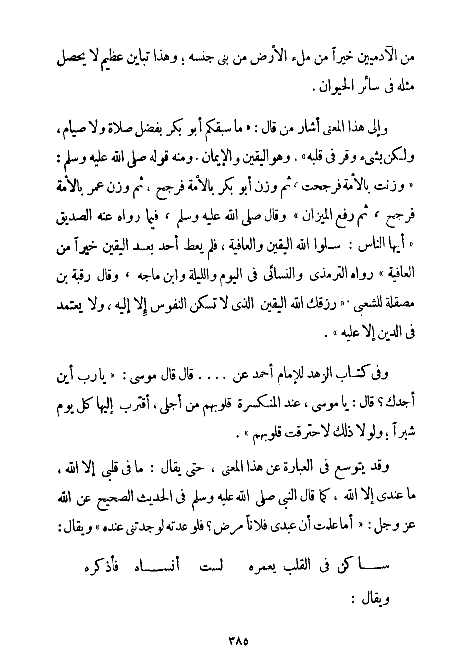 مِنْ الْآدَمِيِّينَ خَيْرًا مِنْ مِلْءِ الْأَرْضِ مِنْ بَنِي جِنْسِهِ؛ وَهَذَا تَبَايُنٌ عَظِيمٌ لَا يَحْصُلُ مِثْلُهُ فِي سَائِرِ الْحَيَوَانِ. وَإِلَى هَذَا الْمَعْنَى أَشَارَ مَنْ قَالَ: " مَا سَبَقَكُمْ أَبُو بَكْرٍ بِفَضْلِ صَلَاةٍ وَلَا صِيَامٍ وَلَكِنْ بِشَيْءِ وَقَرَ فِي قَلْبِهِ ". وَهُوَ الْيَقِينُ وَالْإِيمَانُ. وَمِنْهُ قَوْلُهُ صَلَّى اللَّهُ عَلَيْهِ وَسَلَّمَ {وُزِنْت بِالْأُمَّةِ فَرَجَحْت ثُمَّ وُزِنَ أَبُو بَكْرٍ بِالْأُمَّةِ فَرَجَحَ ثُمَّ وُزِنَ عُمَرُ بِالْأُمَّةِ فَرَجَحَ ثُمَّ رُفِعَ الْمِيزَانُ} وَقَالَ صَلَّى اللَّهُ عَلَيْهِ وَسَلَّمَ فِيمَا رَوَاهُ عَنْهُ الصِّدِّيقُ {أَيُّهَا النَّاسُ: سَلُوا اللَّهَ الْيَقِينَ وَالْعَافِيَةَ فَلَمْ يُعْطَ أَحَدٌ بَعْدَ الْيَقِينِ خَيْرًا مِنْ الْعَافِيَةِ} رَوَاهُ التِّرْمِذِيُّ وَالنَّسَائِي فِي الْيَوْمِ وَاللَّيْلَةِ وَابْنُ مَاجَه وَقَالَ رَقَبَةُ بْنُ مِصْقَلَةٍ لِلشَّعْبِيِّ: " رَزَقَك اللَّهُ الْيَقِينَ الَّذِي لَا تَسْكُنُ النُّفُوسُ إلَّا إلَيْهِ وَلَا يُعْتَمَدُ فِي الدِّينِ إلَّا عَلَيْهِ ". وَفِي كِتَابِ الزُّهْدِ لِلْإِمَامِ أَحْمَدَ عَنْ [سيار، وحدثنا جعفر، عن عمران القصير] (1) قَالَ {قَالَ مُوسَى: يَا رَبِّ أَيْنَ أَجِدُك؟ قَالَ: يَا مُوسَى عِنْدَ الْمُنْكَسِرَةِ قُلُوبُهُمْ مِنْ أَجْلِي أَقْتَرِبُ إلَيْهَا كُلَّ يَوْمٍ شِبْرًا؛ وَلَوْلَا ذَلِكَ لَاحْتَرَقَتْ قُلُوبُهُمْ} . وَقَدْ يُتَوَسَّعُ فِي الْعِبَارَةِ عَنْ هَذَا الْمَعْنَى حَتَّى يُقَالَ: مَا فِي قَلْبِي إلَّا اللَّهُ مَا عِنْدِي إلَّا اللَّهُ كَمَا {قَالَ النَّبِيُّ صَلَّى اللَّهُ عَلَيْهِ وَسَلَّمَ فِي الْحَدِيثِ الصَّحِيحِ عَنْ اللَّهِ عَزَّ وَجَلَّ: أَمَا عَلِمْت أَنَّ عَبْدِي فُلَانًا مَرِضَ؟ فَلَوْ عُدْته لَوَجَدْتنِي عِنْدَهُ} وَيُقَالُ: سَاكِنٌ فِي الْقَلْبِ يَعْمُرُهُ ... لَسْت أَنْسَاهُ فَأَذْكُرُهُ