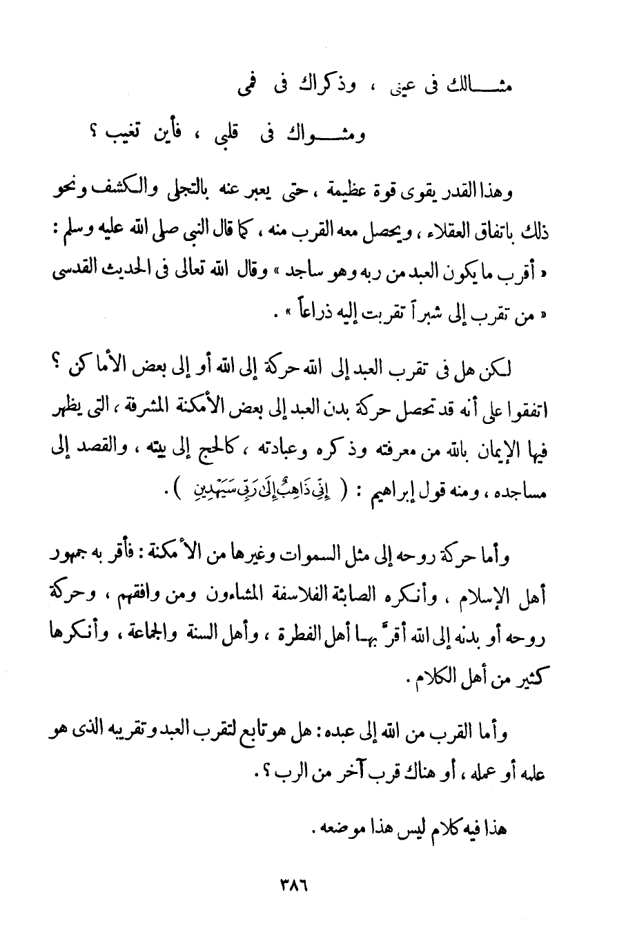 وَهَذَا الْقَدْرُ يَقْوَى قُوَّةً عَظِيمَةً حَتَّى يُعَبِّرَ عَنْهُ بِالتَّجَلِّي وَالْكَشْفِ وَنَحْوِ ذَلِكَ بِاتِّفَاقِ الْعُقَلَاءِ وَيَحْصُلُ مَعَهُ الْقُرْبُ مِنْهُ كَمَا قَالَ النَّبِيُّ صَلَّى اللَّهُ عَلَيْهِ وَسَلَّمَ {أَقْرَبُ مَا يَكُونُ الْعَبْدُ مِنْ رَبِّهِ وَهُوَ سَاجِدٌ} وَقَالَ اللَّهُ تَعَالَى فِي الْحَدِيثِ الْقُدْسِيِّ {مَنْ تَقَرَّبَ إلَيَّ شِبْرًا تَقَرَّبْت إلَيْهِ ذِرَاعًا} . لَكِنْ هَلْ فِي تَقَرُّبِ الْعَبْدِ إلَى اللَّهِ حَرَكَةٌ إلَى اللَّهِ أَوْ إلَى بَعْضِ الْأَمَاكِنِ؟ اتَّفَقُوا عَلَى أَنَّهُ قَدْ تَحْصُلُ حَرَكَةُ بَدَنِ الْعَبْدِ إلَى بَعْضِ الْأَمْكِنَةِ الْمُشْرِفَةِ الَّتِي يَظْهَرُ فِيهَا الْإِيمَانُ بِاَللَّهِ مِنْ مَعْرِفَتِهِ وَذِكْرِهِ وَعِبَادَتِهِ كَالْحَجِّ إلَى بَيْتِهِ وَالْقَصْدِ إلَى مَسَاجِدِهِ وَمِنْهُ قَوْلُ إبْرَاهِيمَ: {إنِّي ذَاهِبٌ إلَى رَبِّي سَيَهْدِينِ} . وَأَمَّا حَرَكَةُ رُوحِهِ إلَى مِثْلِ السَّمَوَاتِ وَغَيْرِهَا مِنْ الْأَمْكِنَةِ: فَأَقَرَّ بِهِ جُمْهُورُ أَهْلِ الْإِسْلَامِ وَأَنْكَرَهُ الصَّابِئَةُ الْفَلَاسِفَةُ الْمَشَّاءُونَ وَمَنْ وَافَقَهُمْ وَحَرَكَةُ رُوحِهِ أَوْ بَدَنِهِ إلَى اللَّهِ أَقَرَّ بِهَا أَهْلُ الْفِطْرَةِ وَأَهْلُ السُّنَّةِ وَالْجَمَاعَةِ وَأَنْكَرَهَا كَثِيرٌ مِنْ أَهْلِ الْكَلَامِ. وَأَمَّا الْقُرْبُ مِنْ اللَّهِ إلَى عَبْدِهِ: هَلْ هُوَ تَابِعٌ لِتُقَرِّبْ الْعَبْدِ وَتَقْرِيبِهِ الَّذِي هُوَ عِلْمُهُ أَوْ عَمَلُهُ أَوْ هُنَاكَ قُرْبٌ آخَرُ مِنْ الرَّبِّ؟ . هَذَا فِيهِ كَلَامٌ لَيْسَ هَذَا مَوْضِعَهُ.