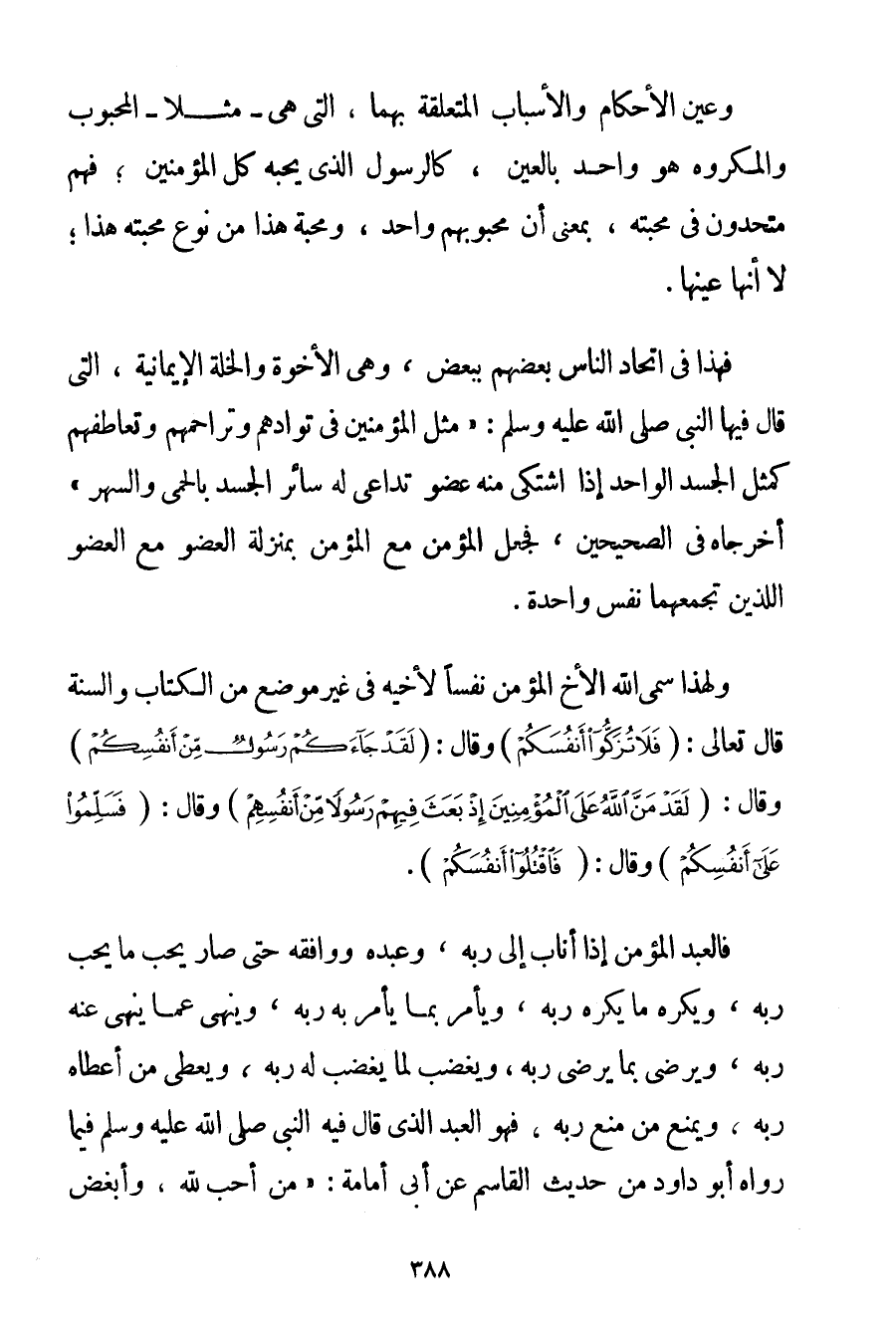 وَعَيْنُ الْأَحْكَامِ وَالْأَسْبَابِ الْمُتَعَلِّقَةِ بِهِمَا الَّتِي هِيَ - مَثَلًا - الْمَحْبُوبُ وَالْمَكْرُوهُ هُوَ وَاحِدٌ بِالْعَيْنِ كَالرَّسُولِ الَّذِي يُحِبُّهُ كُلُّ الْمُؤْمِنِينَ؛ فَهُمْ مُتَّحِدُونَ فِي مَحَبَّتِهِ بِمَعْنَى أَنَّ مَحْبُوبَهُمْ وَاحِدٌ وَمَحَبَّةُ هَذَا مِنْ نَوْعِ مَحَبَّتِهِ هَذَا؛ لَا أَنَّهَا عَيْنُهَا. فَهَذَا فِي اتِّحَادِ النَّاسِ بَعْضُهُمْ بِبَعْضِ وَهِيَ الْأُخُوَّةُ وَالْخُلَّةُ الْإِيمَانِيَّةُ الَّتِي قَالَ فِيهَا النَّبِيُّ صَلَّى اللَّهُ عَلَيْهِ وَسَلَّمَ {مَثَلُ الْمُؤْمِنِينَ فِي تَوَادِّهِمْ وَتَرَاحُمِهِمْ وَتَعَاطُفِهِمْ كَمَثَلِ الْجَسَدِ الْوَاحِدِ إذَا اشْتَكَى مِنْهُ عُضْوٌ تَدَاعَى لَهُ سَائِرُ الْجَسَدِ بِالْحُمَّى وَالسَّهَرِ} أَخْرَجَاهُ فِي الصَّحِيحَيْنِ فَجُعِلَ الْمُؤْمِنُ مَعَ الْمُؤْمِنِ بِمَنْزِلَةِ الْعُضْوِ مَعَ الْعُضْوِ اللَّذَيْنِ تَجْمَعُهُمَا نَفْسٌ وَاحِدَةٌ. وَلِهَذَا سَمَّى اللَّهُ الْأَخَ الْمُؤْمِنَ نَفْسًا لِأَخِيهِ فِي غَيْرِ مَوْضِعٍ مِنْ الْكِتَابِ وَالسُّنَّةِ قَالَ تَعَالَى: {فَلَا تُزَكُّوا أَنْفُسَكُمْ} وَقَالَ: {لَقَدْ جَاءَكُمْ رَسُولٌ مِنْ أَنْفُسِكُمْ} وَقَالَ: {لَقَدْ مَنَّ اللَّهُ عَلَى الْمُؤْمِنِينَ إذْ بَعَثَ فِيهِمْ رَسُولًا مِنْ أَنْفُسِهِمْ} وَقَالَ: {فَسَلِّمُوا عَلَى أَنْفُسِكُمْ} وَقَالَ: {فَاقْتُلُوا أَنْفُسَكُمْ} . فَالْعَبْدُ الْمُؤْمِنُ إذَا أَنَابَ إلَى رَبِّهِ وَعَبَدَهُ وَوَافَقَهُ حَتَّى صَارَ يُحِبُّ مَا يُحِبُّ رَبُّهُ وَيَكْرَهُ مَا يَكْرَهُ رَبُّهُ وَيَأْمُرُ بِمَا يَأْمُرُ بِهِ رَبُّهُ وَيَنْهَى عَمَّا يَنْهَى عَنْهُ رَبُّهُ وَيَرْضَى بِمَا يُرْضِي رَبَّهُ وَيَغْضَبُ لِمَا يَغْضَبُ لَهُ رَبُّهُ وَيُعْطِي مَنْ أَعْطَاهُ رَبُّهُ وَيَمْنَعُ مَنْ مَنَعَ رَبُّهُ فَهُوَ الْعَبْدُ الَّذِي قَالَ فِيهِ النَّبِيُّ صَلَّى اللَّهُ عَلَيْهِ وَسَلَّمَ فِيمَا رَوَاهُ أَبُو دَاوُد مِنْ حَدِيثِ الْقَاسِمِ عَنْ أَبِي أمامة: {مَنْ أَحَبَّ لِلَّهِ وَأَبْغَضَ