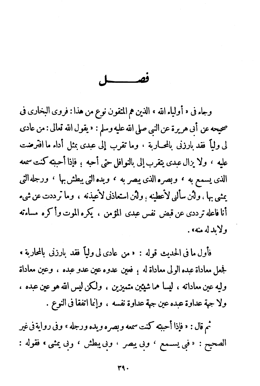 وَجَاءَ فِي " أَوْلِيَاءِ اللَّهِ " الَّذِينَ هُمْ الْمُتَّقُونَ نَوْعٌ مِنْ هَذَا: فَرَوَى الْبُخَارِيُّ فِي صَحِيحِهِ عَنْ أَبِي هُرَيْرَةَ عَنْ النَّبِيِّ صَلَّى اللَّهُ عَلَيْهِ وَسَلَّمَ {يَقُولُ اللَّهُ تَعَالَى: مَنْ عَادَى لِي وَلِيًّا فَقَدْ بَارَزَنِي بِالْمُحَارَبَةِ وَمَا تَقَرَّبَ إلَيَّ عَبْدِي بِمِثْلِ أَدَاءِ مَا افْتَرَضْت عَلَيْهِ وَلَا يَزَالُ عَبْدِي يَتَقَرَّبُ إلَيَّ بِالنَّوَافِلِ حَتَّى أُحِبَّهُ؛ فَإِذَا أَحْبَبْته كُنْت سَمْعَهُ الَّذِي يَسْمَعُ بِهِ وَبَصَرَهُ الَّذِي يُبْصِرُ بِهِ وَيَدَهُ الَّتِي يَبْطِشُ بِهَا وَرِجْلَهُ الَّتِي يَمْشِي بِهَا وَلَئِنْ سَأَلَنِي لَأُعْطِيَنَّهُ؛ وَلَئِنْ اسْتَعَاذَنِي لَأُعِيذَنهُ وَمَا تَرَدَّدْت عَنْ شَيْءٍ أَنَا فَاعِلُهُ تَرَدُّدِي عَنْ قَبْضِ نَفْسِ عَبْدِي الْمُؤْمِنِ يَكْرَهُ الْمَوْتَ وَأَكْرَهُ مَسَاءَتَهُ وَلَا بُدَّ لَهُ مِنْهُ} . فَأَوَّلُ مَا فِي الْحَدِيثِ قَوْلُهُ: {مَنْ عَادَى لِي وَلِيًّا فَقَدْ بَارَزَنِي بِالْمُحَارَبَةِ} فَجَعَلَ مُعَادَاةَ عَبْدِهِ الْوَلِيِّ مُعَادَاةً لَهُ؛ فَعَيْنُ عَدُوِّهِ عَيْنُ عَدُوِّ عَبْدِهِ وَعَيْنُ مُعَادَاةِ وَلَيِّهِ عَيْنُ مُعَادَاتِهِ لَيْسَا هُمَا شَيْئَيْنِ مُتَمَيِّزَيْنِ وَلَكِنْ لَيْسَ اللَّهُ هُوَ عَيْنُ عَبْدِهِ وَلَا جِهَةُ عَدَاوَةِ عَبْدِهِ عَيْنُ جِهَةِ عَدَاوَةِ نَفْسِهِ وَإِنَّمَا اتَّفَقَا فِي النَّوْعِ. ثُمَّ قَالَ: {فَإِذَا أَحْبَبْته كُنْت سَمْعَهُ وَبَصَرَهُ وَيَدَهُ وَرِجْلَهُ} وَفِي رِوَايَةٍ فِي غَيْرِ الصَّحِيحِ: {فَبِي يَسْمَعُ وَبِي يُبْصِرُ وَبِي يَبْطِشُ وَبِي يَمْشِي} فَقَوْلُهُ: