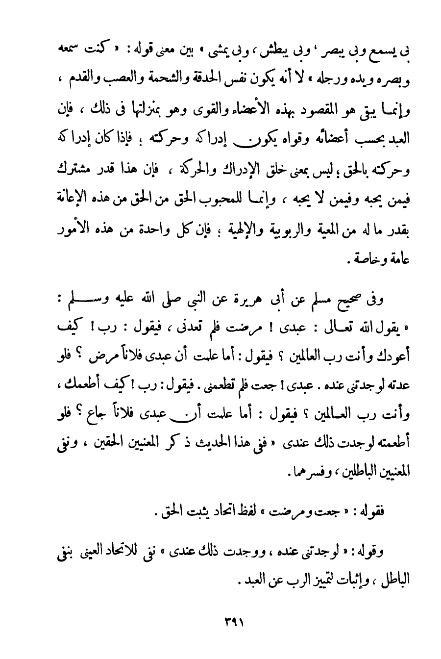 " بِي يَسْمَعُ وَبِي يُبْصِرُ وَبِي يَبْطِشُ وَبِي يَمْشِي " بَيْنَ مَعْنَى قَوْلِهِ: {كُنْت سَمْعَهُ وَبَصَرَهُ وَيَدَهُ وَرِجْلَهُ} لَا أَنَّهُ يَكُونُ نَفْسُ الْحَدَقَةِ وَالشَّحْمَةِ وَالْعَصَبِ وَالْقَدَمِ وَإِنَّمَا يَبْقَى هُوَ الْمَقْصُودُ بِهَذِهِ الْأَعْضَاءِ وَالْقُوَى وَهُوَ بِمَنْزِلَتِهَا فِي ذَلِكَ فَإِنَّ الْعَبْدَ بِحَسَبِ أَعْضَائِهِ وَقُوَاهُ يَكُونُ إدْرَاكُهُ وَحَرَكَتُهُ؛ فَإِذَا كَانَ إدْرَاكُهُ وَحَرَكَتُهُ بِالْحَقِّ؛ لَيْسَ بِمَعْنَى خَلْقِ الْإِدْرَاكِ وَالْحَرَكَةِ فَإِنَّ هَذَا قَدْرٌ مُشْتَرَكٌ فِيمَنْ يُحِبُّهُ وَفِيمَنْ لَا يُحِبُّهُ وَإِنَّمَا لِلْمَحْبُوبِ الْحَقُّ مِنْ الْحَقِّ مِنْ هَذِهِ الْإِعَانَةِ بِقَدْرِ مَا لَهُ مِنْ الْمَعِيَّةِ وَالرُّبُوبِيَّةِ وَالْإِلَهِيَّةِ؛ فَإِنَّ كُلَّ وَاحِدَةٍ مِنْ هَذِهِ الْأُمُورِ عَامَّةٌ وَخَاصَّةٌ. وَفِي صَحِيحِ مُسْلِمٍ عَنْ أَبِي هُرَيْرَةَ عَنْ النَّبِيِّ صَلَّى اللَّهُ عَلَيْهِ وَسَلَّمَ {يَقُولُ اللَّهُ تَعَالَى: عَبْدِي مَرِضْت فَلَمْ تَعُدْنِي فَيَقُولُ: رَبِّ كَيْفَ أَعُودُك وَأَنْتَ رَبُّ الْعَالَمِينَ؟ فَيَقُولُ: أَمَا عَلِمْت أَنَّ عَبْدِي فُلَانًا مَرِضَ؟ فَلَوْ عُدْته لَوَجَدْتنِي عِنْدَهُ. عَبْدِي جُعْت فَلَمْ تُطْعِمْنِي. فَيَقُولُ: رَبِّ كَيْفَ أُطْعِمُك وَأَنْتَ رَبُّ الْعَالَمِينَ؟ فَيَقُولُ: أَمَا عَلِمْت أَنَّ عَبْدِي فُلَانًا جَاعَ؟ فَلَوْ أَطْعَمْته لَوَجَدْت ذَلِكَ عِنْدِي} فَفِي هَذَا الْحَدِيثِ ذَكَرَ الْمَعْنَيَيْنِ الْحَقَّيْنِ وَنَفَى الْمَعْنَيَيْنِ الْبَاطِلَيْنِ وَفَسَّرَهُمَا. فَقَوْلُهُ: " جُعْت وَمَرِضْت " لَفْظُ اتِّحَادٍ يُثْبِتُ الْحَقَّ. وَقَوْلُهُ: {لَوَجَدْتنِي عِنْدَهُ وَوَجَدْت ذَلِكَ عِنْدِي} نَفْيٌ لِلِاتِّحَادِ الْعَيْنِيِّ بِنَفْيِ الْبَاطِلِ وَإِثْبَاتٌ لِتَمْيِيزِ الرَّبِّ عَنْ الْعَبْدِ.