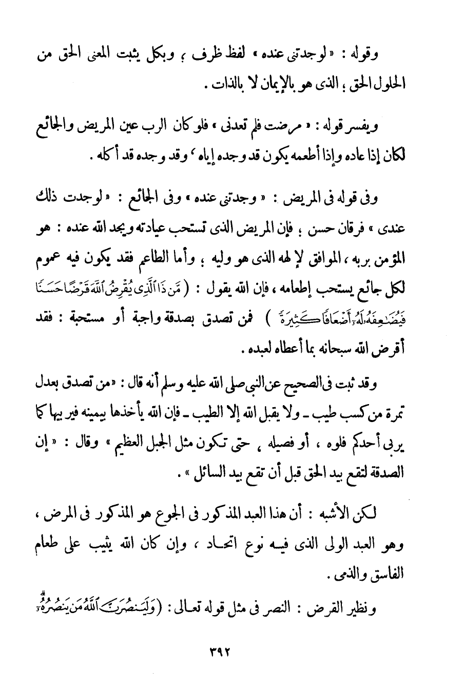 وَقَوْلُهُ: {لَوَجَدْتنِي عِنْدَهُ} لَفْظُ ظَرْفٍ؛ وَبِكُلِّ يَثْبُتُ الْمَعْنَى الْحَقُّ مِنْ الْحُلُولِ الْحَقِّ؛ الَّذِي هُوَ بِالْإِيمَانِ لَا بِالذَّاتِ. وَيُفَسَّرُ قَوْلُهُ: {مَرِضْت فَلَمْ تَعُدْنِي} فَلَوْ كَانَ الرَّبُّ عَيْنَ الْمَرِيضِ وَالْجَائِعِ لَكَانَ إذَا عَادَهُ وَإِذَا أَطْعَمَهُ يَكُونُ قَدْ وَجَدَهُ إيَّاهُ وَقَدْ وَجَدَهُ قَدْ أَكَلَهُ. وَفِي قَوْلِهِ فِي الْمَرِيضِ: {وَجَدْتنِي عِنْدَهُ} وَفِي الْجَائِعِ: {لَوَجَدْت ذَلِكَ عِنْدِي} فَرْقَانِ حَسَنٌ؛ فَإِنَّ الْمَرِيضَ الَّذِي تُسْتَحَبُّ عِيَادَتُهُ وَيَجِدُ اللَّهَ عِنْدَهُ: هُوَ الْمُؤْمِنُ بِرَبِّهِ الْمُوَافِقُ لِإِلَهِهِ الَّذِي هُوَ وَلِيُّهُ؛ وَأَمَّا الطَّاعِمُ فَقَدْ يَكُونُ فِيهِ عُمُومٌ لِكُلِّ جَائِعٍ يُسْتَحَبُّ إطْعَامُهُ فَإِنَّ اللَّهَ يَقُولُ: {مَنْ ذَا الَّذِي يُقْرِضُ اللَّهَ قَرْضًا حَسَنًا فَيُضَاعِفَهُ لَهُ أَضْعَافًا كَثِيرَةً} فَمَنْ تَصَدَّقَ بِصَدَقَةِ وَاجِبَةٍ أَوْ مُسْتَحَبَّةٍ: فَقَدْ أَقْرَضَ اللَّهَ سُبْحَانَهُ بِمَا أَعْطَاهُ لِعَبْدِهِ. وَقَدْ ثَبَتَ فِي الصَّحِيحِ عَنْ النَّبِيِّ صَلَّى اللَّهُ عَلَيْهِ وَسَلَّمَ أَنَّهُ قَالَ: {مَنْ تَصَدَّقَ بِعَدْلِ تَمْرَةٍ مِنْ كَسْبٍ طَيِّبٍ - وَلَا يَقْبَلُ اللَّهُ إلَّا الطِّيبَ - فَإِنَّ اللَّهَ يَأْخُذُهَا بِيَمِينِهِ فَيُرَبِّيهَا كَمَا يُرَبِّي أَحَدُكُمْ فَلُوَّهُ أَوْ فَصِيلَهُ حَتَّى تَكُونَ مِثْلَ الْجَبَلِ الْعَظِيمِ} وَقَالَ: {إنَّ الصَّدَقَةَ لَتَقَعُ بِيَدِ الْحَقِّ قَبْلَ أَنْ تَقَعَ بِيَدِ السَّائِلِ} . لَكِنَّ الْأَشْبَهَ: أَنَّ هَذَا الْعَبْدَ الْمَذْكُورَ فِي الْجُوعِ هُوَ الْمَذْكُورُ فِي الْمَرَضِ وَهُوَ الْعَبْدُ الْوَلِيُّ الَّذِي فِيهِ نَوْعُ اتِّحَادٍ وَإِنْ كَانَ اللَّهُ يُثِيبُ عَلَى طَعَامِ الْفَاسِقِ وَالذِّمِّيِّ. وَنَظِيرُ الْقَرْضِ: النَّصْرُ فِي مِثْلِ قَوْله تَعَالَى {وَلِيَعْلَمَ اللَّهُ مَن يَنصُرُهُ