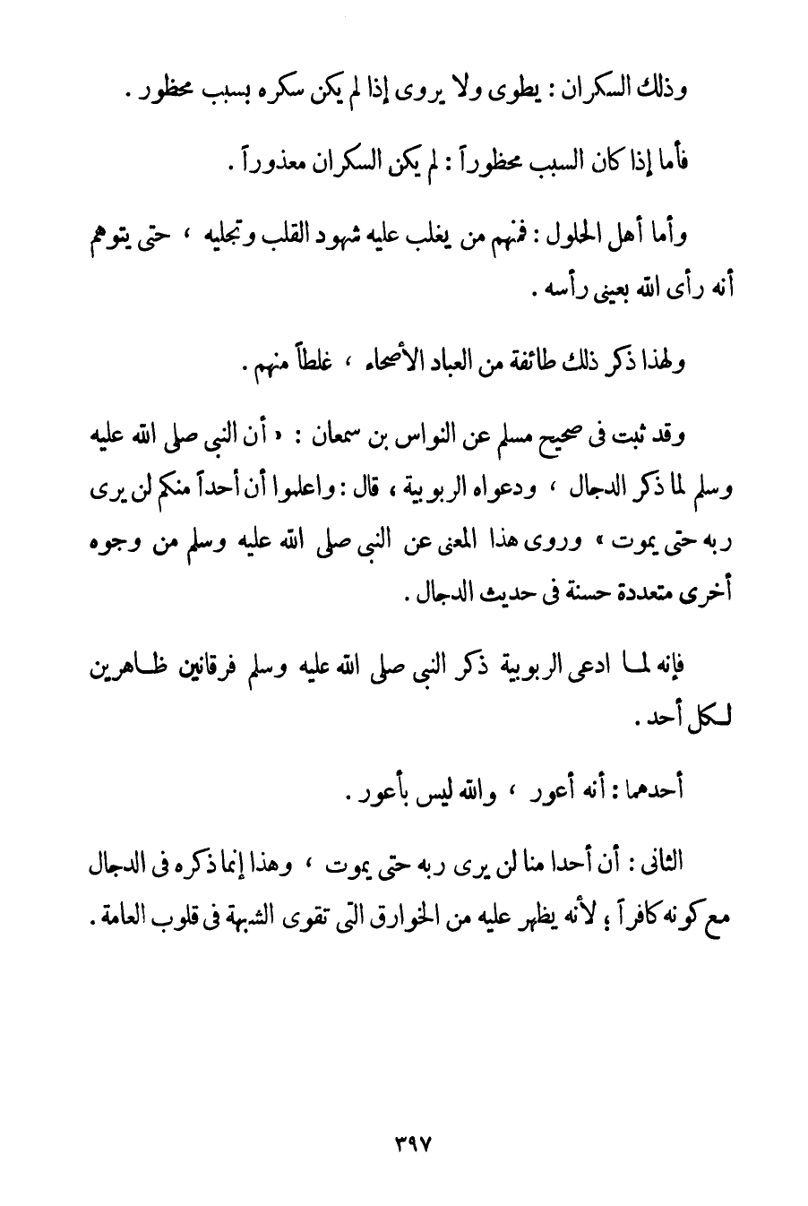 وَذَلِكَ السَّكْرَانُ: يُطْوَى وَلَا يُرْوَى إذَا لَمْ يَكُنْ سُكْرُهُ بِسَبَبِ مَحْظُورٍ. فَأَمَّا إذَا كَانَ السَّبَبُ مَحْظُورًا: لَمْ يَكُنْ السَّكْرَانُ مَعْذُورًا وَأَمَّا أَهْلُ الْحُلُولِ: فَمِنْهُمْ مَنْ يَغْلِبُ عَلَيْهِ شُهُودُ الْقَلْبِ وَتَجَلِّيه حَتَّى يَتَوَهَّمَ أَنَّهُ رَأَى اللَّهَ بِعَيْنَيْ رَأْسِهِ. وَلِهَذَا ذَكَرَ ذَلِكَ طَائِفَةٌ مِنْ الْعِبَادِ الْأَصِحَّاءِ غَلَطًا مِنْهُمْ وَقَدْ ثَبَتَ فِي صَحِيحِ مُسْلِمٍ عَنْ النُّوَاسِ بْنِ سَمْعَانَ: {أَنَّ النَّبِيَّ صَلَّى اللَّهُ عَلَيْهِ وَسَلَّمَ لَمَّا ذَكَرَ الدَّجَّالَ وَدَعْوَاهُ الرُّبُوبِيَّةَ قَالَ: وَاعْلَمُوا أَنَّ أَحَدًا مِنْكُمْ لَنْ يَرَى رَبَّهُ حَتَّى يَمُوتَ} وَرُوِيَ هَذَا الْمَعْنَى عَنْ النَّبِيِّ صَلَّى اللَّهُ عَلَيْهِ وَسَلَّمَ مِنْ وُجُوهٍ أُخْرَى مُتَعَدِّدَةٍ حَسَنَةٍ فِي حَدِيثِ الدَّجَّالِ. فَإِنَّهُ لَمَّا ادَّعَى الرُّبُوبِيَّةَ ذَكَرَ النَّبِيُّ صَلَّى اللَّهُ عَلَيْهِ وَسَلَّمَ فُرْقَانَيْنِ ظَاهِرَيْنِ لِكُلِّ أَحَدٍ أَحَدُهُمَا: أَنَّهُ أَعْوَرُ وَاَللَّهُ لَيْسَ بِأَعْوَرَ الثَّانِي: أَنَّ أَحَدًا مِنَّا لَنْ يَرَى رَبَّهُ حَتَّى يَمُوتَ وَهَذَا إنَّمَا ذَكَرَهُ فِي الدَّجَّالِ مَعَ كَوْنِهِ كَافِرًا؛ لِأَنَّهُ يَظْهَرُ عَلَيْهِ مِنْ الْخَوَارِقِ الَّتِي تُقَوِّي الشُّبْهَةَ فِي قُلُوبِ الْعَامَّةِ.