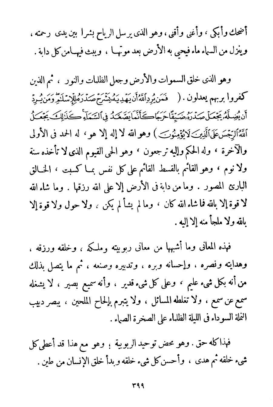 أَضْحَكَ وَأَبْكَى وَأَغْنَى وَأَقْنَى وَهُوَ الَّذِي يُرْسِلُ الرِّيَاحَ بُشْرًا بَيْنَ يَدَيْ رَحْمَتِهِ وَيُنَزِّلُ مِنْ السَّمَاءِ مَاءً فَيُحْيِي بِهِ الْأَرْضَ بَعْدَ مَوْتِهَا وَيَبُثُّ فِيهَا مِنْ كُلِّ دَابَّةٍ. وَهُوَ {الَّذِي خَلَقَ السَّمَاوَاتِ وَالْأَرْضَ وَجَعَلَ الظُّلُمَاتِ وَالنُّورَ ثُمَّ الَّذِينَ كَفَرُوا بِرَبِّهِمْ يَعْدِلُونَ} . {فَمَنْ يُرِدِ اللَّهُ أَنْ يَهدِيَهُ يَشْرَحْ صَدْرَهُ لِلْإِسْلَامِ وَمَنْ يُرِدْ أَنْ يُضِلَّهُ يَجْعَلْ صَدْرَهُ ضَيِّقًا حَرَجًا كَأَنَّمَا يَصَّعَّدُ فِي السَّمَاءِ كَذَلِكَ يَجْعَلُ اللَّهُ الرِّجْسَ عَلَى الَّذِينَ لَا يُؤْمِنُونَ} {وَهُوَ اللَّهُ لَا إلَهَ إلَّا هُوَ لَهُ الْحَمْدُ فِي الْأُولَى وَالْآخِرَةِ وَلَهُ الْحُكْمُ وَإِلَيْهِ تُرْجَعُونَ} وَهُوَ الْحَيُّ الْقَيُّومُ الَّذِي لَا تَأْخُذُهُ سِنَةٌ وَلَا نَوْمٌ وَهُوَ الْقَائِمُ بِالْقِسْطِ الْقَائِمِ عَلَى كُلِّ نَفْسٍ بِمَا كَسَبَتْ الْخَالِقُ الْبَارِئُ الْمُصَوِّرُ. {وَمَا مِنْ دَابَّةٍ فِي الْأَرْضِ إلَّا عَلَى اللَّهِ رِزْقُهَا} . وَمَا شَاءَ اللَّهُ لَا قُوَّةَ إلَّا بِاَللَّهِ فَمَا شَاءَ اللَّهُ كَانَ وَمَا لَمْ يَشَأْ لَمْ يَكُنْ وَلَا حَوْلَ وَلَا قُوَّةَ إلَّا بِاَللَّهِ وَلَا مَلْجَأَ مِنْهُ إلَّا إلَيْهِ. فَهَذِهِ الْمَعَانِي وَمَا أَشْبَهَهَا مِنْ مَعَانِي رُبُوبِيَّتِهِ وَمُلْكِهِ وَخَلْقِهِ وَرِزْقِهِ وَهِدَايَتِهِ وَنَصْرِهِ وَإِحْسَانِهِ وَبِرِّهِ وَتَدْبِيرِهِ وَصُنْعِهِ ثُمَّ مَا يَتَّصِلُ بِذَلِكَ مِنْ أَنَّهُ بِكُلِّ شَيْءٍ عَلِيمٌ وَعَلَى كُلِّ شَيْءٍ قَدِيرٌ وَأَنَّهُ سَمِيعٌ بَصِيرٌ لَا يَشْغَلُهُ سَمْعٌ عَنْ سَمْعٍ وَلَا تُغَلِّطُهُ الْمَسَائِلُ وَلَا يَتَبَرَّمُ بِإِلْحَاحِ الْمُلِحِّينَ يُبْصِرُ دَبِيبَ النَّمْلَةِ السَّوْدَاءِ فِي اللَّيْلَةِ الظَّلْمَاءِ عَلَى الصَّخْرَةِ الصَّمَّاءِ. فَهَذَا كُلُّهُ حَقٌّ. وَهُوَ مَحْضُ تَوْحِيدِ الرُّبُوبِيَّةِ؛ وَهُوَ مَعَ هَذَا قَدْ أَعْطَى كُلَّ شَيْءٍ خَلْقَهُ ثُمَّ هَدَى وَأَحْسَنَ كُلَّ شَيْءٍ خَلْقَهُ وَبَدَأَ خَلْقَ الْإِنْسَانِ مِنْ طِينٍ.